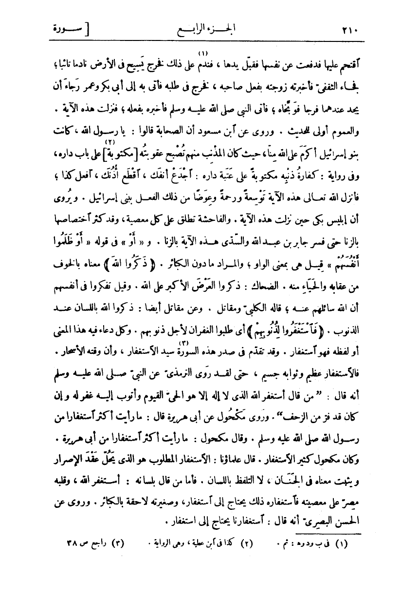 اقْتَحَمَ عَلَيْهَا فَدَفَعَتْ عَنْ نَفْسِهَا فَقَبَّلَ يَدَهَا، فَنَدِمَ «١» عَلَى ذَلِكَ فَخَرَجَ يَسِيحُ فِي الْأَرْضِ نَادِمًا تَائِبًا، فَجَاءَ الثَّقَفِيُّ فَأَخْبَرَتْهُ زَوْجَتُهُ بِفِعْلِ صَاحِبِهِ، فَخَرَجَ فِي طَلَبِهِ فَأَتَى بِهِ إِلَى أَبِي بَكْرٍ وَعُمْرَ رَجَاءَ أَنْ يَجِدَ عِنْدَهُمَا فَرَجًا فَوَبَّخَاهُ، فَأَتَى النَّبِيَّ صَلَّى اللَّهُ عَلَيْهِ وَسَلَّمَ فَأَخْبَرَهُ بِفِعْلِهِ، فَنَزَلَتْ هَذِهِ الْآيَةُ. وَالْعُمُومُ أَوْلَى لِلْحَدِيثِ. وَرُوِيَ عَنِ ابْنِ مَسْعُودٍ أَنَّ الصَّحَابَةَ قَالُوا: يَا رَسُولَ اللَّهِ، كَانَتْ بَنُو إِسْرَائِيلَ أَكْرَمَ عَلَى اللَّهِ مِنَّا، حَيْثُ كَانَ الْمُذْنِبُ مِنْهُمْ تُصْبِحُ عُقُوبَتُهُ [مَكْتُوبَةً] «٢» عَلَى بَابِ دَارِهِ، وَفِي رِوَايَةٍ: كَفَّارَةُ ذَنْبِهِ مَكْتُوبَةٌ عَلَى عَتَبَةِ دَارِهِ: اجْدَعْ أَنْفَكَ، اقْطَعْ أُذُنَكَ، افْعَلْ كَذَا، فَأَنْزَلَ اللَّهُ تَعَالَى هَذِهِ الْآيَةَ تَوْسِعَةً وَرَحْمَةً وَعِوَضًا مِنْ ذَلِكَ الْفِعْلِ بِبَنِي إِسْرَائِيلَ. وَيُرْوَى أَنَّ إِبْلِيسَ بَكَى حِينَ نَزَلَتْ هَذِهِ الْآيَةُ. وَالْفَاحِشَةُ تُطْلَقُ عَلَى كُلِّ مَعْصِيَةٍ، وَقَدْ كَثُرَ اخْتِصَاصُهَا بِالزِّنَا حَتَّى فَسَّرَ جَابِرُ بْنُ عَبْدِ اللَّهِ وَالسُّدِّيُّ هَذِهِ الْآيَةَ بِالزِّنَا. وَ" أَوْ" فِي قَوْلِهِ:" أَوْ ظَلَمُوا أَنْفُسَهُمْ" قِيلَ هِيَ بِمَعْنَى الْوَاوِ، وَالْمُرَادُ مَا دُونَ الْكَبَائِرِ. (ذَكَرُوا اللَّهَ) مَعْنَاهُ بِالْخَوْفِ مِنْ عِقَابِهِ وَالْحَيَاءِ مِنْهُ. الضَّحَّاكُ: ذَكَرُوا الْعَرْضَ الْأَكْبَرَ عَلَى اللَّهِ. وَقِيلَ تَفَكَّرُوا فِي أَنْفُسِهِمْ أَنَّ اللَّهَ سَائِلُهُمْ عَنْهُ، قَالَهُ الْكَلْبِيُّ وَمُقَاتِلٌ. وَعَنْ مُقَاتِلٍ أَيْضًا: ذَكَرُوا اللَّهَ بِاللِّسَانِ عِنْدَ الذُّنُوبِ. (فَاسْتَغْفَرُوا لِذُنُوبِهِمْ) أَيْ طَلَبُوا الْغُفْرَانَ لِأَجْلِ ذُنُوبِهِمْ. وَكُلُّ دُعَاءٍ فِيهِ هَذَا الْمَعْنَى أَوْ لَفْظُهُ فَهُوَ اسْتِغْفَارٌ. وَقَدْ تَقَدَّمَ فِي صَدْرِ هَذِهِ السُّورَةِ «٣» سَيِّدُ الِاسْتِغْفَارِ، وَأَنَّ وَقْتَهُ الْأَسْحَارُ. فَالِاسْتِغْفَارُ عَظِيمٌ وَثَوَابُهُ جَسِيمٌ، حَتَّى لَقَدْ رَوَى التِّرْمِذِيُّ عَنِ النَّبِيِّ صَلَّى اللَّهُ عَلَيْهِ وَسَلَّمَ أَنَّهُ قَالَ: (مَنْ قَالَ أَسْتَغْفِرُ اللَّهَ الَّذِي لَا إِلَهَ إِلَّا هُوَ الْحَيَّ الْقَيُّومَ وَأَتُوبُ إِلَيْهِ غُفِرَ لَهُ. وَإِنْ كَانَ قَدْ فَرَّ مِنَ الزَّحْفِ (. وَرَوَى مَكْحُولٌ عَنْ أَبِي هُرَيْرَةَ قَالَ: مَا رَأَيْتُ أَكْثَرَ اسْتِغْفَارًا مِنْ رَسُولِ اللَّهِ صَلَّى اللَّهُ عَلَيْهِ وَسَلَّمَ. وَقَالَ مَكْحُولٌ: مَا رَأَيْتُ أَكْثَرَ اسْتِغْفَارًا مِنْ أَبِي هُرَيْرَةَ. وَكَانَ مَكْحُولٌ كَثِيرَ الِاسْتِغْفَارِ. قَالَ عُلَمَاؤُنَا: الِاسْتِغْفَارُ الْمَطْلُوبُ هُوَ الَّذِي يَحُلُّ عُقَدَ الْإِصْرَارِ وَيَثْبُتُ مَعْنَاهُ فِي الْجَنَانِ، لَا التَّلَفُّظُ بِاللِّسَانِ. فَأَمَّا مَنْ قَالَ بِلِسَانِهِ: أَسْتَغْفِرُ اللَّهَ، وَقَلْبُهُ مُصِرٌّ عَلَى مَعْصِيَتِهِ فَاسْتِغْفَارُهُ ذَلِكَ يَحْتَاجُ إِلَى اسْتِغْفَارٍ، وَصَغِيرَتُهُ لَاحِقَةٌ بِالْكَبَائِرِ. وَرُوِيَ عَنِ الْحَسَنِ الْبَصْرِيِّ أَنَّهُ قَالَ: اسْتِغْفَارُنَا يحتاج إلى استغفار.