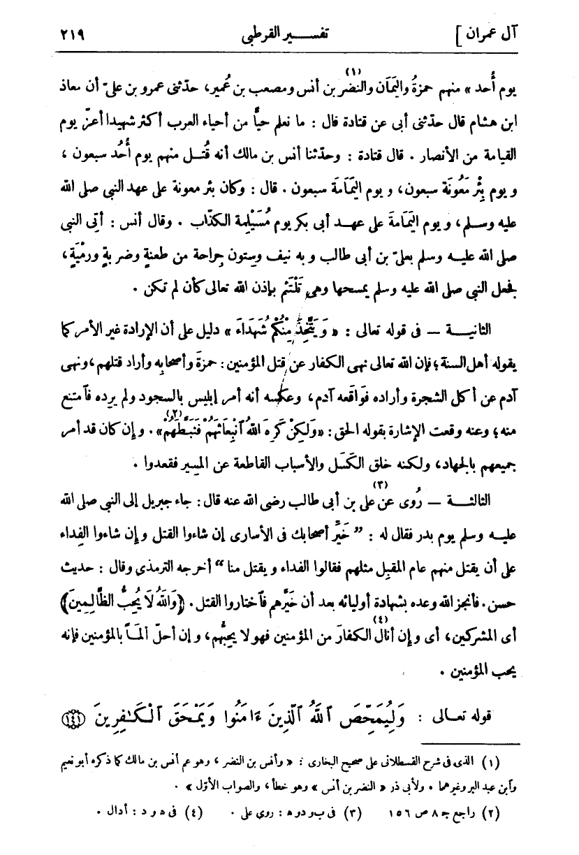 يَوْمَ أُحُدٍ" مِنْهُمْ حَمْزَةُ وَالْيَمَانُ وَالنَّضْرُ «١» بْنُ أَنَسٍ وَمُصْعَبُ بْنُ عُمَيْرٍ، حَدَّثَنِي عَمْرُو بْنُ علي أن معاذ ابن هِشَامٍ قَالَ حَدَّثَنِي أَبِي عَنْ قَتَادَةَ قَالَ: مَا نَعْلَمُ حَيًّا مِنْ أَحْيَاءِ الْعَرَبِ أَكْثَرَ شَهِيدًا أَعَزَّ يَوْمَ الْقِيَامَةِ مِنَ الْأَنْصَارِ. قَالَ قَتَادَةُ: وَحَدَّثَنَا أَنَسُ بْنُ مَالِكٍ أَنَّهُ قُتِلَ مِنْهُمْ يَوْمَ أُحُدٍ سَبْعُونَ، وَيَوْمَ بِئْرِ مَعُونَةَ سَبْعُونَ، وَيَوْمَ الْيَمَامَةِ سَبْعُونَ. قَالَ: وَكَانَ بِئْرُ مَعُونَةَ عَلَى عَهْدِ النَّبِيِّ صَلَّى اللَّهُ عَلَيْهِ وَسَلَّمَ، وَيَوْمُ الْيَمَامَةِ عَلَى عَهْدِ أَبِي بَكْرٍ يَوْمَ مُسَيْلِمَةَ الْكَذَّابِ. وَقَالَ أَنَسٌ: أُتِيَ النَّبِيُّ صَلَّى اللَّهُ عَلَيْهِ وَسَلَّمَ بِعَلِيِّ بْنِ أَبِي طَالِبٍ وَبِهِ نَيِّفٌ وَسِتُّونَ جِرَاحَةً مِنْ طَعْنَةٍ وَضَرْبَةٍ وَرَمْيَةٍ، فَجَعَلَ النَّبِيُّ صَلَّى اللَّهُ عَلَيْهِ وَسَلَّمَ يَمْسَحُهَا وَهِيَ تَلْتَئِمُ بِإِذْنِ اللَّهِ تَعَالَى كَأَنْ لَمْ تَكُنْ. الثَّانِيَةُ- فِي قَوْلِهِ تَعَالَى:" وَيَتَّخِذَ مِنْكُمْ شُهَداءَ" دَلِيلٌ عَلَى أَنَّ الْإِرَادَةَ غير الامر كما يقوله أهل السنة، إن اللَّهَ تَعَالَى نَهَى الْكُفَّارَ عَنْ قَتْلِ الْمُؤْمِنِينَ: حَمْزَةَ وَأَصْحَابِهِ وَأَرَادَ قَتْلَهُمْ، وَنَهَى آدَمَ عَنْ أَكْلِ الشَّجَرَةِ وَأَرَادَهُ فَوَاقَعَهُ آدَمُ، وَعَكْسُهُ أَنَّهُ أَمَرَ إِبْلِيسَ بِالسُّجُودِ وَلَمْ يُرِدْهُ فَامْتَنَعَ مِنْهُ، وَعَنْهُ وَقَعَتِ الْإِشَارَةُ بِقَوْلِهِ الْحَقِّ:" وَلكِنْ كَرِهَ اللَّهُ انْبِعاثَهُمْ فَثَبَّطَهُمْ «٢» ". وَإِنْ كَانَ قَدْ أَمَرَ جَمِيعَهُمْ بِالْجِهَادِ، وَلَكِنَّهُ خَلَقَ الْكَسَلَ وَالْأَسْبَابَ الْقَاطِعَةَ عَنِ الْمَسِيرِ فَقَعَدُوا. الثَّالِثَةُ- رُوِيَ عَنْ عَلِيِّ «٣»؟ بْنِ أَبِي طَالِبٍ رَضِيَ اللَّهُ عَنْهُ قَالَ: جَاءَ جِبْرِيلُ إِلَى النَّبِيِّ صَلَّى اللَّهُ عَلَيْهِ وَسَلَّمَ يَوْمَ بَدْرٍ فَقَالَ لَهُ: (خَيِّرْ أَصْحَابَكَ فِي الْأُسَارَى إِنْ شَاءُوا الْقَتْلَ وَإِنْ شَاءُوا الْفِدَاءَ عَلَى أَنْ يُقْتَلَ مِنْهُمْ عَامَ الْمُقْبِلِ مِثْلُهُمْ فَقَالُوا الْفِدَاءَ وَيُقْتَلُ مِنَّا) أَخْرَجَهُ التِّرْمِذِيُّ وَقَالَ: حَدِيثٌ حَسَنٌ. فَأَنْجَزَ اللَّهُ وَعْدَهُ بِشَهَادَةِ أَوْلِيَائِهِ بَعْدَ أَنْ خَيَّرَهُمْ فَاخْتَارُوا الْقَتْلَ. (وَاللَّهُ لَا يُحِبُّ الظَّالِمِينَ) أَيِ الْمُشْرِكِينَ، أَيْ وَإِنْ أَنَالَ «٤» الْكُفَّارَ مِنَ الْمُؤْمِنِينَ فَهُوَ لَا يُحِبُّهُمْ، وَإِنْ أَحَلَّ أَلَمًا بِالْمُؤْمِنِينَ فَإِنَّهُ يُحِبُّ الْمُؤْمِنِينَ.