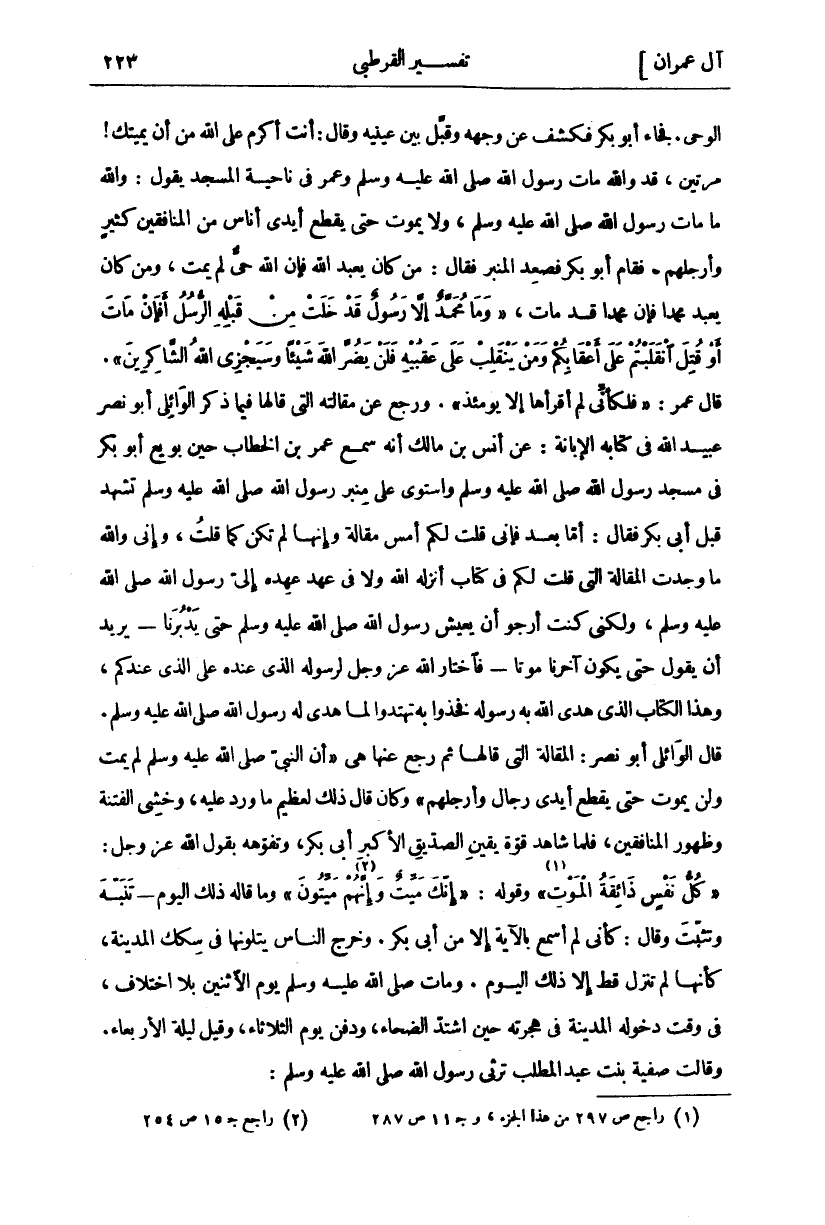 الْوَحْيِ. فَجَاءَ أَبُو بَكْرٍ فَكَشَفَ عَنْ وَجْهِهِ وَقَبَّلَ بَيْنَ عَيْنَيْهِ وَقَالَ: أَنْتَ أَكْرَمُ عَلَى اللَّهِ مِنْ أَنْ يُمِيتَكَ! مَرَّتَيْنِ. قَدْ وَاللَّهِ مَاتَ رَسُولُ اللَّهِ صَلَّى اللَّهُ عَلَيْهِ وَسَلَّمَ وَعُمْرُ فِي نَاحِيَةِ الْمَسْجِدِ يَقُولُ: وَاللَّهِ مَا مَاتَ رَسُولُ اللَّهِ صَلَّى اللَّهُ عَلَيْهِ وَسَلَّمَ، وَلَا يَمُوتُ حَتَّى يَقْطَعَ أَيْدِيَ أُنَاسٍ مِنَ المنافقين كثير وأرحلهم. فَقَامَ أَبُو بَكْرٍ فَصَعِدَ الْمِنْبَرَ فَقَالَ: مَنْ كَانَ يَعْبُدُ اللَّهَ فَإِنَّ اللَّهَ حَيٌّ لَمْ يَمُتْ، وَمَنْ كَانَ يَعْبُدُ مُحَمَّدًا فَإِنَّ مُحَمَّدًا قَدْ مَاتَ،" وَما مُحَمَّدٌ إِلَّا رَسُولٌ قَدْ خَلَتْ مِنْ قَبْلِهِ الرُّسُلُ أَفَإِنْ ماتَ أَوْ قُتِلَ انْقَلَبْتُمْ عَلى أَعْقابِكُمْ وَمَنْ يَنْقَلِبْ عَلى عَقِبَيْهِ فَلَنْ يَضُرَّ اللَّهَ شَيْئاً وَسَيَجْزِي اللَّهُ الشَّاكِرِينَ". قَالَ عُمَرُ:" فَلَكَأَنِّي لَمْ أَقْرَأْهَا إِلَّا يَوْمَئِذٍ". وَرَجَعَ عَنْ مَقَالَتِهِ الَّتِي قَالَهَا فِيمَا ذَكَرَ الْوَائِلِيُّ أَبُو نَصْرٍ عُبَيْدُ اللَّهِ فِي كِتَابِهِ الْإِبَانَةِ: عَنْ أَنَسِ بْنِ مَالِكٍ أَنَّهُ سَمِعَ عُمَرَ بْنَ الْخَطَّابِ حِينَ بُويِعَ أَبُو بَكْرٍ فِي مَسْجِدِ رَسُولِ اللَّهِ صَلَّى اللَّهُ عَلَيْهِ وَسَلَّمَ وَاسْتَوَى عَلَى مِنْبَرِ رَسُولِ اللَّهِ صَلَّى اللَّهُ عَلَيْهِ وَسَلَّمَ تَشَهَّدَ قَبْلَ أَبِي بَكْرٍ فَقَالَ: أَمَّا بَعْدُ فَإِنِّي قُلْتُ لَكُمْ أَمْسِ مَقَالَةً وَإِنَّهَا لَمْ تَكُنْ كَمَا قُلْتُ، وَإِنِّي وَاللَّهِ مَا وَجَدْتُ الْمَقَالَةَ الَّتِي قُلْتُ لَكُمْ فِي كِتَابٍ أَنْزَلَهُ اللَّهُ وَلَا فِي عَهْدٍ عَهِدَهُ إِلَى رَسُولِ اللَّهِ صَلَّى اللَّهُ عَلَيْهِ وَسَلَّمَ، وَلَكِنِّي كُنْتُ أَرْجُو أَنْ يَعِيشَ رَسُولُ اللَّهِ صَلَّى اللَّهُ عَلَيْهِ وَسَلَّمَ حَتَّى يَدْبُرَنَا- يُرِيدُ أَنْ يَقُولَ حَتَّى يَكُونَ آخِرَنَا مَوْتًا- فَاخْتَارَ اللَّهُ عَزَّ وَجَلَّ لِرَسُولِهِ الَّذِي عِنْدَهُ عَلَى الَّذِي عِنْدَكُمْ، وَهَذَا الْكِتَابُ الَّذِي هَدَى اللَّهُ بِهِ رَسُولَهُ فَخُذُوا بِهِ تَهْتَدُوا لِمَا هُدِيَ لَهُ رَسُولُ اللَّهِ صَلَّى اللَّهُ عَلَيْهِ وَسَلَّمَ. قَالَ الْوَائِلِيُّ أَبُو: نَصْرٍ الْمَقَالَةُ الَّتِي قَالَهَا ثُمَّ رَجَعَ عَنْهَا هِيَ" أَنَّ النَّبِيَّ صَلَّى اللَّهُ عَلَيْهِ وَسَلَّمَ لَمْ يَمُتْ وَلَنْ يَمُوتَ حَتَّى يَقْطَعَ أَيْدِيَ رِجَالٍ وَأَرْجُلَهُمْ" وَكَانَ قَالَ ذَلِكَ لِعَظِيمِ مَا وَرَدَ عَلَيْهِ، وَخَشِيَ الْفِتْنَةَ وَظُهُورَ الْمُنَافِقِينَ، فَلَمَّا شَاهَدَ قُوَّةَ يَقِينِ الصِّدِّيقِ الْأَكْبَرِ أَبِي بَكْرٍ، وَتَفَوُّهَهُ بِقَوْلِ اللَّهِ عَزَّ وَجَلَّ:" كُلُّ نَفْسٍ ذائِقَةُ الْمَوْتِ" [آل عمران: ١٨٥] «١» وقوله:" إِنَّكَ مَيِّتٌ وَإِنَّهُمْ «٢» مَيِّتُونَ" [الزمر: ٣٠] وما قاله ذلك اليوم- تنبه وَتَثْبِيتٌ وَقَالَ: كَأَنِّي لَمْ أَسْمَعْ بِالْآيَةِ إِلَّا مِنْ أَبِي بَكْرٍ. وَخَرَجَ النَّاسُ يَتْلُونَهَا فِي سِكَكِ الْمَدِينَةِ، كَأَنَّهَا لَمْ تَنْزِلْ قَطُّ إِلَّا ذَلِكَ الْيَوْمَ. وَمَاتَ صَلَّى اللَّهُ عَلَيْهِ وَسَلَّمَ يَوْمَ الِاثْنَيْنِ بِلَا اخْتِلَافٍ، فِي وَقْتِ دُخُولِهِ الْمَدِينَةَ فِي هِجْرَتِهِ حِينَ اشْتَدَّ الضَّحَاءُ، وَدُفِنَ يَوْمَ الثُّلَاثَاءِ، وَقِيلَ لَيْلَةَ الْأَرْبِعَاءِ. وَقَالَتْ صَفِيَّةُ بِنْتُ عَبْدِ الْمُطَّلِبِ تَرْثِي رَسُولَ اللَّهِ صَلَّى اللَّهُ عَلَيْهِ وَسَلَّمَ: