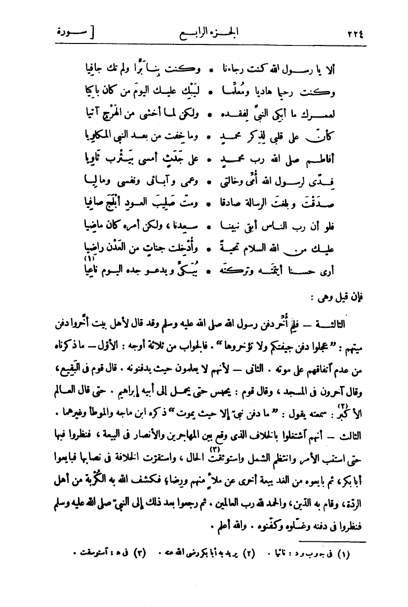 أَفَاطِمَ صَلَّى اللَّهُ رَبُّ مُحَمَّدٍ ... عَلَى جَدَثٍ أَمْسَى بِيَثْرِبَ ثَاوِيَا