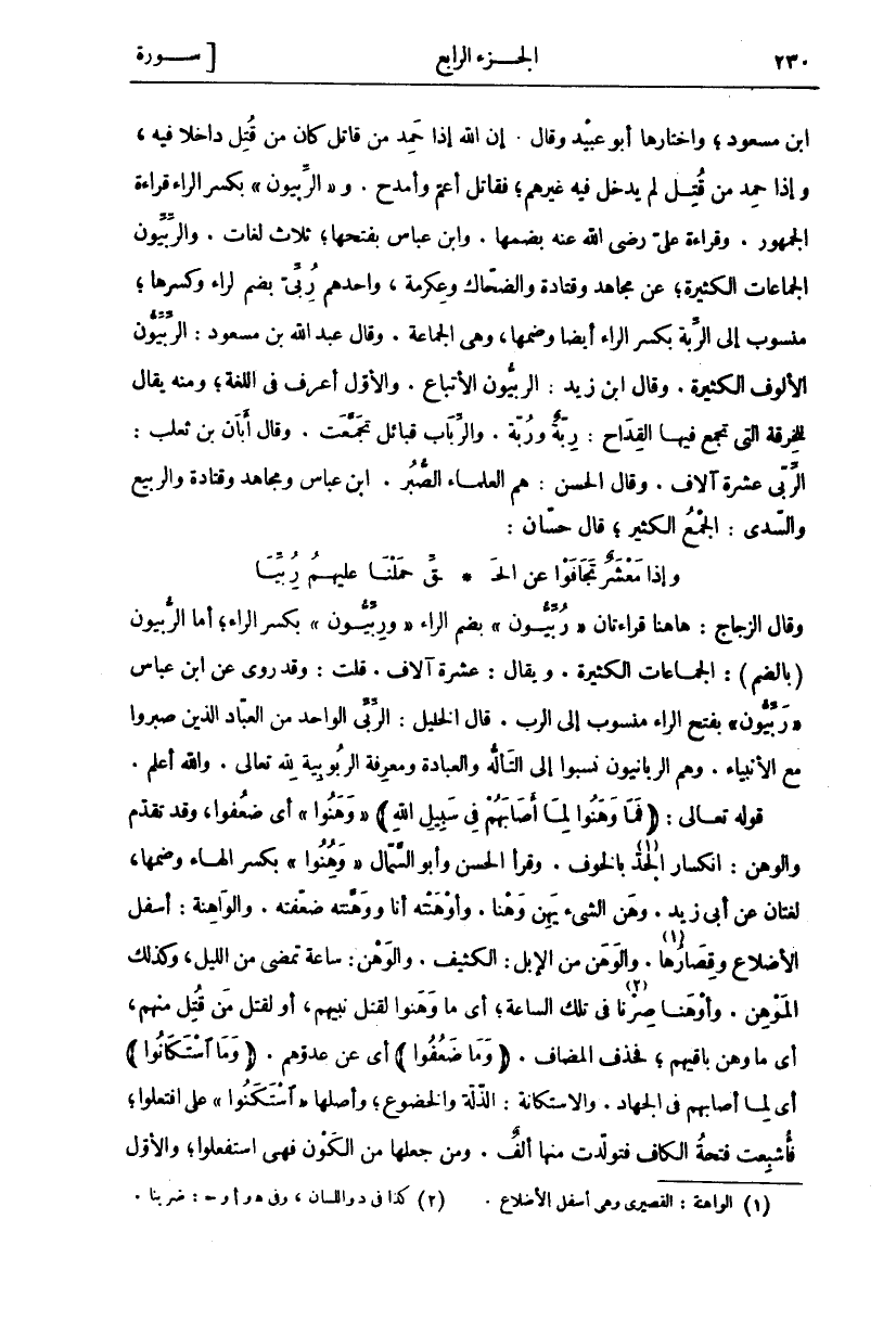 وقال الزجاج: ها هنا قراءتان" رِبِّيُّونَ" بضم الراء- و" رِبِّيُّونَ" بِكَسْرِ الرَّاءِ، أَمَّا الرُّبِّيُّونَ (بِالضَّمِّ): الْجَمَاعَاتُ الْكَثِيرَةُ. وَيُقَالُ: عَشْرَةُ آلَافٍ. قُلْتُ: وَقَدْ رُوِيَ عَنِ ابْنِ عَبَّاسٍ" رِبِّيُّونَ" بِفَتْحِ الرَّاءِ مَنْسُوبٌ إِلَى الرَّبِّ. قَالَ الْخَلِيلُ: الرِّبِّيُّ الْوَاحِدُ مِنَ الْعُبَّادِ الَّذِينَ صَبَرُوا مَعَ الْأَنْبِيَاءِ. وَهُمُ الرَّبَّانِيُّونَ نُسِبُوا إِلَى التَّأَلُّهِ وَالْعِبَادَةِ وَمَعْرِفَةِ الرُّبُوبِيَّةِ لِلَّهِ تَعَالَى. وَاللَّهُ أَعْلَمُ. قَوْلُهُ تَعَالَى: (فَما وَهَنُوا لِما أَصابَهُمْ فِي سَبِيلِ اللَّهِ) " وَهَنُوا" أَيْ ضَعُفُوا، وَقَدْ تَقَدَّمَ وَالْوَهْنُ: انْكِسَارُ الْجِدِّ «١» بِالْخَوْفِ. وَقَرَأَ الحسن وأبو الْحَسَنُ وَأَبُو السَّمَّالِ" وَهَنُوا" بِكَسْرِ الْهَاءِ وَضَمِّهَا، لُغَتَانِ عَنْ أَبِي زَيْدٍ. وَهَنَ الشَّيْءُ يَهِنُ وَهْنًا. وَأَوْهَنْتُهُ أَنَا وَوَهَّنْتُهُ ضَعَّفْتُهُ. وَالْوَاهِنَةُ: أَسْفَلُ الْأَضْلَاعِ وَقِصَارُهَا «٢». وَالْوَهَنُ مِنَ الْإِبِلِ: الْكَثِيفُ. وَالْوَهْنُ: سَاعَةٌ تَمْضِي مِنَ اللَّيْلِ، وَكَذَلِكَ الْمَوْهِنُ. وَأَوْهَنَّا صِرْنَا «٣» فِي تِلْكَ السَّاعَةِ، أَيْ مَا وَهَنُوا لِقَتْلِ نَبِيِّهِمْ، أَوْ لِقَتْلِ مَنْ قُتِلَ مِنْهُمْ، أَيْ مَا وَهَنَ بَاقِيهُمْ، فَحَذَفَ الْمُضَافَ. (وَما ضَعُفُوا) أَيْ عَنْ عَدُوِّهِمْ. (وَمَا اسْتَكانُوا) أَيْ لِمَا أَصَابَهُمْ فِي الْجِهَادِ. وَالِاسْتِكَانَةُ: الذِّلَّةُ وَالْخُضُوعُ، وَأَصْلُهَا" اسْتَكَنُوا" عَلَى افْتَعَلُوا، فَأُشْبِعَتْ فَتْحَةُ الْكَافِ فَتَوَلَّدَتْ مِنْهَا أَلِفٌ. وَمَنْ جَعَلَهَا مِنَ الْكَوْنِ فهي استفعلوا، والأول