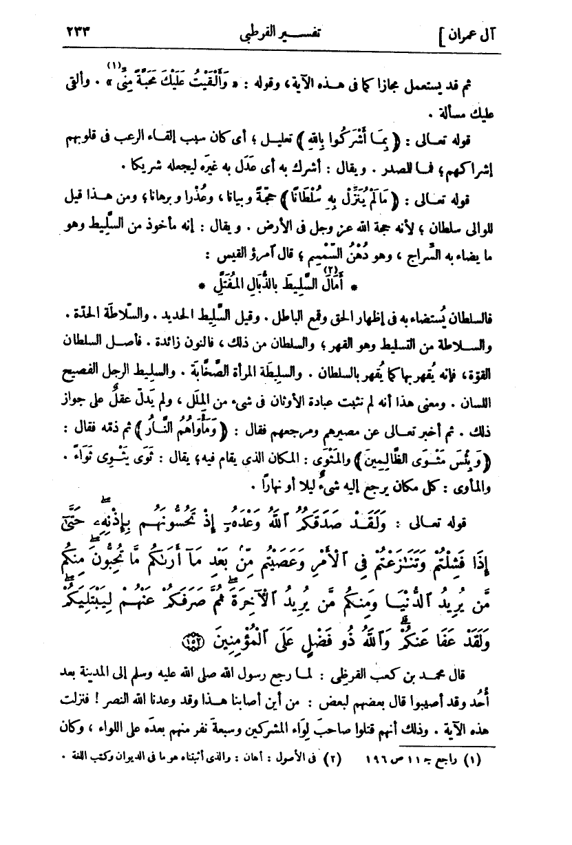 ثُمَّ قَدْ يُسْتَعْمَلُ مَجَازًا كَمَا فِي هَذِهِ الآية، وقوله:" وَأَلْقَيْتُ عَلَيْكَ مَحَبَّةً مِنِّي" [طه: ٣٩] «١» وَأُلْقِي عَلَيْكَ مَسْأَلَةً. قَوْلُهُ تَعَالَى: (بِما أَشْرَكُوا بِاللَّهِ) تَعْلِيلٌ، أَيْ كَانَ سَبَبُ إِلْقَاءِ الرُّعْبِ فِي قُلُوبِهِمْ إِشْرَاكَهَمْ، فَمَا لِلْمَصْدَرِ. وَيُقَالُ أَشْرَكَ بِهِ أَيْ عَدَلَ بِهِ غَيْرَهُ لِيَجْعَلَهُ شَرِيكًا. قَوْلُهُ تَعَالَى: (مَا لَمْ يُنَزِّلْ بِهِ سُلْطاناً) حُجَّةً وَبَيَانًا، وَعُذْرًا وَبُرْهَانًا، وَمِنْ هَذَا قِيلَ، لِلْوَالِي سُلْطَانٌ، لِأَنَّهُ حُجَّةُ اللَّهِ عَزَّ وَجَلَّ فِي الْأَرْضِ. وَيُقَالُ: إِنَّهُ مَأْخُوذٌ مِنَ السَّلِيطِ وَهُوَ مَا يُضَاءُ بِهِ السِّرَاجُ، وَهُوَ دُهْنُ السِّمْسِمِ، قَالَ امْرُؤُ الْقَيْسِ: