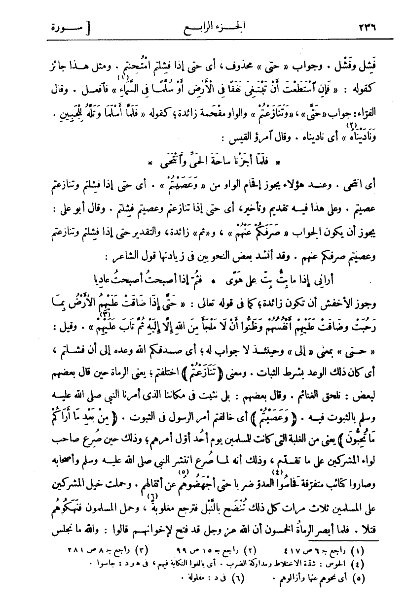 أَيِ انْتَحَى. وَعِنْدَ هَؤُلَاءِ يَجُوزُ إِقْحَامُ الْوَاوِ مِنْ" وَعَصَيْتُمْ". أَيْ حَتَّى إِذَا فَشِلْتُمْ وَتَنَازَعْتُمْ عَصَيْتُمْ. وَعَلَى هَذَا فِيهِ تَقْدِيمٌ وَتَأْخِيرٌ، أَيْ حَتَّى إِذَا تَنَازَعْتُمْ وَعَصَيْتُمْ وفشلتم. وَقَالَ أَبُو عَلِيٍّ: يَجُوزُ أَنْ يَكُونَ الْجَوَابُ" صَرَفَكُمْ عَنْهُمْ"،" ثُمَّ" زَائِدَةٌ، وَالتَّقْدِيرُ حَتَّى إِذَا فَشِلْتُمْ وَتَنَازَعْتُمْ وَعَصَيْتُمْ صَرَفَكُمْ عَنْهُمْ. وَقَدْ أَنْشَدَ بَعْضُ النَّحْوِيِّينَ في زيادتها قوله الشاعر: