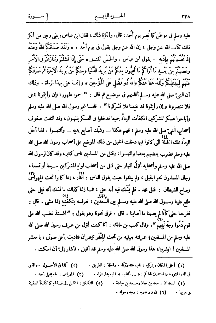 عَلَيْهِ وَسَلَّمَ فِي مَوْطِنٍ كَمَا نُصِرَ يَوْمَ أُحُدٍ، قَالَ: وَأَنْكَرْنَا ذَلِكَ، فَقَالَ ابْنُ عَبَّاسٍ: بَيْنِي وَبَيْنَ مَنْ أَنْكَرَ ذَلِكَ كِتَابُ اللَّهِ عَزَّ وَجَلَّ، إِنَّ اللَّهَ عَزَّ وَجَلَّ يَقُولُ فِي يَوْمِ أُحُدٍ: وَلَقَدْ صَدَقَكُمُ اللَّهُ وَعْدَهُ إِذْ تَحُسُّونَهُمْ بِإِذْنِهِ- يَقُولُ ابْنُ عَبَّاسٍ: وَالْحَسُّ الْقَتْلُ حَتَّى إِذَا فَشِلْتُمْ وَتَنَازَعْتُمْ فِي الْأَمْرِ وَعَصَيْتُمْ مِنْ بَعْدِ مَا أَرَاكُمْ مَا تُحِبُّونَ مِنْكُمْ مَنْ يُرِيدُ الدُّنْيَا وَمِنْكُمْ مَنْ يُرِيدُ الْآخِرَةَ ثُمَّ صَرَفَكُمْ عَنْهُمْ لِيَبْتَلِيَكُمْ وَلَقَدْ عَفَا عَنْكُمْ وَاللَّهُ ذُو فَضْلٍ عَلَى الْمُؤْمِنِينَ" وَإِنَّمَا عَنَى بِهَذَا الرُّمَاةَ. وَذَلِكَ أَنَّ النَّبِيَّ صَلَّى اللَّهُ عَلَيْهِ وَسَلَّمَ أَقَامَهُمْ فِي مَوْضِعٍ ثُمَّ قَالَ: (احْمُوا ظُهُورَنَا فَإِنْ رَأَيْتُمُونَا نُقْتَلُ فَلَا تَنْصُرُونَا وَإِنْ رَأَيْتُمُونَا قَدْ غَنِمْنَا فَلَا تَشْرَكُونَا). فَلَمَّا غَنِمَ رَسُولُ اللَّهِ صَلَّى اللَّهُ عَلَيْهِ وَسَلَّمَ وَأَبَاحُوا عَسْكَرَ الْمُشْرِكِينَ انْكَفَأَتِ الرُّمَاةُ جَمِيعًا فَدَخَلُوا فِي الْعَسْكَرِ يَنْتَهِبُونَ، وَقَدِ الْتَقَتْ صُفُوفُ أَصْحَابِ النَّبِيِّ صَلَّى اللَّهُ عَلَيْهِ وَسَلَّمَ، فَهُمْ هَكَذَا- وَشَبَّكَ أَصَابِعَ يَدَيْهِ- وَالْتَبَسُوا. فَلَمَّا أَخَلَّ الرُّمَاةُ تِلْكَ الْخَلَّةِ «١» الَّتِي كَانُوا فِيهَا دَخَلَتِ الْخَيْلُ مِنْ ذَلِكَ الْمَوْضِعِ عَلَى أَصْحَابِ رَسُولِ اللَّهِ صَلَّى اللَّهُ عَلَيْهِ وَسَلَّمَ فَضَرَبَ بَعْضُهُمْ بَعْضًا وَالْتَبَسُوا، وَقُتِلَ مِنَ الْمُسْلِمِينَ نَاسٌ كَثِيرٌ، وَقَدْ كَانَ لِرَسُولِ اللَّهِ صَلَّى اللَّهُ عَلَيْهِ وَسَلَّمَ وَأَصْحَابِهِ أَوَّلَ النَّهَارِ حَتَّى قُتِلَ مِنْ أَصْحَابِ لِوَاءِ الْمُشْرِكِينَ سَبْعَةٌ أَوْ تِسْعَةٌ، وَجَالَ الْمُسْلِمُونَ نَحْوَ الْجَبَلِ، وَلَمْ يَبْلُغُوا حَيْثُ يَقُولُ النَّاسُ: الْغَارَ «٢»، إِنَّمَا كَانُوا تَحْتَ الْمِهْرَاسِ «٣» وَصَاحَ الشَّيْطَانُ: قُتِلَ مُحَمَّدٌ. فَلَمْ يُشَكَّ فِيهِ أَنَّهُ حَقٌّ، فَمَا زِلْنَا كَذَلِكَ مَا نَشُكُّ أَنَّهُ قُتِلَ حَتَّى طَلَعَ عَلَيْنَا رَسُولُ اللَّهِ صَلَّى اللَّهُ عَلَيْهِ وَسَلَّمَ بَيْنَ السَّعْدَيْنِ «٤»، نَعْرِفُهُ بِتَكَفُّئِهِ «٥» إِذَا مَشَى. قَالَ: فَفَرِحْنَا حَتَّى كَأَنَّا لَمْ يُصِبْنَا مَا أَصَابَنَا. قَالَ: فَرَقِيَ نَحْوَنَا وَهُوَ يَقُولُ: (اشْتَدَّ غَضَبُ اللَّهِ عَلَى قَوْمٍ دَمَّوْا وَجْهَ نَبِيِّهِمْ) «٦». وَقَالَ كَعْبُ بْنُ مَالِكٍ: أَنَا كُنْتُ أَوَّلَ مَنْ عَرَفَ رَسُولَ اللَّهِ صَلَّى اللَّهُ عَلَيْهِ وَسَلَّمَ مِنَ الْمُسْلِمِينَ، عَرَفْتُهُ بِعَيْنَيْهِ مِنْ تَحْتِ الْمِغْفَرِ تُزْهِرَانِ فَنَادَيْتُ بِأَعْلَى صَوْتِي: يَا مَعْشَرَ الْمُسْلِمِينَ! أَبْشِرُوا، هَذَا رَسُولُ اللَّهِ صَلَّى اللَّهُ عَلَيْهِ وَسَلَّمَ قَدْ أَقْبَلَ. فَأَشَارَ إلي أن اسكت.