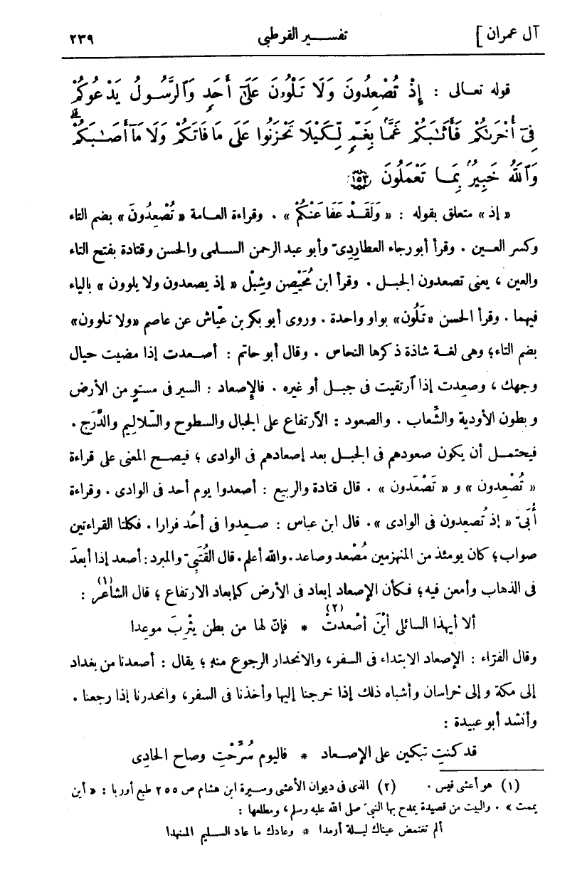 " إِذْ" مُتَعَلِّقٌ بِقَوْلِهِ:" وَلَقَدْ عَفا عَنْكُمْ". وَقِرَاءَةُ الْعَامَّةِ" تُصْعِدُونَ" بِضَمِ التَّاءِ وَكَسْرِ الْعَيْنِ. وَقَرَأَ أَبُو رَجَاءٍ الْعُطَارِدِيُّ وَأَبُو عَبْدِ الرَّحْمَنِ السُّلَمِيُّ وَالْحَسَنُ وَقَتَادَةُ بِفَتْحِ التَّاءِ وَالْعَيْنِ، يَعْنِي تَصْعَدُونَ الْجَبَلَ. وَقَرَأَ ابْنُ مُحَيْصِنٍ وَشِبْلٌ" إِذْ يَصْعَدُونَ وَلَا يَلْوُونَ" بِالْيَاءِ فِيهِمَا. وَقَرَأَ الْحَسَنُ" تَلُونَ" بِوَاوٍ وَاحِدَةٍ. وَرَوَى أَبُو بَكْرِ بْنُ عَيَّاشٍ عَنْ عَاصِمٍ" وَلَا تُلْوُونَ" بِضَمِ التَّاءِ، وَهِيَ لُغَةٌ شَاذَّةٌ ذَكَرَهَا النَّحَّاسُ. وَقَالَ أَبُو حَاتِمٍ: أَصْعَدْتُ إِذَا مَضَيْتُ حِيَالَ وَجْهِكَ، وَصَعِدْتُ إِذَا ارْتَقَيْتُ فِي جَبَلٍ أَوْ غَيْرِهِ. فَالْإِصْعَادُ: السَّيْرُ فِي مُسْتَوٍ مِنَ الْأَرْضِ وَبُطُونِ الْأَوْدِيَةِ وَالشِّعَابِ. وَالصُّعُودُ: الِارْتِفَاعُ عَلَى الْجِبَالِ وَالسُّطُوحِ وَالسَّلَالِيمِ وَالدَّرَجِ. فَيَحْتَمِلُ أَنْ يَكُونَ صُعُودُهُمْ فِي الْجَبَلِ بَعْدَ إِصْعَادِهِمْ فِي الْوَادِي، فَيَصِحُّ الْمَعْنَى عَلَى قِرَاءَةِ" تُصْعِدُونَ" وَ" تَصْعَدُونَ". قَالَ قَتَادَةُ وَالرَّبِيعُ: أَصَعَدُوا يَوْمَ أُحُدٍ فِي الْوَادِي. وَقِرَاءَةُ أُبَيٍّ" إِذْ تُصْعِدُونَ فِي الْوَادِي". قَالَ ابْنُ عَبَّاسٍ: صَعِدُوا فِي أُحُدٍ فِرَارًا. فَكِلْتَا الْقِرَاءَتَيْنِ صَوَابٌ، كَانَ يَوْمَئِذٍ مِنَ الْمُنْهَزِمِينَ مُصْعَدٌ وَصَاعِدٌ. وَاللَّهُ أَعْلَمُ. قَالَ الْقُتَبِيُّ وَالْمُبَرِّدُ: أَصْعَدَ إِذَا أَبْعَدَ فِي الذَّهَابِ وَأَمْعَنَ فِيهِ، فَكَأَنَّ الْإِصْعَادَ إِبْعَادٌ فِي الْأَرْضِ كَإِبْعَادِ الِارْتِفَاعِ، قَالَ الشَّاعِرُ «١»: