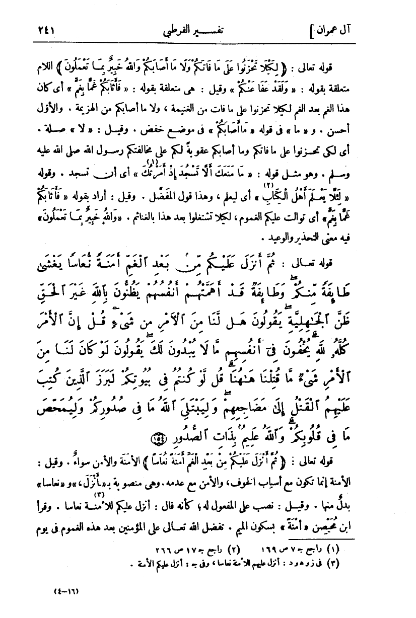ثُمَّ أَنْزَلَ عَلَيْكُمْ مِنْ بَعْدِ الْغَمِّ أَمَنَةً نُعاساً يَغْشى طائِفَةً مِنْكُمْ وَطائِفَةٌ قَدْ أَهَمَّتْهُمْ أَنْفُسُهُمْ يَظُنُّونَ بِاللَّهِ غَيْرَ الْحَقِّ ظَنَّ الْجاهِلِيَّةِ يَقُولُونَ هَلْ لَنا مِنَ الْأَمْرِ مِنْ شَيْءٍ قُلْ إِنَّ الْأَمْرَ كُلَّهُ لِلَّهِ يُخْفُونَ فِي أَنْفُسِهِمْ مَا لَا يُبْدُونَ لَكَ يَقُولُونَ لَوْ كانَ لَنا مِنَ الْأَمْرِ شَيْءٌ مَا قُتِلْنا هاهُنا قُلْ لَوْ كُنْتُمْ فِي بُيُوتِكُمْ لَبَرَزَ الَّذِينَ كُتِبَ عَلَيْهِمُ الْقَتْلُ إِلى مَضاجِعِهِمْ وَلِيَبْتَلِيَ اللَّهُ مَا فِي صُدُورِكُمْ وَلِيُمَحِّصَ مَا فِي قُلُوبِكُمْ وَاللَّهُ عَلِيمٌ بِذاتِ الصُّدُورِ (١٥٤)
