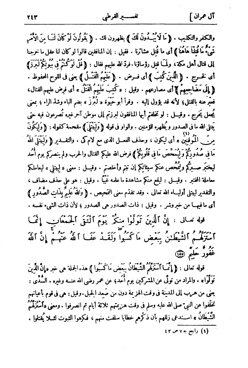 قَوْلُهُ تَعَالَى: (إِنَّمَا اسْتَزَلَّهُمُ الشَّيْطانُ بِبَعْضِ مَا كَسَبُوا) هَذِهِ الْجُمْلَةُ هِيَ خَبَرُ" إِنَّ الَّذِينَ تَوَلَّوْا" وَالْمُرَادُ مَنْ تَوَلَّى عَنِ الْمُشْرِكِينَ يَوْمَ أُحُدٍ، عَنْ عُمَرَ رَضِيَ اللَّهُ عَنْهُ وَغَيْرِهِ. السُّدِّيُّ: يَعْنِي مَنْ هَرَبَ إِلَى الْمَدِينَةِ فِي وَقْتِ الْهَزِيمَةِ دُونَ مَنْ صَعِدَ الْجَبَلَ. وَقِيلَ: هِيَ فِي قَوْمٍ بِأَعْيَانِهِمْ تَخَلَّفُوا عَنِ النَّبِيِّ صَلَّى اللَّهُ عَلَيْهِ وَسَلَّمَ فِي وَقْتِ هَزِيمَتِهِمْ ثَلَاثَةَ أَيَّامٍ ثُمَّ انْصَرَفُوا. وَمَعْنَى" اسْتَزَلَّهُمُ الشَّيْطانُ" اسْتَدْعَى زَلَلَهُمْ بِأَنْ ذَكَّرَهُمْ خَطَايَا سَلَفَتْ مِنْهُمْ، فكرهوا الثبوت لئلا يقتلوا.