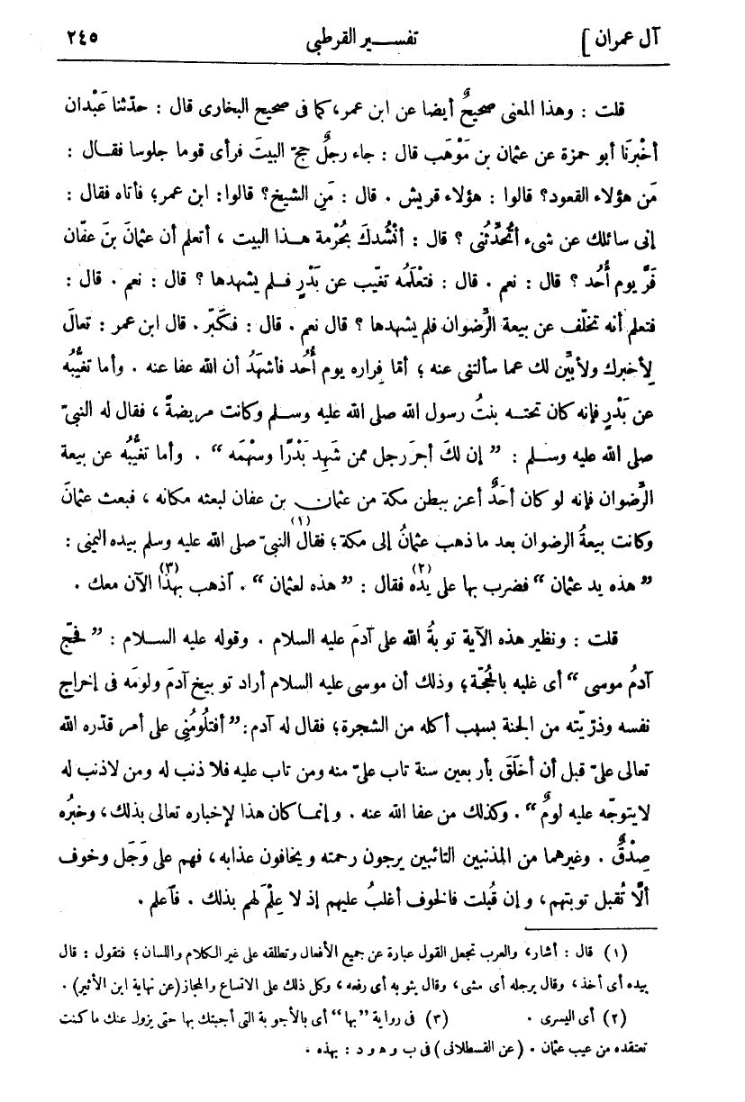 قُلْتُ: وَهَذَا الْمَعْنَى صَحِيحٌ أَيْضًا عَنِ ابْنِ عُمَرَ، كَمَا فِي صَحِيحِ الْبُخَارِيِّ قَالَ: حَدَّثَنَا عَبْدَانُ أَخْبَرَنَا أَبُو حَمْزَةَ عَنْ عُثْمَانَ بْنِ مَوْهَبٍ قَالَ: جَاءَ رَجُلٌ حَجَّ الْبَيْتَ فَرَأَى قَوْمًا جُلُوسًا فَقَالَ: مَنْ هَؤُلَاءِ الْقُعُودُ؟ قَالُوا: هَؤُلَاءِ قُرَيْشٌ. قَالَ: مَنِ الشَّيْخُ؟ قَالُوا: ابْنُ عمر، فأتاه فقال: إني سائلك عن شي أَتُحَدِّثُنِي؟ قَالَ: أَنْشُدُكَ بِحُرْمَةِ هَذَا الْبَيْتِ، أَتَعْلَمُ أَنَّ عُثْمَانَ بْنَ عَفَّانَ فَرَّ يَوْمَ أُحُدٍ؟ قَالَ: نَعَمْ. قَالَ: فَتَعْلَمُهُ تَغَيَّبَ عَنْ بَدْرٍ فَلَمْ يَشْهَدْهَا؟ قَالَ: نَعَمْ. قَالَ: فَتَعْلَمُ أَنَّهُ تَخَلَّفَ عَنْ بَيْعَةِ الرِّضْوَانِ فَلَمْ يَشْهَدْهَا؟ قَالَ نَعَمْ. قَالَ: فَكَبَّرَ. قَالَ ابْنُ عُمَرَ: تَعَالَ لِأُخْبِرَكَ وَلِأُبَيِّنَ لَكَ عَمَّا سَأَلْتَنِي عَنْهُ، أَمَّا فِرَارُهُ يَوْمَ أُحُدٍ فَأَشْهَدُ أَنَّ اللَّهَ عَفَا عَنْهُ. وَأَمَّا تَغَيُّبُهُ عَنْ بَدْرٍ فَإِنَّهُ كَانَ تَحْتَهُ بِنْتُ رَسُولِ اللَّهِ صَلَّى اللَّهُ عَلَيْهِ وَسَلَّمَ وَكَانَتْ مَرِيضَةً، فَقَالَ لَهُ النَّبِيُّ صَلَّى اللَّهُ عَلَيْهِ وَسَلَّمَ (إِنَّ لَكَ أَجْرَ رَجُلٍ من شَهِدَ بَدْرًا وَسَهْمَهُ). وَأَمَّا تَغَيُّبُهُ عَنْ بَيْعَةِ الرِّضْوَانِ فَإِنَّهُ لَوْ كَانَ أَحَدٌ أَعَزَّ بِبَطْنِ مَكَّةَ مِنْ عُثْمَانَ بْنِ عَفَّانَ لَبَعَثَهُ مَكَانُهُ، فبعث عثمان وكانت بيعة الرضوان بعد ما ذَهَبَ عُثْمَانُ إِلَى مَكَّةَ، فَقَالَ «١» النَّبِيُّ صَلَّى اللَّهُ عَلَيْهِ وَسَلَّمَ بِيَدِهِ الْيُمْنَى: (هَذِهِ يَدُ عُثْمَانَ) فَضَرَبَ بِهَا عَلَى يَدِهِ «٢» فَقَالَ: (هَذِهِ لِعُثْمَانَ). اذْهَبْ بِهَذَا «٣» الْآنَ مَعَكَ. قُلْتُ: وَنَظِيرُ هَذِهِ الْآيَةِ تَوْبَةُ اللَّهِ عَلَى آدَمَ عَلَيْهِ السَّلَامُ. وَقَوْلُهُ عَلَيْهِ السَّلَامُ: (فَحَجَّ آدَمُ مُوسَى) أَيْ غَلَبَهُ بِالْحُجَّةِ، وَذَلِكَ أَنَّ مُوسَى عَلَيْهِ السَّلَامُ أَرَادَ تَوْبِيخَ آدَمَ وَلَوْمَهُ فِي إِخْرَاجِ نَفْسِهِ وَذُرِّيَّتِهِ مِنَ الْجَنَّةِ بِسَبَبِ أَكْلِهِ مِنَ الشَّجَرَةِ، فَقَالَ لَهُ آدَمُ: (أَفَتَلُومُنِي عَلَى أَمْرٍ قَدَّرَهُ اللَّهُ تَعَالَى عَلَيَّ قَبْلَ أَنْ أُخْلَقَ بِأَرْبَعِينَ سَنَةً تَابَ عَلَيَّ مِنْهُ وَمَنْ تَابَ عَلَيْهِ فَلَا ذَنْبَ لَهُ وَمَنْ لَا ذَنْبَ لَهُ لَا يَتَوَجَّهُ عَلَيْهِ لَوْمٌ (. وَكَذَلِكَ مَنْ عَفَا اللَّهُ عَنْهُ. وَإِنَّمَا كَانَ هَذَا لِإِخْبَارِهِ تَعَالَى بِذَلِكَ، وَخَبَرُهُ صِدْقٌ. وَغَيْرُهُمَا مِنَ الْمُذْنِبِينَ التَّائِبِينَ يَرْجُونَ رَحْمَتَهُ وَيَخَافُونَ عَذَابَهُ، فَهُمْ عَلَى وَجَلٍ وَخَوْفٍ أَلَّا تُقْبَلَ تَوْبَتُهُمْ، وَإِنْ قُبِلَتْ فَالْخَوْفُ أَغْلَبُ عَلَيْهِمْ إِذْ لَا عِلْمَ لَهُمْ بذلك. فأعلم.