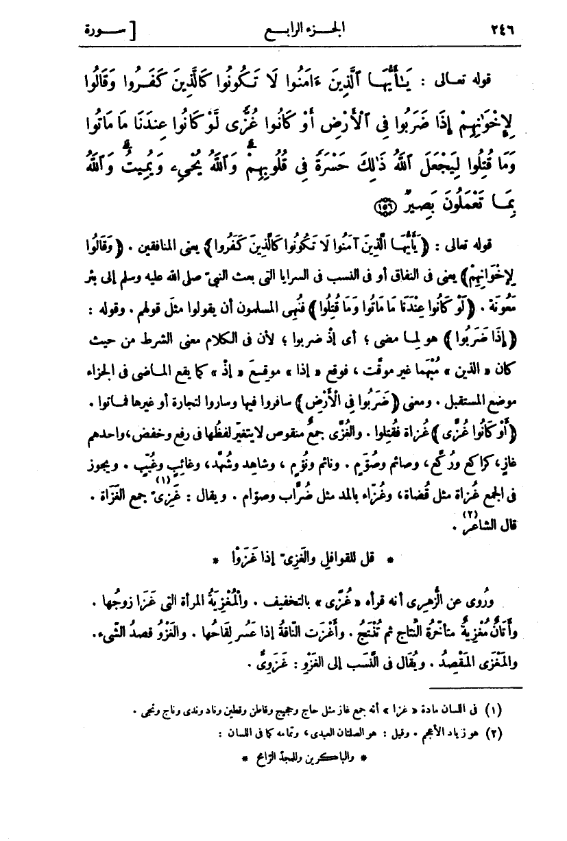 قَوْلُهُ تَعَالَى: (يَا أَيُّهَا الَّذِينَ آمَنُوا لَا تَكُونُوا كَالَّذِينَ كَفَرُوا) يَعْنِي الْمُنَافِقِينَ. (وَقالُوا لِإِخْوانِهِمْ) يَعْنِي فِي النِّفَاقِ أَوْ فِي النَّسَبِ فِي السَّرَايَا الَّتِي بَعَثَ النَّبِيُّ صَلَّى اللَّهُ عَلَيْهِ وَسَلَّمَ إِلَى بِئْرِ مَعُونَةَ. (لَوْ كانُوا عِنْدَنا مَا ماتُوا وَما قُتِلُوا) فَنُهِيَ الْمُسْلِمُونَ أَنْ يَقُولُوا مِثْلَ قَوْلِهِمْ. وَقَوْلُهُ: (إِذا ضَرَبُوا) هُوَ لِمَا مَضَى، أَيْ إِذْ ضَرَبُوا، لِأَنَّ فِي الْكَلَامِ مَعْنَى الشَّرْطِ مِنْ حَيْثُ كان" الَّذِينَ" بهما غَيْرَ مُوَقَّتٍ، فَوَقَعَ" إِذا" مَوْقِعَ" إِذْ" كَمَا يَقَعُ الْمَاضِي فِي الْجَزَاءِ مَوْضِعَ الْمُسْتَقْبَلِ. وَمَعْنَى (ضَرَبُوا فِي الْأَرْضِ) سَافَرُوا فِيهَا وَسَارُوا لِتِجَارَةٍ أَوْ غَيْرِهَا فَمَاتُوا. (أَوْ كانُوا غُزًّى) غُزَاةً فَقُتِلُوا. وَالْغُزَّى جَمْعٌ مَنْقُوصٌ لَا يَتَغَيَّرُ لَفْظُهَا فِي رَفْعٍ وَخَفْضٍ، وَاحِدُهُمْ غَازٍ، كَرَاكِعٍ وَرُكَّعٍ، وَصَائِمٍ وَصُوَّمٍ، وَنَائِمٍ وَنُوَّمٍ، وَشَاهِدٍ وَشُهَّدٍ، وَغَائِبٍ وَغُيَّبٍ. وَيَجُوزُ فِي الْجَمْعِ غُزَاةٌ مِثْلَ قُضَاةٍ، وَغُزَّاءُ بِالْمَدِّ مِثْلُ ضُرَّابٍ وَصُوَّامٍ. وَيُقَالُ: غُزًّى «١» جَمْعُ الْغَزَاةِ. قَالَ الشَّاعِرُ «٢»: