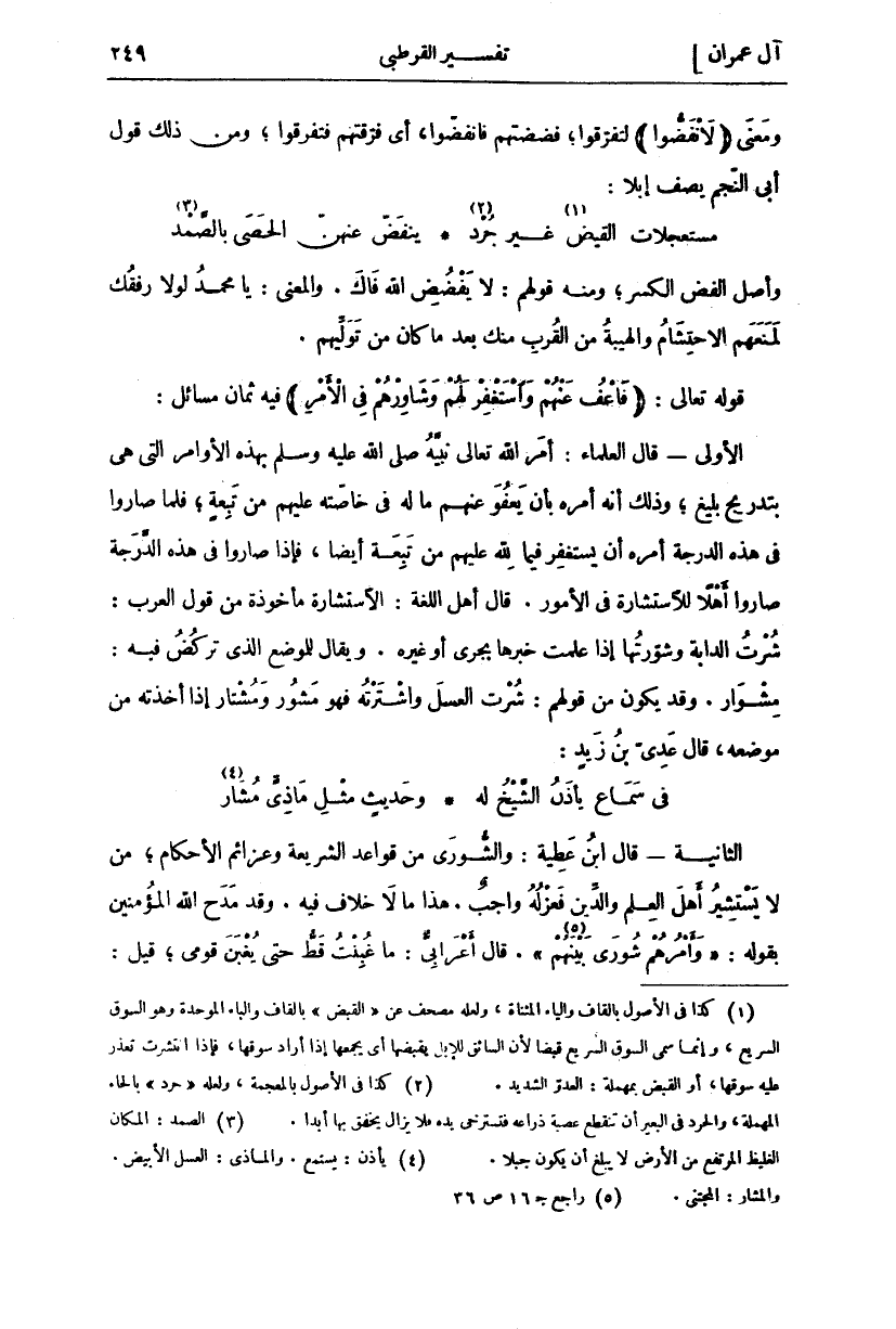 وَأَصْلُ الْفَضِّ الْكَسْرُ، وَمِنْهُ قَوْلُهُمْ: لَا يَفْضُضِ اللَّهُ فَاكَ. وَالْمَعْنَى: يَا مُحَمَّدُ لَوْلَا رِفْقُكَ لَمَنَعَهُمُ الِاحْتِشَامُ وَالْهَيْبَةُ مِنَ الْقُرْبِ مِنْكَ بَعْدَ مَا كَانَ مِنْ تَوَلِّيهِمْ. قَوْلُهُ تَعَالَى: (فَاعْفُ عَنْهُمْ وَاسْتَغْفِرْ لَهُمْ وَشاوِرْهُمْ فِي الْأَمْرِ) الْأُولَى- قَالَ الْعُلَمَاءُ: أَمَرَ اللَّهُ تَعَالَى نَبِيَّهُ صَلَّى اللَّهُ عَلَيْهِ وَسَلَّمَ بِهَذِهِ الْأَوَامِرِ الَّتِي هِيَ بِتَدْرِيجٍ بَلِيغٍ، وَذَلِكَ أَنَّهُ أَمَرَهُ بِأَنْ يَعْفُوَ عَنْهُمْ مَا لَهُ فِي خَاصَّتِهِ عَلَيْهِمْ مِنْ تَبِعَةٍ، فَلَمَّا صَارُوا فِي هَذِهِ الدَّرَجَةِ أَمَرَهُ أَنْ يَسْتَغْفِرَ فِيمَا لِلَّهِ عَلَيْهِمْ مِنْ تَبِعَةٍ أَيْضًا، فَإِذَا صَارُوا فِي هَذِهِ الدَّرَجَةِ صَارُوا أَهْلًا لِلِاسْتِشَارَةِ فِي الْأُمُورِ. قَالَ أَهْلُ اللُّغَةِ: الِاسْتِشَارَةُ مَأْخُوذَةٌ مِنْ قَوْلِ الْعَرَبِ: شُرْتُ الدَّابَّةَ وَشَوَّرْتُهَا إِذَا عَلِمْتُ خَبَرَهَا بِجَرْيٍ أَوْ غَيْرِهِ. وَيُقَالُ لِلْمَوْضِعِ الَّذِي تَرْكُضُ فِيهِ: مِشْوَارٌ. وَقَدْ يَكُونُ مِنْ قَوْلِهِمْ: شُرْتُ الْعَسَلَ وَاشْتَرْتُهُ فَهُوَ مَشُورٌ وَمُشْتَارٌ إِذَا أَخَذْتُهُ مِنْ مَوْضِعِهِ، قَالَ عَدِيُّ بْنُ زَيْدٍ: