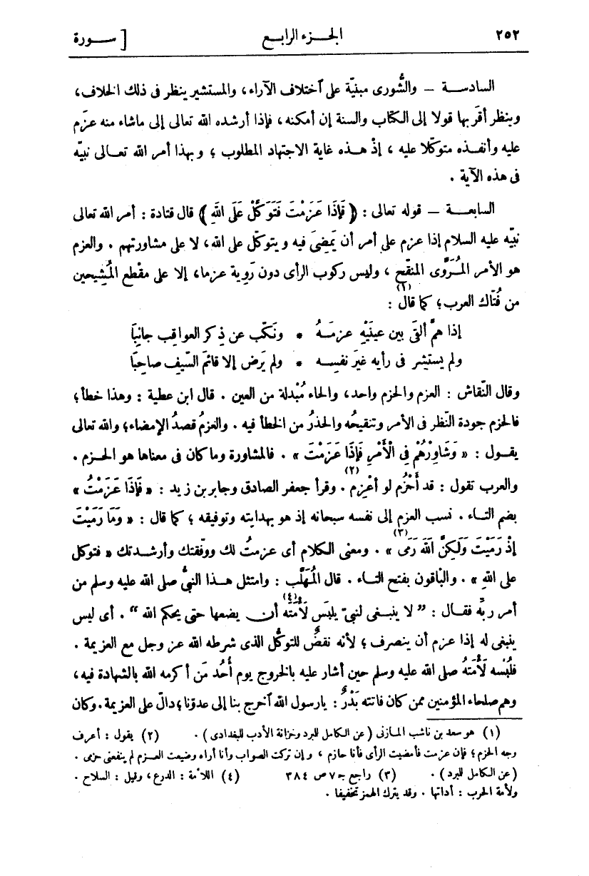 السَّادِسَةُ- وَالشُّورَى مَبْنِيَّةٌ عَلَى اخْتِلَافِ الْآرَاءِ، وَالْمُسْتَشِيرُ يَنْظُرُ فِي ذَلِكَ الْخِلَافِ، وَيَنْظُرُ أَقْرَبَهَا قَوْلًا إِلَى الْكِتَابِ وَالسُّنَّةِ إِنْ أَمْكَنَهُ، فَإِذَا أَرْشَدَهُ اللَّهُ تَعَالَى إِلَى مَا شَاءَ مِنْهُ عَزَمَ عَلَيْهِ وَأَنْفَذَهُ مُتَوَكِّلًا عَلَيْهِ، إِذْ هَذِهِ غَايَةُ الِاجْتِهَادِ الْمَطْلُوبِ، وَبِهَذَا أَمَرَ اللَّهُ تَعَالَى نَبِيَّهُ فِي هَذِهِ الْآيَةِ. السَّابِعَةُ- قَوْلُهُ تَعَالَى: (فَإِذا عَزَمْتَ فَتَوَكَّلْ عَلَى اللَّهِ) قَالَ قَتَادَةُ: أَمَرَ اللَّهُ تَعَالَى نَبِيَّهُ عَلَيْهِ السَّلَامُ إِذَا عَزَمَ عَلَى أَمْرٍ أَنْ يَمْضِيَ فِيهِ وَيَتَوَكَّلَ عَلَى اللَّهِ، لَا عَلَى مُشَاوَرَتِهِمْ. وَالْعَزْمُ هُوَ الْأَمْرُ الْمُرَوَّى الْمُنَقَّحُ، وَلَيْسَ رُكُوبُ الرَّأْيِ دُونَ رَوِيَّةٍ عَزْمًا، إِلَّا عَلَى مَقْطَعِ الْمُشِيحِينَ مِنْ فُتَّاكِ الْعَرَبِ، كَمَا قَالَ «١»: