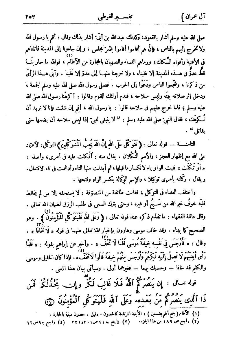 صَلَّى اللَّهُ عَلَيْهِ وَسَلَّمَ أَشَارَ بِالْقُعُودِ، وَكَذَلِكَ عَبْدُ اللَّهِ بْنُ أُبَيٍّ أَشَارَ بِذَلِكَ وَقَالَ: أَقِمْ يَا رَسُولَ اللَّهِ وَلَا تَخْرُجْ إِلَيْهِمْ بِالنَّاسِ، فَإِنْ هُمْ أَقَامُوا أَقَامُوا بِشَرِّ مَجْلِسٍ، وَإِنْ جَاءُونَا إِلَى الْمَدِينَةِ قَاتَلْنَاهُمْ فِي الْأَفْنِيَةِ وَأَفْوَاهِ السِّكَكِ، وَرَمَاهُمُ النِّسَاءُ وَالصِّبْيَانُ بِالْحِجَارَةِ مِنَ الآطام «١»، فو الله مَا حَارَبَنَا قَطُّ عَدُوٌّ فِي هَذِهِ الْمَدِينَةِ إِلَّا غَلَبْنَاهُ، وَلَا خَرَجْنَا مِنْهَا إِلَى عَدُوٍّ إِلَّا غَلَبَنَا. وَأَبَى هَذَا الرَّأْيَ مَنْ ذَكَرْنَا، وَشَجَّعُوا النَّاسَ وَدَعَوْا إِلَى الْحَرْبِ. فَصَلَّى رَسُولُ اللَّهِ صَلَّى اللَّهُ عَلَيْهِ وَسَلَّمَ الْجُمْعَةَ، وَدَخَلَ إِثْرَ صَلَاتِهِ بَيْتَهُ وَلَبِسَ سِلَاحَهُ، فَنَدِمَ أُولَئِكَ الْقَوْمُ وَقَالُوا: أَكْرَهْنَا رَسُولَ اللَّهِ صَلَّى اللَّهُ عَلَيْهِ وَسَلَّمَ، فَلَمَّا خَرَجَ عَلَيْهِمْ فِي سِلَاحِهِ قَالُوا: يَا رَسُولَ اللَّهِ، أَقِمْ إِنْ شِئْتَ فَإِنَّا لَا نُرِيدُ أَنْ نُكْرِهَكَ، فَقَالَ النَّبِيُّ صَلَّى اللَّهُ عَلَيْهِ وَسَلَّمَ: (لَا يَنْبَغِي لِنَبِيٍّ إِذَا لَبِسَ سِلَاحَهُ أَنْ يَضَعَهَا حَتَّى يُقَاتِلَ). الثَّامِنَةُ- قَوْلُهُ تَعَالَى: (فَتَوَكَّلْ عَلَى اللَّهِ إِنَّ اللَّهَ يُحِبُّ الْمُتَوَكِّلِينَ) التَّوَكُّلُ: الِاعْتِمَادُ عَلَى اللَّهِ مَعَ إِظْهَارِ الْعَجْزِ، وَالِاسْمُ التُّكْلَانُ. يُقَالُ مِنْهُ: اتَّكَلْتُ عَلَيْهِ فِي أَمْرِي، وَأَصْلُهُ:" اوْتَكَلْتُ" قُلِبَتِ الواو ياء لانكسار ما قبلها، ثم أبد لت مِنْهَا التَّاءُ وَأُدْغِمَتْ فِي تَاءِ الِافْتِعَالِ. وَيُقَالُ: وَكَّلْتُهُ بِأَمْرِي تَوْكِيلًا، وَالِاسْمُ الْوِكَالَةُ بِكَسْرِ الْوَاوِ وَفَتْحِهَا. وَاخْتَلَفَ الْعُلَمَاءُ فِي التَّوَكُّلِ، فَقَالَتْ طَائِفَةٌ مِنَ الْمُتَصَوِّفَةِ: لَا يَسْتَحِقُّهُ إِلَّا مَنْ لَمْ يُخَالِطْ قَلْبَهُ خَوْفُ غَيْرِ اللَّهِ مِنْ سَبْعٍ أَوْ غَيْرِهِ، وَحَتَّى يَتْرُكَ السَّعْيَ فِي طَلَبِ الرِّزْقِ لِضَمَانِ اللَّهِ تَعَالَى. وَقَالَ عَامَّةُ الْفُقَهَاءِ: مَا تَقَدَّمَ ذِكْرُهُ عِنْدَ قَوْلِهِ تَعَالَى: (وَعَلَى اللَّهِ فَلْيَتَوَكَّلِ الْمُؤْمِنُونَ) [آل عمران: ١٦٠] «٢». وَهُوَ الصَّحِيحُ كَمَا بَيَّنَّاهُ. وَقَدْ خَافَ مُوسَى وَهَارُونُ بِإِخْبَارِ اللَّهِ تَعَالَى عَنْهُمَا فِي قَوْلِهِ" لَا تَخافا" «٣». وَقَالَ:" فَأَوْجَسَ فِي نَفْسِهِ خِيفَةً مُوسى قُلْنا لَا تَخَفْ" [طه: ٦٨ - ٦٧] «٤». وَأَخْبَرَ عَنْ إِبْرَاهِيمَ بِقَوْلِهِ:" فَلَمَّا رَأى أَيْدِيَهُمْ لَا تَصِلُ إِلَيْهِ نَكِرَهُمْ وَأَوْجَسَ مِنْهُمْ خِيفَةً قالُوا لا تَخَفْ" [هود: ٧٠] «٥». فإذا كان الخليل وموسى والكليم قَدْ خَافَا وَحَسْبُكَ بِهِمَا- فَغَيْرُهُمَا أَوْلَى. وَسَيَأْتِي بيان هذا المعنى.