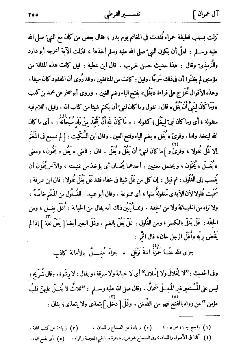نَزَلَتْ بِسَبَبِ قَطِيفَةٍ حَمْرَاءَ فُقِدَتْ فِي الْمَغَانِمِ يَوْمَ بَدْرٍ، فَقَالَ بَعْضُ مَنْ كَانَ مَعَ النَّبِيِّ صَلَّى اللَّهُ عَلَيْهِ وَسَلَّمَ: لَعَلَّ أَنْ يَكُونَ النَّبِيُّ صَلَّى اللَّهُ عَلَيْهِ وَسَلَّمَ أَخَذَهَا، فَنَزَلَتِ الْآيَةُ أَخْرَجَهُ أَبُو دَاوُدَ وَالتِّرْمِذِيُّ وَقَالَ: هَذَا حَدِيثٌ حَسَنٌ غَرِيبٌ. قَالَ ابْنُ عَطِيَّةَ: قِيلَ كَانَتْ هَذِهِ الْمَقَالَةُ مِنْ مُؤْمِنِينَ لَمْ يَظُنُّوا أَنَّ فِي ذَلِكَ حَرَجًا. وَقِيلَ: كَانَتْ مِنَ الْمُنَافِقِينَ. وَقَدْ رُوِيَ أَنَّ الْمَفْقُودَ كَانَ سَيْفًا. وَهَذِهِ الْأَقْوَالُ تُخَرَّجُ عَلَى قِرَاءَةِ" يَغُلَّ" بِفَتْحِ الْيَاءِ وَضَمِّ الْغَيْنِ. وَرَوَى أَبُو صَخْرٍ عَنْ مُحَمَّدِ بْنِ كَعْبٍ" وَما كانَ لِنَبِيٍّ أَنْ يَغُلَّ" قَالَ: تَقُولُ وَمَا كَانَ لِنَبِيٍّ أَنْ يَكْتُمَ شَيْئًا مِنْ كِتَابِ اللَّهِ. وَقِيلَ: اللَّامُ فِيهِ مَنْقُولَةٌ، أَيْ وَمَا كَانَ نَبِيٌّ لِيَغُلَّ، كَقَوْلِهِ:" مَا كانَ لِلَّهِ أَنْ يَتَّخِذَ مِنْ وَلَدٍ سُبْحانَهُ" [مريم: ٣٥] «١». أي ما كان الله ليتخذ ولدا. وقرى" يُغَلِّ" بِضَمِ الْيَاءِ وَفَتْحِ الْغَيْنِ. وَقَالَ ابْنُ السِّكِّيتِ: [لَمْ نَسْمَعْ فِي الْمَغْنَمِ إِلَّا غَلَّ غلولا، وقرى «٢» و [ما كَانَ لِنَبِيٍّ أَنْ يَغُلَّ وَيُغَلَّ. قَالَ: فَمَعْنَى" يَغُلَّ" يَخُونُ، وَمَعْنَى" يُغَلَّ" يَخُونُ، وَيَحْتَمِلُ مَعْنَيَيْنِ: أَحَدُهُمَا يُخَانُ أَيْ يُؤْخَذُ مِنْ غَنِيمَتِهِ، وَالْآخَرُ يُخَوَّنُ أَنْ يُنْسَبَ إِلَى الْغُلُولِ: ثُمَّ قِيلَ: إِنَّ كُلَّ مَنْ غَلَّ شَيْئًا فِي خَفَاءٍ فَقَدْ غَلَّ يَغُلُّ غُلُولًا: قَالَ ابْنُ عَرَفَةَ: سُمِّيَتْ غُلُولًا لِأَنَّ الْأَيْدِيَ مَغْلُولَةٌ مِنْهَا، أَيْ مَمْنُوعَةٌ. وَقَالَ أَبُو عُبَيْدٍ: الْغُلُولُ مِنَ الْمَغْنَمِ خَاصَّةً، وَلَا نَرَاهُ مِنَ الْخِيَانَةِ وَلَا مِنَ الْحِقْدِ. وَمِمَّا يُبَيِّنُ ذَلِكَ أَنَّهُ يُقَالُ مِنَ الْخِيَانَةِ: أَغَلَّ يُغِلُّ، وَمِنَ الْحِقْدِ: غَلَّ يَغِلُّ بِالْكَسْرِ، وَمِنَ الْغُلُولِ: غَلَّ يَغُلُّ بِالضَّمِّ. وَغَلَّ الْبَعِيرُ أَيْضًا [يَغَلُّ غَلَّةً] «٣» إِذَا لَمْ يَقْضِ رِيَّهُ وَأَغَلَّ الرَّجُلُ خَانَ، قَالَ النَّمِرُ: