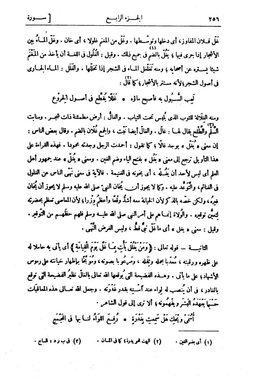 وَمِنْهُ الْغِلَالَةُ لِلثَّوْبِ الَّذِي يُلْبَسُ تَحْتَ الثِّيَابِ. وَالْغَالُّ: أَرْضٌ مُطْمَئِنَّةٌ ذَاتُ شَجَرٍ. وَمَنَابِتُ السَّلْمِ «٣» وَالطَّلْحِ يُقَالُ لَهَا: غَالٌّ. وَالْغَالُّ أَيْضًا نَبْتٌ، وَالْجَمْعُ غُلَّانُ بِالضَّمِّ. وَقَالَ بَعْضُ النَّاسِ: إِنَّ مَعْنَى" يَغُلَّ" يُوجَدُ غَالًّا، كَمَا تَقُولُ: أَحْمَدْتُ الرَّجُلَ وَجَدْتُهُ مَحْمُودًا. فَهَذِهِ الْقِرَاءَةُ عَلَى هَذَا التَّأْوِيلِ تَرْجِعُ إِلَى مَعْنَى" يَغُلَّ" بِفَتْحِ الْيَاءِ وَضَمِّ الْغَيْنِ. وَمَعْنَى" يَغُلُّ" عِنْدَ جُمْهُورِ أَهْلِ الْعِلْمِ أَيْ لَيْسَ لِأَحَدٍ أَنْ يَغُلَّهُ، أَيْ يَخُونُهُ فِي الْغَنِيمَةِ. فَالْآيَةُ فِي مَعْنَى نَهْيِ النَّاسِ عَنِ الْغُلُولِ فِي الْغَنَائِمِ، وَالتَّوَعُّدِ عَلَيْهِ. وَكَمَا لَا يَجُوزُ أَنْ يُخَانَ النَّبِيُّ صَلَّى اللَّهُ عَلَيْهِ وَسَلَّمَ لَا يَجُوزُ أَنْ يُخَانَ غَيْرُهُ، وَلَكِنْ خَصَّهُ بِالذِّكْرِ لِأَنَّ الْخِيَانَةَ مَعَهُ أَشَدُّ وَقْعًا وَأَعْظَمُ وِزْرًا، لِأَنَّ الْمَعَاصِيَ تَعْظُمُ بِحَضْرَتِهِ لِتَعَيُّنِ تَوْقِيرِهِ. وَالْوُلَاةُ إِنَّمَا هُمْ عَلَى أَمْرِ النَّبِيِّ صَلَّى اللَّهُ عَلَيْهِ وَسَلَّمَ فَلَهُمْ حَظُّهُمْ مِنَ التَّوْقِيرِ. وَقِيلَ: مَعْنَى" يَغُلَّ" أَيْ مَا غَلَّ نَبِيٌّ قَطُّ، وَلَيْسَ الْغَرَضُ النَّهْيَ. الثَّانِيَةُ- قَوْلُهُ تَعَالَى: (وَمَنْ يَغْلُلْ يَأْتِ بِما غَلَّ يَوْمَ الْقِيامَةِ) أَيْ يَأْتِي بِهِ حَامِلًا لَهُ عَلَى ظَهْرِهِ وَرَقَبَتِهِ، مُعَذَّبًا بِحَمْلِهِ وَثِقَلِهِ، وَمَرْعُوبًا بِصَوْتِهِ، وَمُوَبَّخًا بِإِظْهَارِ خِيَانَتِهِ عَلَى رُءُوسِ الْأَشْهَادِ، عَلَى مَا يَأْتِي. وَهَذِهِ الْفَضِيحَةُ الَّتِي يُوقِعُهَا اللَّهُ تَعَالَى بِالْغَالِّ نَظِيرُ الْفَضِيحَةِ الَّتِي تُوقَعُ بِالْغَادِرِ، فِي أَنْ يُنْصَبَ لَهُ لِوَاءٌ عِنْدَ إِسْتِهِ بِقَدْرِ غَدْرَتِهِ. وَجَعَلَ اللَّهُ تَعَالَى هَذِهِ الْمُعَاقَبَاتِ حَسْبَمَا يَعْهَدُهُ الْبَشَرُ وَيَفْهَمُونَهُ، أَلَا تَرَى إِلَى قَوْلِ الشَّاعِرِ: