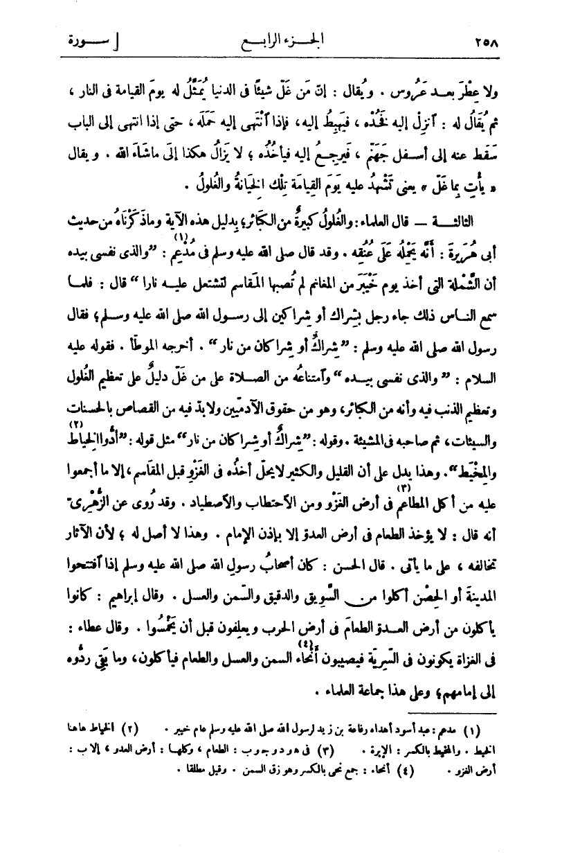 وَلَا عِطْرَ بَعْدَ عَرُوسٍ. وَيُقَالُ: إِنَّ مَنْ غَلَّ شَيْئًا فِي الدُّنْيَا يُمَثَّلُ لَهُ يَوْمَ الْقِيَامَةِ فِي النَّارِ، ثُمَّ يُقَالُ لَهُ: انْزِلْ إِلَيْهِ فَخُذْهُ، فَيَهْبِطُ إِلَيْهِ، فَإِذَا انْتَهَى إِلَيْهِ حَمَلَهُ، حَتَّى إِذَا انْتَهَى إِلَى الْبَابِ سَقَطَ عَنْهُ إِلَى أَسْفَلِ جَهَنَّمَ، فَيَرْجِعُ إِلَيْهِ فَيَأْخُذُهُ، لَا يَزَالُ هَكَذَا إِلَى مَا شَاءَ اللَّهُ. وَيُقَالُ" يَأْتِ بِما غَلَّ" يَعْنِي تَشْهَدُ عَلَيْهِ يَوْمَ الْقِيَامَةِ تِلْكَ الْخِيَانَةُ وَالْغُلُولُ. الثَّالِثَةُ- قَالَ الْعُلَمَاءُ: وَالْغُلُولُ كَبِيرَةٌ مِنَ الْكَبَائِرِ، بِدَلِيلِ هَذِهِ الْآيَةِ وَمَا ذَكَرْنَاهُ مِنْ حَدِيثِ أَبِي هُرَيْرَةَ: أَنَّهُ يَحْمِلُهُ عَلَى عُنُقِهِ. وَقَدْ قَالَ صَلَّى اللَّهُ عَلَيْهِ وَسَلَّمَ فِي مُدْعِمٍ «١»: (وَالَّذِي نَفْسِي بِيَدِهِ إِنَّ الشَّمْلَةَ الَّتِي أَخَذَ يَوْمَ خَيْبَرَ مِنَ الْمَغَانِمِ لَمْ تُصِبْهَا الْمَقَاسِمُ لَتَشْتَعِلُ عَلَيْهِ نَارًا) قَالَ: فَلَمَّا سَمِعَ النَّاسُ ذَلِكَ جَاءَ رَجُلٌ بِشِرَاكٍ أَوْ شِرَاكَيْنِ إِلَى رَسُولِ اللَّهِ صَلَّى اللَّهُ عَلَيْهِ وَسَلَّمَ، فَقَالَ رَسُولُ اللَّهِ صَلَّى اللَّهُ عَلَيْهِ وَسَلَّمَ: (شِرَاكٌ أَوْ شِرَاكَانِ مِنْ نَارٍ). أَخْرَجَهُ الْمُوَطَّأُ. فَقَوْلُهُ عَلَيْهِ السَّلَامُ: (وَالَّذِي نَفْسِي بِيَدِهِ) وَامْتِنَاعُهُ مِنَ الصَّلَاةِ عَلَى مَنْ غَلَّ دَلِيلٌ عَلَى تَعْظِيمِ الْغُلُولِ وَتَعْظِيمِ الذَّنْبِ فِيهِ وَأَنَّهُ مِنَ الْكَبَائِرِ، وَهُوَ مِنْ حُقُوقِ الْآدَمِيِّينَ وَلَا بُدَّ فِيهِ مِنَ الْقِصَاصِ بِالْحَسَنَاتِ وَالسَّيِّئَاتِ، ثُمَّ صَاحَبَهُ فِي الْمَشِيئَةِ. وَقَوْلُهُ: (شِرَاكٌ أَوْ شِرَاكَانِ مِنْ نَارٍ) مِثْلَ قَوْلِهِ: (أَدُّوا الْخِيَاطَ «٢» وَالْمِخْيَطَ). وَهَذَا يَدُلُّ عَلَى أَنَّ الْقَلِيلَ وَالْكَثِيرَ لَا يَحِلُّ أَخْذُهُ فِي الْغَزْوِ قَبْلَ الْمَقَاسِمِ، إِلَّا مَا أَجْمَعُوا عَلَيْهِ مِنْ أَكْلِ الْمَطَاعِمِ «٣» فِي أَرْضِ الْغَزْوِ وَمِنَ الِاحْتِطَابِ وَالِاصْطِيَادِ. وَقَدْ رُوِيَ عَنِ الزُّهْرِيِّ أَنَّهُ قَالَ: لَا يُؤْخَذُ الطَّعَامُ فِي أَرْضِ الْعَدُوِّ إِلَّا بِإِذْنِ الْإِمَامِ. وَهَذَا لَا أَصْلَ لَهُ، لِأَنَّ الْآثَارَ تُخَالِفُهُ، عَلَى مَا يَأْتِي. قَالَ الْحَسَنُ: كَانَ أَصْحَابُ رَسُولِ اللَّهِ صَلَّى اللَّهُ عَلَيْهِ وَسَلَّمَ إِذَا افْتَتَحُوا الْمَدِينَةَ أَوِ الْحِصْنَ أَكَلُوا مِنَ السَّوِيقِ وَالدَّقِيقِ وَالسَّمْنِ وَالْعَسَلِ. وَقَالَ إِبْرَاهِيمُ: كَانُوا يَأْكُلُونَ مِنْ أَرْضِ الْعَدُوِّ الطَّعَامَ فِي أَرْضِ الْحَرْبِ وَيَعْلِفُونَ قَبْلَ أَنْ يَخْمُسُوا. وَقَالَ عَطَاءٌ: فِي الْغُزَاةِ يَكُونُونَ فِي السَّرِيَّةِ فَيُصِيبُونَ أَنْحَاءَ «٤» السَّمْنِ وَالْعَسَلِ وَالطَّعَامِ فَيَأْكُلُونَ، وَمَا بَقِيَ رَدُّوهُ إِلَى إِمَامِهِمْ، وَعَلَى هَذَا جَمَاعَةُ الْعُلَمَاءِ.