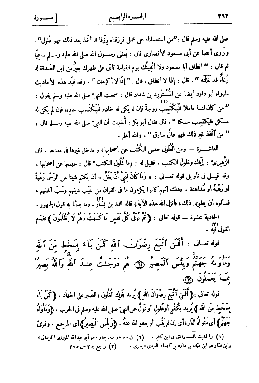 صَلَّى اللَّهُ عَلَيْهِ وَسَلَّمَ قَالَ: (مَنِ اسْتَعْمَلْنَاهُ عَلَى عَمَلٍ فَرَزَقْنَاهُ رِزْقًا فَمَا أَخَذَ بَعْدَ ذَلِكَ فَهُوَ غُلُولٌ). وَرَوَى أَيْضًا عَنْ أَبِي مَسْعُودٍ الْأَنْصَارِيِّ قَالَ: بَعَثَنِي رَسُولُ اللَّهِ صَلَّى اللَّهُ عَلَيْهِ وَسَلَّمَ سَاعِيًا ثُمَّ قَالَ: (انْطَلِقْ أَبَا مَسْعُودٍ وَلَا أُلْفِيَنَّكَ يَوْمَ الْقِيَامَةِ تَأْتِي عَلَى ظَهْرِكَ بَعِيرٌ مِنْ إِبِلِ الصَّدَقَةِ لَهُ رُغَاءٌ قَدْ غَلَلْتَهُ (. قَالَ: إِذًا لَا أَنْطَلِقُ. قَالَ:) إِذًا لَا أُكْرِهُكَ (. وَقَدْ قَيَّدَ هَذِهِ الْأَحَادِيثَ مَا رَوَاهُ أَبُو دَاوُدَ أَيْضًا عَنِ الْمُسْتَوْرِدِ بْنِ شَدَّادٍ قَالَ: سَمِعْتُ النَّبِيَّ صَلَّى اللَّهُ عَلَيْهِ وَسَلَّمَ يَقُولُ: (مَنْ كَانَ لَنَا عَامِلًا فَلْيَكْتَسِبْ «١» زَوْجَةً فَإِنْ لَمْ يَكُنْ لَهُ خَادِمٌ فَلْيَكْتَسِبْ خَادِمًا فَإِنْ لَمْ يَكُنْ لَهُ مَسْكَنٌ فَلْيَكْتَسِبْ مَسْكَنًا (. قَالَ فَقَالَ أَبُو بَكْرٍ: أُخْبِرْتُ أَنَّ النَّبِيَّ صَلَّى اللَّهُ عَلَيْهِ وَسَلَّمَ قَالَ:) مَنِ اتَّخَذَ غَيْرَ ذَلِكَ فَهُوَ غَالٌّ سَارِقٌ (. وَاللَّهُ أَعْلَمُ. الْعَاشِرَةُ- وَمِنَ الْغُلُولِ حَبْسُ الْكُتُبِ عَنْ أَصْحَابِهَا، وَيَدْخُلُ غَيْرُهَا فِي مَعْنَاهَا. قَالَ الزُّهْرِيُّ: إِيَّاكَ وَغُلُولَ الْكُتُبِ. فَقِيلَ لَهُ: وَمَا غُلُولُ الْكُتُبِ؟ قَالَ: حَبْسُهَا عَنْ أَصْحَابِهَا. وَقَدْ قِيلَ فِي تَأْوِيلِ قَوْلِهِ تَعَالَى:" وَما كانَ لِنَبِيٍّ أَنْ يَغُلَّ" أَنْ يَكْتُمَ شَيْئًا مِنَ الْوَحْيِ رَغْبَةً أَوْ رَهْبَةً أَوْ مُدَاهَنَةً. وَذَلِكَ أَنَّهُمْ كَانُوا يَكْرَهُونَ مَا فِي الْقُرْآنِ مِنْ عَيْبِ دِينِهِمْ وَسَبِّ آلِهَتِهِمْ، فَسَأَلُوهُ أَنْ يَطْوِيَ ذَلِكَ، فَأَنْزَلَ اللَّهُ هَذِهِ الْآيَةَ، قَالَهُ مُحَمَّدُ بْنُ بَشَّارٍ «٢». وَمَا بَدَأْنَا بِهِ قَوْلُ الْجُمْهُورِ. الْحَادِيَةَ عَشْرَةَ- قَوْلُهُ تَعَالَى: (ثُمَّ تُوَفَّى كُلُّ نَفْسٍ مَا كَسَبَتْ وَهُمْ لَا يُظْلَمُونَ) تقدم القول فيه «٣».