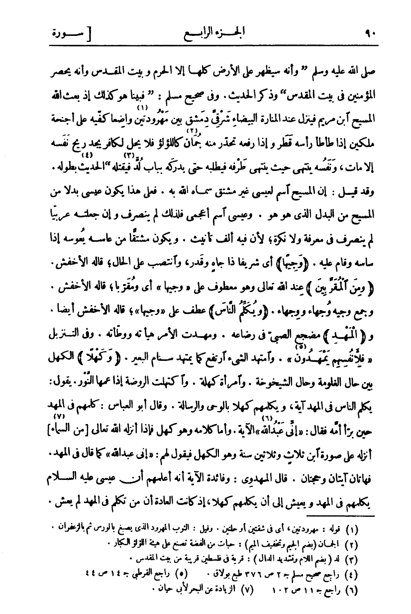 صَلَّى اللَّهُ عَلَيْهِ وَسَلَّمَ (وَأَنَّهُ سَيَظْهَرُ عَلَى الأرض كلها إلا الحرم وبئت الْمَقْدِسِ وَأَنَّهُ يَحْصُرُ الْمُؤْمِنِينَ فِي بَيْتِ الْمَقْدِسِ). وَذَكَرَ الْحَدِيثَ. وَفِي صَحِيحِ مُسْلِمٍ: (فَبَيْنَا هُوَ كَذَلِكَ إِذْ بَعَثَ اللَّهُ الْمَسِيحَ ابْنَ، مَرْيَمَ فَيَنْزِلُ عِنْدَ الْمَنَارَةِ الْبَيْضَاءِ شَرْقِيَّ دِمَشْقَ بَيْنَ مَهْرُودَتَيْنِ «١» وَاضِعًا كَفَّيْهِ عَلَى أَجْنِحَةِ مَلَكَيْنِ إِذَا طَأْطَأَ رَأْسَهُ قَطَرَ وَإِذَا رَفَعَهُ تَحَدَّرَ مِنْهُ جُمَانٌ «٢» كَاللُّؤْلُؤِ فَلَا يَحِلُّ لِكَافِرٍ يَجِدُ رِيحَ نَفَسِهِ إِلَّا مَاتَ، وَنَفَسُهُ يَنْتَهِي حَيْثُ يَنْتَهِي طَرْفُهُ فَيَطْلُبُهُ حَتَّى يُدْرِكَهُ بِبَابٍ لُدٍّ فَيَقْتُلُهُ («٣» الْحَدِيثَ «٤» بِطُولِهِ. وَقَدْ قِيلَ: إِنَّ الْمَسِيحَ اسْمٌ لِعِيسَى غَيْرُ مُشْتَقٍّ سَمَّاهُ اللَّهُ بِهِ. فَعَلَى هَذَا يَكُونُ عِيسَى بَدَلًا مِنَ الْمَسِيحِ مِنَ الْبَدَلِ الَّذِي هُوَ هُوَ. وَعِيسَى اسْمٌ أَعْجَمِيٌّ فَلِذَلِكَ لَمْ يَنْصَرِفْ وَإِنْ جَعَلْتَهُ عَرَبِيًّا لَمْ يَنْصَرِفْ فِي مَعْرِفَةٍ وَلَا نَكِرَةٍ، لِأَنَّ فِيهِ أَلِفَ. تَأْنِيثٍ. وَيَكُونُ مُشْتَقًّا مِنْ عَاسَهُ يَعُوسُهُ إِذَا سَاسَهُ وَقَامَ عَلَيْهِ. (وَجِيهاً) أَيْ شَرِيفًا ذَا جَاهٍ وَقَدْرٍ، وَانْتَصَبَ عَلَى الْحَالِ، قَالَهُ الْأَخْفَشُ. (وَمِنَ الْمُقَرَّبِينَ) عِنْدَ اللَّهِ تَعَالَى وَهُوَ مَعْطُوفٌ عَلَى" وَجِيهاً" أَيْ وَمُقَرَّبًا، قَالَهُ الْأَخْفَشُ. وَجَمْعُ وَجِيهٍ وُجَهَاءُ وَوِجْهَاءُ. (وَيُكَلِّمُ النَّاسَ) عَطْفٌ عَلَى" وَجِيهاً" قَالَهُ الْأَخْفَشُ أَيْضًا. وَ (الْمَهْدِ) مَضْجَعُ الصَّبِيِّ فِي رَضَاعِهِ. وَمَهَّدْتُ الْأَمْرَ هَيَّأْتُهُ ووطأته. وفي التنزيل" فَلِأَنْفُسِهِمْ يَمْهَدُونَ" [الروم: ٤٤] «٥». وَامْتَهَدَ الشَّيْءُ ارْتَفَعَ كَمَا يُمْتَهَدُ سَنَامُ الْبَعِيرِ. (وَكَهْلًا) الْكَهْلُ بَيْنَ حَالِ الْغُلُومَةِ وَحَالِ الشَّيْخُوخَةِ. وَامْرَأَةٌ كَهْلَةٌ. وَاكْتَهَلَتِ الرَّوْضَةُ إِذَا عَمَّهَا النُّورُ. يَقُولُ: يُكَلِّمُ النَّاسَ فِي الْمَهْدِ آيَةً، وَيُكَلِّمُهُمْ كَهْلًا بِالْوَحْيِ وَالرِّسَالَةِ. وَقَالَ أَبُو الْعَبَّاسِ: كَلَّمَهُمْ فِي الْمَهْدِ حِينَ بَرَّأَ أُمَّهُ فَقَالَ:" إِنِّي عَبْدُ اللَّهِ" [مريم: ٣٠] «٦» الآية. وأما كلامه وهو كهل فإذا أنزل اللَّهُ تَعَالَى [مِنَ السَّمَاءِ] «٧» أَنْزَلَهُ عَلَى صُورَةِ ابْنِ ثَلَاثٍ وَثَلَاثِينَ سَنَةً وَهُوَ الْكَهْلُ فَيَقُولُ لَهُمْ:" إِنِّي عَبْدُ اللَّهِ" كَمَا قَالَ فِي الْمَهْدِ. فَهَاتَانِ آيَتَانِ وَحُجَّتَانِ. قَالَ الْمَهْدَوِيُّ: وَفَائِدَةُ الْآيَةِ أَنَّهُ أَعْلَمَهُمْ أَنَّ عِيسَى عَلَيْهِ السَّلَامُ يُكَلِّمُهُمْ فِي الْمَهْدِ وَيَعِيشُ إِلَى أَنْ يُكَلِّمَهُمْ كَهْلًا، إِذْ كَانَتِ الْعَادَةُ أَنَّ مَنْ تَكَلَّمَ في المهد لم يعش.