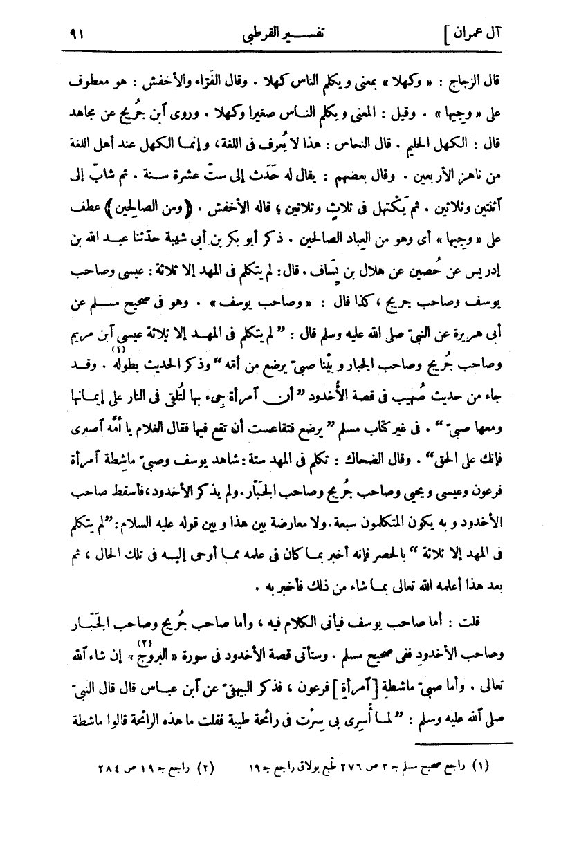 قَالَ الزَّجَّاجُ:" وَكَهْلًا" بِمَعْنَى وَيُكَلِّمُ النَّاسَ كَهْلًا. وَقَالَ الْفَرَّاءُ وَالْأَخْفَشُ: هُوَ مَعْطُوفٌ عَلَى" وَجِيهاً". وَقِيلَ: الْمَعْنَى وَيُكَلِّمُ النَّاسَ صَغِيرًا وَكَهْلًا. وَرَوَى ابن جريح عَنْ مُجَاهِدٍ قَالَ: الْكَهْلُ الْحَلِيمُ. قَالَ النَّحَّاسُ: هَذَا لَا يُعْرَفُ فِي اللُّغَةِ، وَإِنَّمَا الْكَهْلُ عِنْدَ أَهْلِ اللُّغَةِ مَنْ نَاهَزَ الْأَرْبَعِينَ. وَقَالَ بَعْضُهُمْ: يُقَالُ لَهُ حَدَثٌ إِلَى سِتَّ عَشْرَةَ سَنَةً. ثُمَّ شَابٌّ إِلَى اثْنَتَيْنِ وَثَلَاثِينَ. ثُمَّ يَكْتَهِلُ فِي ثَلَاثٍ وَثَلَاثِينَ، قَالَهُ الْأَخْفَشُ. (وَمِنَ الصَّالِحِينَ) عَطْفٌ عَلَى" وَجِيهاً" أَيْ وَهُوَ مِنَ الْعُبَّادِ الصَّالِحِينَ. ذَكَرَ أَبُو بَكْرِ بْنُ أَبِي شَيْبَةَ حَدَّثَنَا عَبْدُ اللَّهِ بْنُ إِدْرِيسَ عَنْ حُصَيْنٍ عَنْ هِلَالِ بْنِ يِسَافَ. قَالَ: لَمْ يَتَكَلَّمْ فِي الْمَهْدِ إِلَّا ثَلَاثَةٌ: عِيسَى وَصَاحِبُ يُوسُفَ وَصَاحِبُ جُرَيْجٍ، كَذَا قَالَ:" وَصَاحِبُ يُوسُفَ". وَهُوَ فِي صَحِيحِ مُسْلِمٍ عَنْ أَبِي هُرَيْرَةَ عَنِ النَّبِيِّ صَلَّى اللَّهُ عَلَيْهِ وَسَلَّمَ قَالَ: (لَمْ يَتَكَلَّمْ فِي الْمَهْدِ إِلَّا ثَلَاثَةٌ عِيسَى ابْنُ مَرْيَمَ وَصَاحِبُ جُرَيْجٍ وَصَاحِبُ الْجَبَّارِ وَبَيْنَا صَبِيٌّ يَرْضَعُ مِنْ أُمِّهِ) وَذَكَرَ الْحَدِيثَ، بِطُولِهِ «١». وَقَدْ جَاءَ مِنْ حَدِيثِ صُهَيْبٍ فِي قِصَّةِ الأخدود (أن امرأة جئ بِهَا لِتُلْقَى فِي النَّارِ عَلَى إِيمَانِهَا وَمَعَهَا صَبِيٌّ). فِي غَيْرِ كِتَابِ مُسْلِمٍ (يَرْضَعُ فَتَقَاعَسَتْ أَنْ تَقَعَ فِيهَا فَقَالَ الْغُلَامُ يَا أُمَّهُ اصْبِرِي فَإِنَّكِ عَلَى الْحَقِّ). وَقَالَ الضَّحَّاكُ: تَكَلَّمَ فِي الْمَهْدِ سِتَّةٌ: شَاهِدُ يُوسُفَ وَصَبِيُّ مَاشِطَةِ امْرَأَةِ فِرْعَوْنَ وَعِيسَى وَيَحْيَى وَصَاحِبُ جُرَيْجٍ وَصَاحِبُ الجبار. ولم يذكر الأخدود، فأسقط صاحب لاخدود وَبِهِ يَكُونُ الْمُتَكَلِّمُونَ سَبْعَةً. وَلَا مُعَارَضَةَ بَيْنَ هَذَا وَبَيْنَ قَوْلِهِ عَلَيْهِ السَّلَامُ: (لَمْ يَتَكَلَّمْ فِي الْمَهْدِ إِلَّا ثَلَاثَةٌ) بِالْحَصْرِ فَإِنَّهُ أَخْبَرَ بِمَا كَانَ فِي عِلْمِهِ مِمَّا أُوحِيَ إِلَيْهِ فِي تِلْكَ الْحَالِ، ثُمَّ بَعْدَ هَذَا أَعْلَمَهُ اللَّهُ تَعَالَى بِمَا شَاءَ مِنْ ذَلِكَ فَأَخْبَرَ بِهِ. قُلْتُ: أَمَّا صَاحِبُ يُوسُفَ فَيَأْتِي الْكَلَامُ فِيهِ، وَأَمَّا صَاحِبُ جُرَيْجٍ وَصَاحِبُ الْجَبَّارِ وَصَاحِبُ الْأُخْدُودِ فَفِي صَحِيحِ مُسْلِمٍ. وَسَتَأْتِي قِصَّةُ الْأُخْدُودِ فِي سُورَةِ" الْبُرُوجِ" «٢» إِنْ شَاءَ اللَّهُ تَعَالَى. وَأَمَّا صَبِيُّ مَاشِطَةِ [امْرَأَةِ] فِرْعَوْنَ، فَذَكَرَ الْبَيْهَقِيُّ عَنِ ابْنِ عَبَّاسٍ قَالَ قَالَ النَّبِيُّ صَلَّى اللَّهُ عَلَيْهِ وَسَلَّمَ: (لَمَّا أُسْرِيَ بِي سِرْتُ فِي رَائِحَةٍ طَيِّبَةٍ فَقُلْتُ مَا هَذِهِ الرَّائِحَةُ قالوا ماشطة