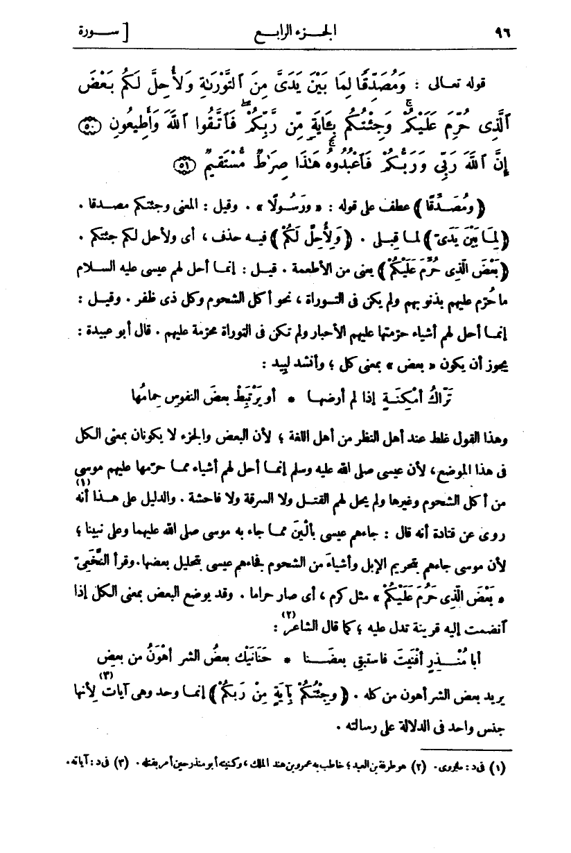 قَوْلُهُ تعالى: وَمُصَدِّقاً لِما بَيْنَ يَدَيَّ مِنَ التَّوْراةِ وَلِأُحِلَّ لَكُمْ بَعْضَ الَّذِي حُرِّمَ عَلَيْكُمْ وَجِئْتُكُمْ بِآيَةٍ مِنْ رَبِّكُمْ فَاتَّقُوا اللَّهَ وَأَطِيعُونِ (٥٠) إِنَّ اللَّهَ رَبِّي وَرَبُّكُمْ فَاعْبُدُوهُ هَذَا صِراطٌ مُسْتَقِيمٌ (٥١) (وَمُصَدِّقاً) عَطْفٌ عَلَى قَوْلِهِ:" وَرَسُولًا". وَقِيلَ: الْمَعْنَى وَجِئْتُكُمْ مُصَدِّقًا. (لِما بَيْنَ يَدَيَّ) لِمَا قَبْلِي. (وَلِأُحِلَّ لَكُمْ) فيه حذف، أي ولا حل لَكُمْ جِئْتُكُمْ. (بَعْضَ الَّذِي حُرِّمَ عَلَيْكُمْ) يَعْنِي مِنَ الْأَطْعِمَةِ. قِيلَ: إِنَّمَا أَحَلَّ لَهُمْ عِيسَى عَلَيْهِ السَّلَامُ مَا حُرِّمَ عَلَيْهِمْ بِذُنُوبِهِمْ وَلَمْ يَكُنْ فِي التَّوْرَاةِ، نَحْوَ أَكْلِ الشُّحُومِ وَكُلِّ ذِي ظُفُرٍ. وَقِيلَ: إِنَّمَا أَحَلَّ لَهُمْ أَشْيَاءَ حَرَّمَتْهَا عَلَيْهِمُ الْأَحْبَارُ وَلَمْ تَكُنْ فِي التَّوْرَاةِ مُحَرَّمَةً عَلَيْهِمْ. قَالَ أَبُو عُبَيْدَةَ: يَجُوزُ أَنْ يَكُونَ" بَعْضَ" بِمَعْنَى كُلٍّ، وَأَنْشَدَ لَبِيدٌ:
