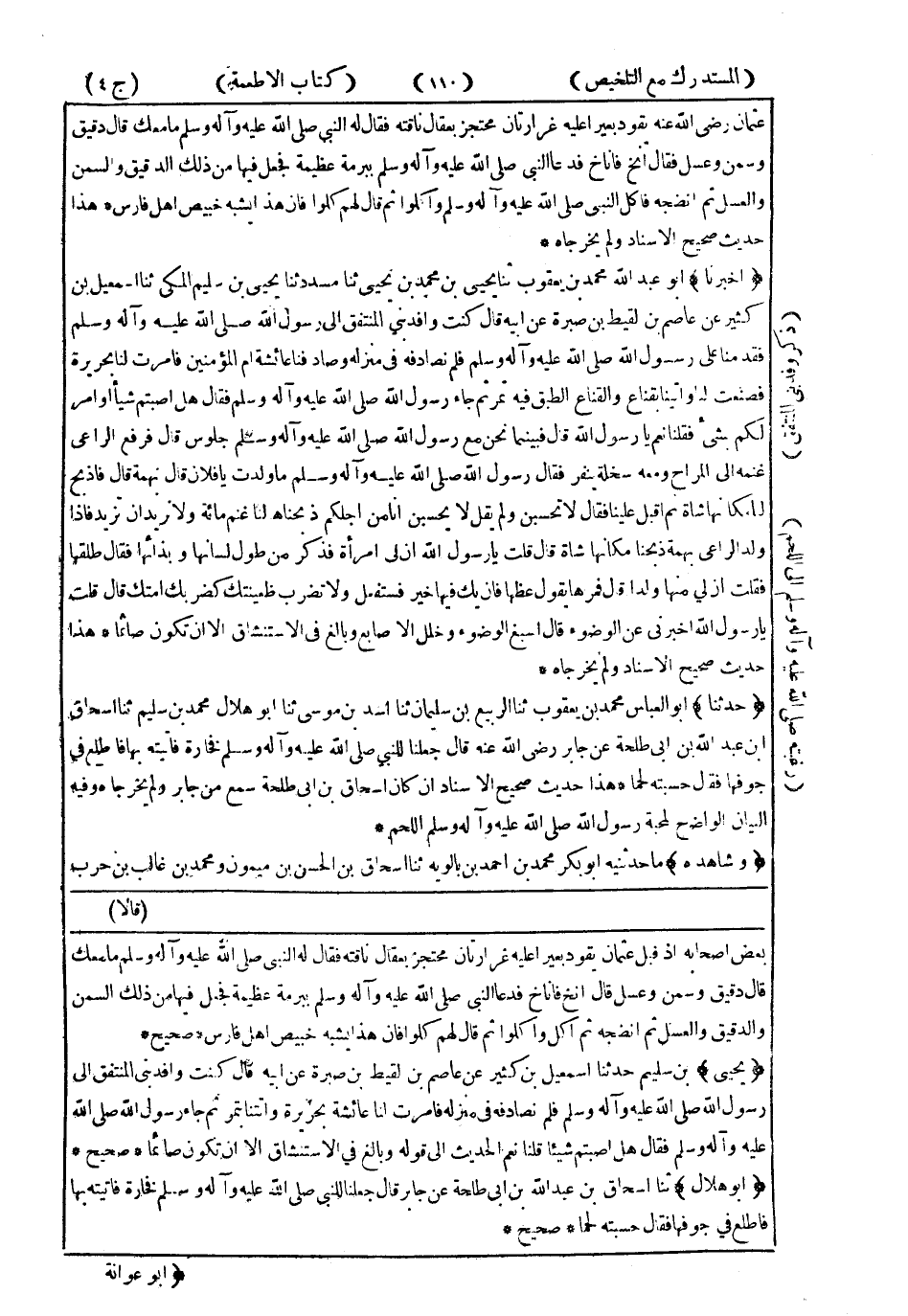 هَذَا حَدِيثٌ صَحِيحُ الإِسْنَادِ إِنْ كَانَ إِسْحَاقُ بْنُ أَبِي طَلْحَةَ سَمِعَ مِنْ جَابِرٍ وَلَمْ يُخَرِّجَاهُ وَفِيهِ الْبَيَانُ الْوَاضِحُ لِمَحَبَّةِ رَسُولِ اللهِ صَلَّى اللَّهُ عَلَيْهِ وَسَلَّمَ اللَّحْمَ.