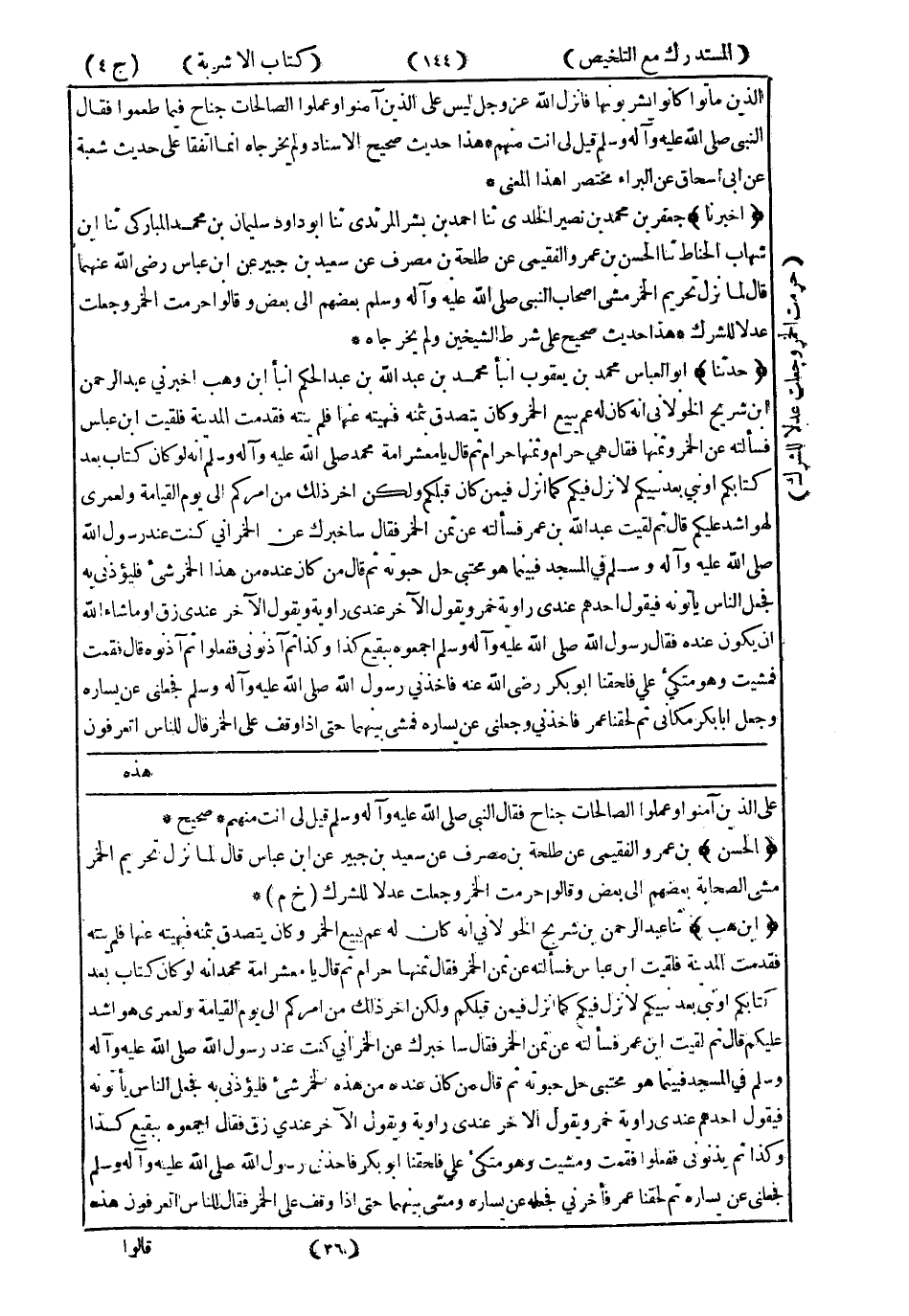 7227- أَخْبَرَنَا جَعْفَرُ بْنُ مُحَمَّدِ بْنِ نُصَيْرٍ الْخُلْدِيُّ ، حَدَّثَنَا أَحْمَدُ بْنُ بِشْرٍ الْمَرْثَدِيُّ ، حَدَّثَنَا أَبُو دَاوُدَ سُلَيْمَانُ بْنُ مُحَمَّدٍ الْمُبَارَكِيُّ ، حَدَّثَنَا أَبُو شِهَابٍ الْحَنَّاطُ ، حَدَّثَنَا الْحَسَنُ بْنُ عَمْرٍو الْفُقَيْمِيُّ ، عَنْ طَلْحَةَ بْنِ مُصَرِّفٍ ، عَنْ سَعِيدِ بْنِ جُبَيْرٍ ، عَنِ ابْنِ عَبَّاسٍ ، رَضِيَ اللَّهُ عَنْهُمَا ، قَالَ : لَمَّا نَزَلَ تَحْرِيمُ الْخَمْرِ مَشَى أَصْحَابُ النَّبِيِّ صَلَّى اللَّهُ عَلَيْهِ وَسَلَّمَ بَعْضُهُمْ إِلَى بَعْضٍ وَقَالُوا : حُرِّمَتِ الْخَمْرُ وَجُعِلَتْ عِدْلاً لِلشِّرْكِ.