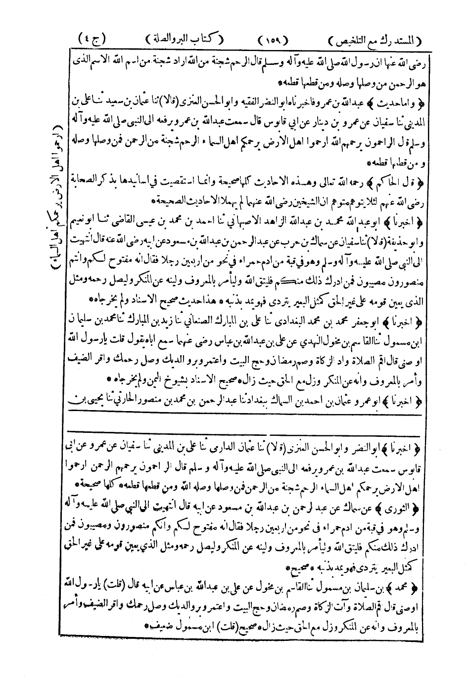 قَالَ الْحَاكِمُ رَحِمَهُ اللَّهُ تَعَالَى : وَهَذِهِ الأَحَادِيثُ كُلُّهَا صَحِيحَةٌ وَإِنَّمَا اسْتَقْصَيْتُ فِي أَسَانِيدِهَا بِذِكْرِ الصَّحَابَةِ رَضِيَ اللَّهُ عَنْهُمْ لِئَلاَ يَتَوَهَّمَ مُتَوَهِّمٌ أَنَّ الشَّيْخَيْنِ رَضِيَ اللَّهُ عَنْهُمَا لَمْ يَهْمِلاَ الأَحَادِيثَ الصَّحِيحَةَ.