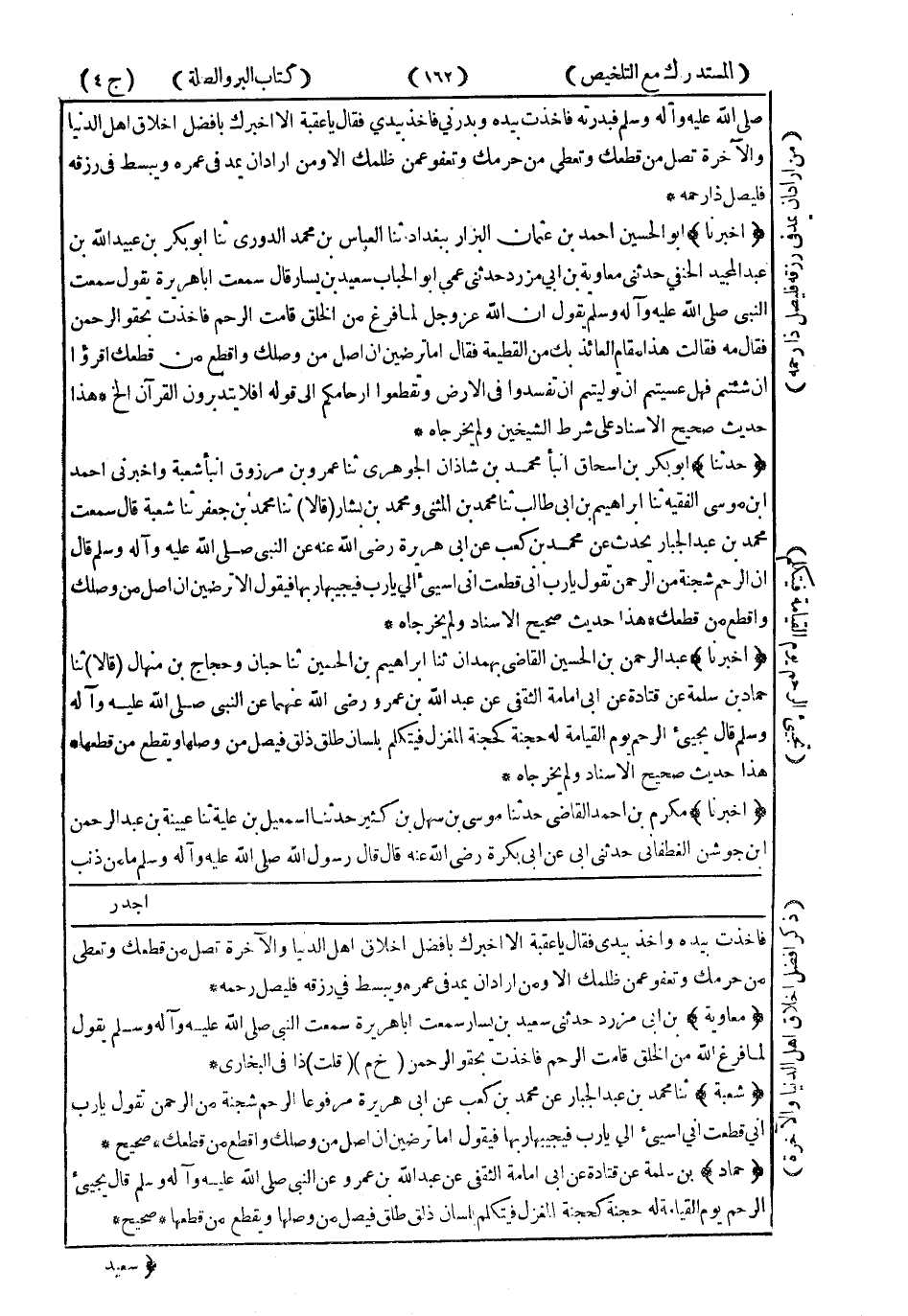 7286- أَخْبَرَنَا أَبُو الْحُسَيْنِ أَحْمَدُ بْنُ عُثْمَانَ الْبَزَّازُ ، بِبَغْدَادَ ، حَدَّثَنَا الْعَبَّاسُ بْنُ مُحَمَّدٍ الدُّورِيُّ ، حَدَّثَنَا أَبُو بَكْرِ بْنُ عُبَيْدِ اللهِ بْنِ عَبْدِ الْمَجِيدِ الْحَنَفِيُّ ، حَدَّثَنِي مُعَاوِيَةُ بْنُ أَبِي مُزَرِّدٍ ، حَدَّثَنِي عَمِّي أَبُو الْحُبَابِ سَعِيدُ بْنُ يَسَارٍ ، قَالَ : سَمِعْتُ أَبَا هُرَيْرَةَ ، يَقُولُ : سَمِعْتُ النَّبِيَّ صَلَّى اللَّهُ عَلَيْهِ وَسَلَّمَ يَقُولُ : إِنَّ اللَّهَ عَزَّ وَجَلَّ لَمَّا فَرَغَ مِنَ الْخَلْقِ قَامَتِ الرَّحِمُ فَأَخَذَتْ بِحَقْوِ الرَّحْمَنِ فَقَالَ : مَهْ ، فَقَالَتْ : هَذَا مَقَامُ الْعَائِذِ بِكَ مِنَ الْقَطِيعَةِ . فَقَالَ : أَمَا تَرْضَيْنَ أَنْ أَصِلَ مَنْ وَصَلَكِ وَأَقْطَعَ مَنْ قَطَعَكِ اقْرَءُوا إِنْ شِئْتُمْ {فَهَلْ عَسَيْتُمْ إِنْ تَوَلَّيْتُمْ أَنْ تُفْسِدُوا فِي الأَرْضِ وَتُقَطِّعُوا أَرْحَامَكُمْ} إِلَى قَوْلِهِ : {أَفَلاَ يَتَدَبَّرُونَ الْقُرْآنَ} إلخ.