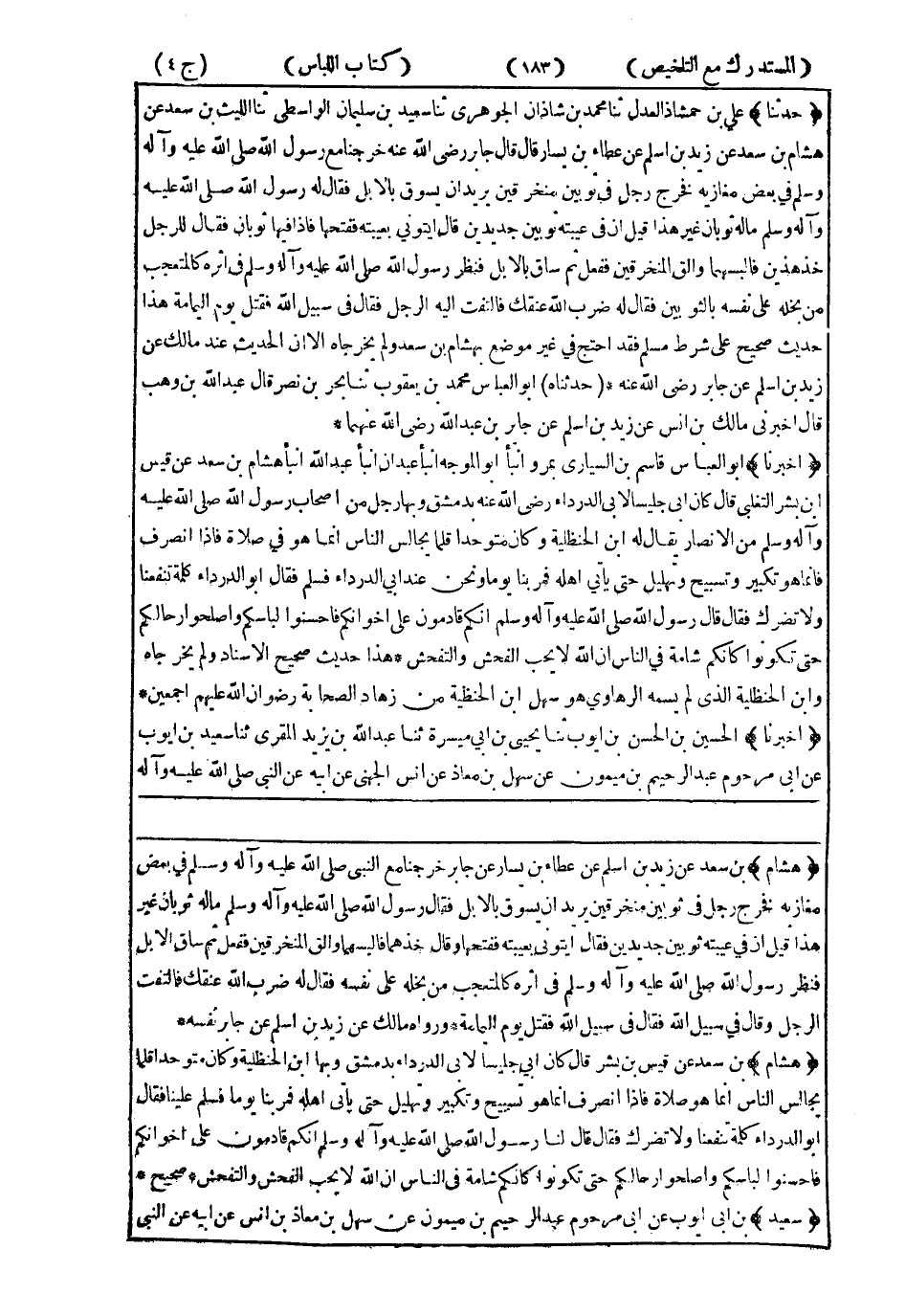 7369- حَدَّثَنَا عَلِيُّ بْنُ حَمْشَاذَ الْعَدْلُ ، حَدَّثَنَا مُحَمَّدُ بْنُ شَاذَانَ الْجَوْهَرِيُّ ، حَدَّثَنَا سَعِيدُ بْنُ سُلَيْمَانَ الْوَاسِطِيُّ ، حَدَّثَنَا اللَّيْثُ بْنُ سَعْدٍ ، عَنْ هِشَامِ بْنِ سَعْدٍ ، عَنْ زَيْدِ بْنِ أَسْلَمَ ، عَنْ عَطَاءِ بْنِ يَسَارٍ ، قَالَ : قَالَ جَابِرٌ ، رَضِيَ اللَّهُ عَنْهُ : خَرَجْنَا مَعَ رَسُولِ اللهِ صَلَّى اللَّهُ عَلَيْهِ وَسَلَّمَ فِي بَعْضِ مَغَازِيهِ فَخَرَجَ رَجُلٌ فِي ثَوْبَيْنِ مُنْخَرِقَيْنِ يُرِيدُ أَنْ يَسُوقَ بِالإِبِلِ فَقَالَ لَهُ رَسُولُ اللهِ صَلَّى اللَّهُ عَلَيْهِ وَسَلَّمَ : مَا لَهُ ثَوْبَانِ غَيْرُ هَذَا ؟ قِيلَ : إِنَّ فِي عَيْبَتِهِ ثَوْبَيْنِ جَدِيدَيْنِ . قَالَ : إِيتُونِي بِعَيْبَتِهِ فَفَتَحَهَا فَإِذَا فِيهَا ثَوْبَانِ فَقَالَ لِلرَّجُلِ : خُذْ هَذَيْنِ فَالْبَسْهُمَا وَأَلْقِ الْمُنْخَرِقَيْنِ فَفَعَلَ ثُمَّ سَاقَ بِالإِبِلِ فَنَظَرَ رَسُولُ اللهِ صَلَّى اللَّهُ عَلَيْهِ وَسَلَّمَ فِي أَثَرِهِ كَالْمُتَعَجِّبِ مِنْ بُخْلِهِ عَلَى نَفْسِهِ بِالثَّوْبَيْنِ فَقَالَ لَهُ : ضَرَبَ اللَّهُ عُنُقَكَ فَالْتَفَتَ إِلَيْهِ الرَّجُلُ فَقَالَ : فِي سَبِيلِ اللهِ ، فَقُتِلَ يَوْمِ الْيَمَامَةِ.