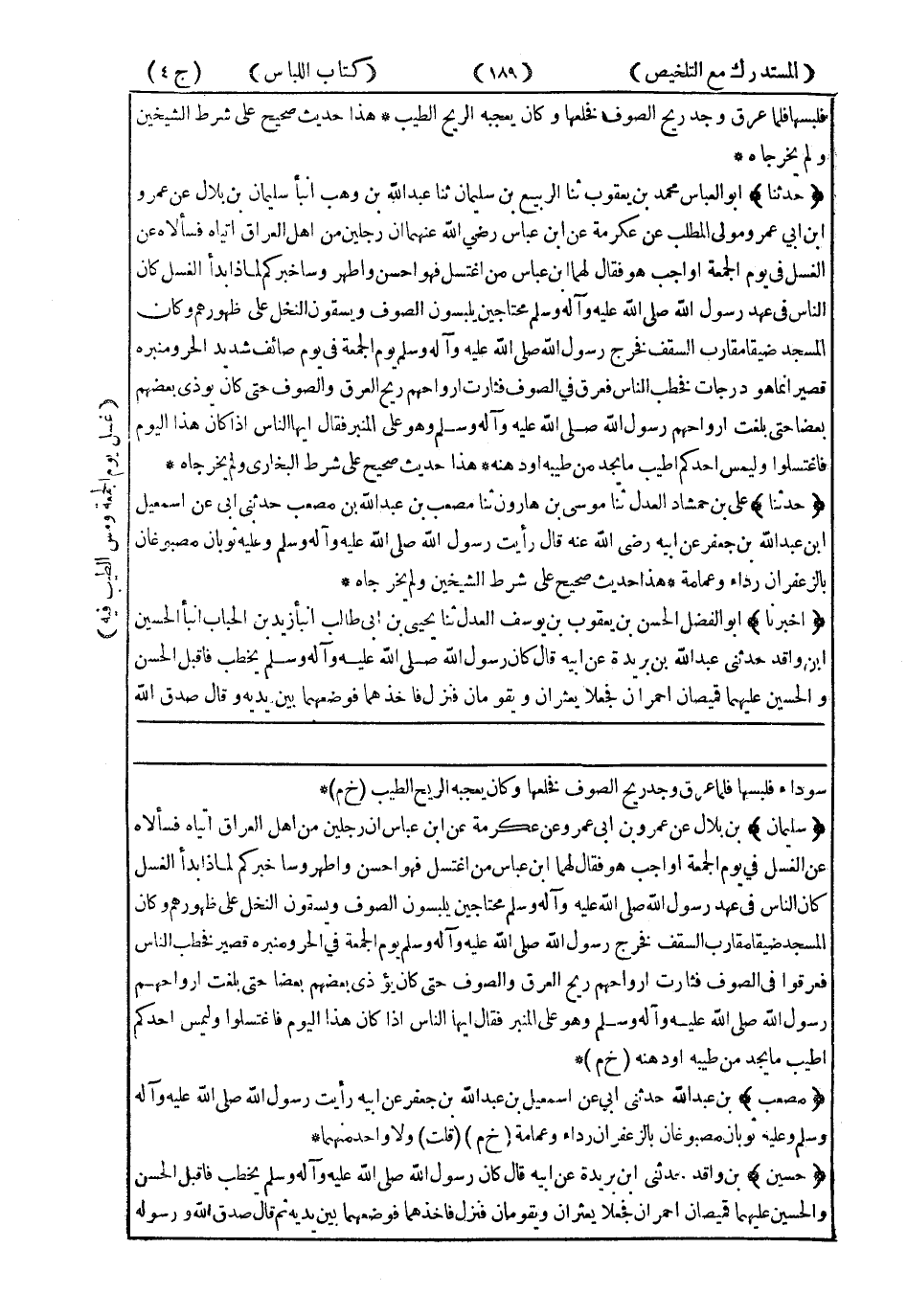 7394- حَدَّثَنَا أَبُو الْعَبَّاسِ مُحَمَّدُ بْنُ يَعْقُوبَ ، حَدَّثَنَا الرَّبِيعُ بْنُ سُلَيْمَانَ ، حَدَّثَنَا عَبْدُ اللهِ بْنُ وَهْبٍ ، أَنْبَأَ سُلَيْمَانُ بْنُ بِلاَلٍ ، عَنْ عَمْرِو بْنِ أَبِي عَمْرٍو ، مَوْلَى الْمُطَّلِبِ عَنْ عِكْرِمَةَ ، عَنِ ابْنِ عَبَّاسٍ ، رَضِيَ اللَّهُ عَنْهُمَا أَنَّ رَجُلَيْنِ مِنْ أَهْلِ الْعِرَاقِ أَتَيَاهُ فَسَأَلاَهُ عَنِ الْغُسْلِ فِي يَوْمِ الْجُمُعَةِ أَوَاجِبٌ هُوَ ؟ فَقَالَ لَهُمَا ابْنُ عَبَّاسٍ : مَنِ اغْتَسَلَ فَهُوَ أَحْسَنُ وَأَطْهَرُ وَسَأُخْبِرُكُمْ لِمَاذَا بَدَأَ الْغُسْلَ كَانَ النَّاسُ فِي عَهْدِ رَسُولِ اللهِ صَلَّى اللَّهُ عَلَيْهِ وَسَلَّمَ مُحْتَاجِينَ يَلْبَسُونَ الصُّوفَ وَيَسْقُونَ النَّخْلَ عَلَى ظُهُورِهِمْ وَكَانَ الْمَسْجِدُ ضَيِّقًا مُقَارِبَ السَّقْفِ فَخَرَجَ رَسُولُ اللهِ صَلَّى اللَّهُ عَلَيْهِ وَسَلَّمَ يَوْمَ الْجُمُعَةِ فِي يَوْمٍ صَائِفٍ شَدِيدِ الْحَرِّ وَمِنْبَرُهُ قَصِيرٌ إِنَّمَا هُوَ دَرَجَاتٌ فَخَطَبَ النَّاسَ فَعَرِقَ فِي الصُّوفِ فَثَارَتْ أَرْوَاحُهُمْ رِيحَ الْعَرَقِ وَالصُّوفِ حَتَّى كَانَ يُؤْذِي بَعْضُهُمْ بَعْضًا حَتَّى بَلَغَتْ أَرْوَاحُهُمْ رَسُولَ اللهِ صَلَّى اللَّهُ عَلَيْهِ وَسَلَّمَ وَهُوَ عَلَى الْمِنْبَرِ فَقَالَ : أَيُّهَا النَّاسُ إِذَا كَانَ هَذَا الْيَوْمُ فَاغْتَسِلُوا وَلْيَمَسَّ أَحَدُكُمْ أَطْيَبَ مَا يَجِدُ مِنْ طِيبِهِ أَوْ دُهْنِهِ.