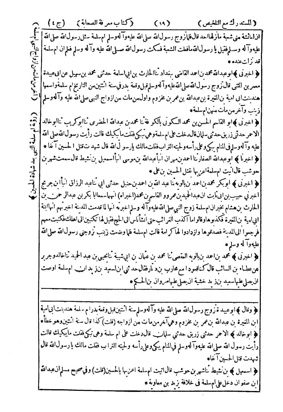 6764- أَخْبَرَنِي أَبُو الْقَاسِمِ الْحَسَنُ بْنُ مُحَمَّدٍ السَّكُونِيُّ ، بِالْكُوفَةِ ، حَدَّثَنَا مُحَمَّدُ بْنُ عَبْدِ اللهِ الْحَضْرَمِيُّ ، حَدَّثَنَا أَبُو كُرَيْبٍ ، حَدَّثَنَا أَبُو خَالِدٍ الأَحْمَرُ ، حَدَّثَنِي رَزِينٌ ، حَدَّثَتْنِي سَلْمَى قَالَتْ : دَخَلْتُ عَلَى أُمِّ سَلَمَةَ ، وَهِيَ تَبْكِي فَقُلْتُ : مَا يُبْكِيكِ ؟ قَالَتْ : رَأَيْتُ رَسُولَ اللهِ صَلَّى اللَّهُ عَلَيْهِ وَسَلَّمَ فِي الْمَنَامِ يَبْكِي وَعَلَى رَأْسِهِ وَلِحْيَتِهِ التُّرَابُ ، فَقُلْتُ : مَا لَكَ يَا رَسُولَ اللهِ ؟ قَالَ : شَهِدْتُ قَتْلَ الْحُسَيْنِ آنِفًا.