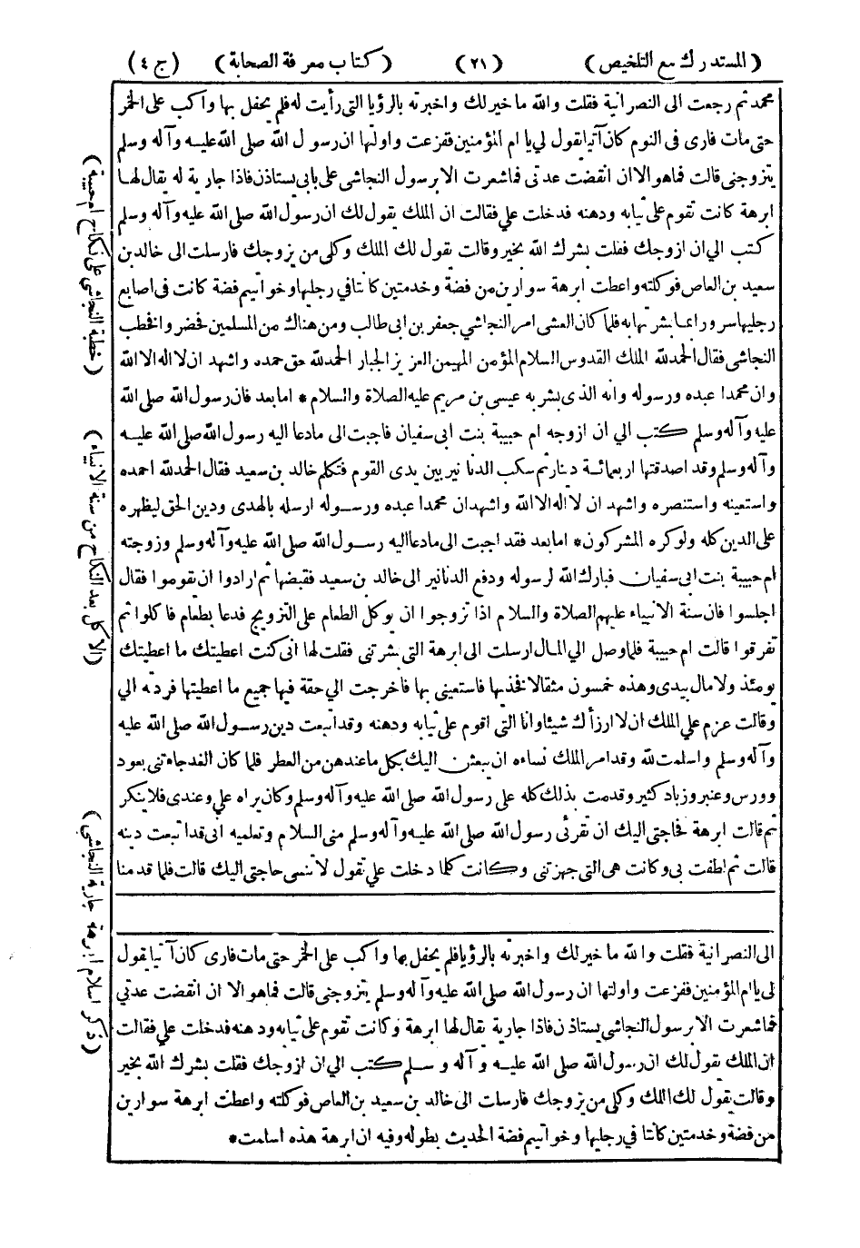 أَمَّا بَعْدُ فَقَدْ أَجَبْتُ إِلَى مَا دَعَا إِلَيْهِ رَسُولُ اللهِ صَلَّى اللَّهُ عَلَيْهِ وَسَلَّمَ وَزَوَّجْتُهُ أُمَّ حَبِيبَةَ بِنْتَ أَبِي سُفْيَانَ فَبَارَكَ اللَّهُ لِرَسُولِهِ ، وَدَفَعَ الدَّنَانِيرَ إِلَى خَالِدِ بْنِ سَعِيدٍ فَقَبَضَهَا ، ثُمَّ أَرَادُوا أَنْ يَقُومُوا ، فَقَالَ : اجْلِسُوا فَإِنَّ سُنَّةَ الأَنْبِيَاءِ عَلَيْهِمُ الصَّلاَةُ وَالسَّلاَمُ إِذَا تَزَوَّجُوا أَنْ يُؤْكَلَ الطَّعَامُ عَلَى التَّزْوِيجِ فَدَعَا بِطَعَامٍ فَأَكَلُوا ، ثُمَّ تَفَرَّقُوا ، قَالَتْ أُمُّ حَبِيبَةَ : فَلَمَّا وَصَلَ إِلَيَّ الْمَالُ أَرْسَلْتُ إِلَى أَبْرَهَةَ الَّتِي بَشَّرَتْنِي فَقُلْتُ لَهَا : إِنِّي كُنْتُ أَعْطَيْتُكِ مَا أَعْطَيْتُكِ يَوْمَئِذٍ وَلاَ مَالَ بِيَدِي وَهَذِهِ خَمْسُونَ مِثْقَالاً فَخُذِيهَا فَاسْتَعِينِي بِهَا ، فَأَخْرَجَتْ إِلَيَّ حِقَّةً فِيهَا جَمِيعُ مَا أَعْطَيتُهَا فَرَدَّتْهُ إِلَيَّ وَقَالَتْ : عَزَمَ عَلَيَّ الْمَلِكُ أَنْ لاَ أَرْزَأَكِ شَيْئًا وَأَنَا الَّتِي أَقُومُ عَلَى ثِيَابِهِ وَدَهْنِهِ وَقَدِ اتَّبَعْتُ دِينَ رَسُولِ اللهِ صَلَّى اللَّهُ عَلَيْهِ وَسَلَّمَ وَأَسْلَمْتُ لِلَّهِ ، وَقَدْ أَمَرَ الْمَلِكُ نِسَاءَهُ أَنْ يَبْعَثْنَ إِلَيْكِ بِكَلِّ مَا عِنْدَهُنَّ مِنَ الْعِطْرِ ، فَلَمَّا كَانَ الْغَدُ جَاءَتْنِي بِعُودٍ وَوَرْسٍ وَعَنْبَرٍ وزَبَادٍ كَثِيرٍ ، وَقَدِمْتُ بِذَلِكَ كُلِّهِ عَلَى رَسُولِ اللهِ صَلَّى اللَّهُ عَلَيْهِ وَسَلَّمَ وَكَانَ يَرَاهُ عَلَيَّ وَعِنْدِي فَلاَ يُنْكِرُ ، ثُمَّ قَالَتْ أَبْرَهَةُ : فَحَاجَتِي إِلَيْكِ أَنْ تُقْرِئِي رَسُولَ اللهِ صَلَّى اللَّهُ عَلَيْهِ وَسَلَّمَ مِنِّي السَّلاَمَ وَتُعْلِمِيهِ أَنِّي قَدِ اتَّبَعْتُ دِينَهُ ، قَالَتْ : ثُمَّ لَطَفَتْ بِي وَكَانَتْ هِيَ الَّتِي جَهَّزَتْنِي ، وَكَانَتْ كُلَّمَا دَخَلَتْ عَلَيَّ تَقُولُ : لاَ تَنْسَيْ حَاجَتِي إِلَيْكِ ، قَالَتْ : فَلَمَّا قَدِمْنَا عَلَى رَسُولِ اللهِ صَلَّى اللَّهُ عَلَيْهِ وَسَلَّمَ أَخْبَرْتُهُ كَيْفَ كَانَتِ الْخِطْبَةُ وَمَا فَعَلَتْ بِي أَبْرَهَةُ ، فَتَبَسَّمَ رَسُولُ اللهِ صَلَّى اللَّهُ عَلَيْهِ وَسَلَّمَ وَأَقْرَأْتُهُ مِنْهَا السَّلاَمَ ، فَقَالَ : وَعَلَيْهَا السَّلاَمُ وَرَحْمَةُ اللهِ وَبَرَكَاتُهُ.