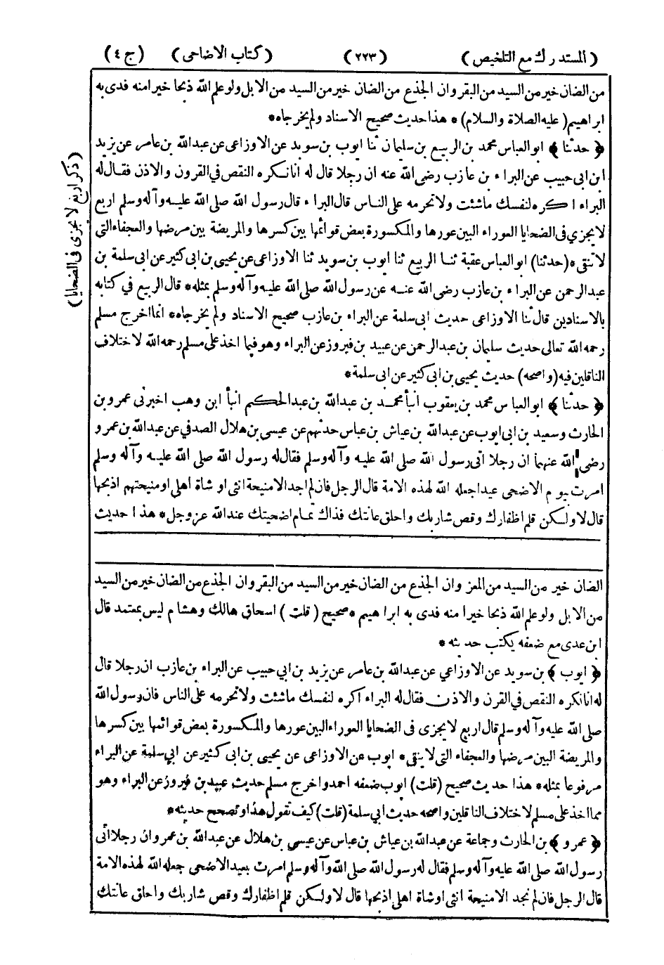 7527- حَدَّثَنَا أَبُو الْعَبَّاسِ مُحَمَّدُ بْنُ الرَّبِيعِ بْنِ سُلَيْمَانَ ، حَدَّثَنَا أَيُّوبُ بْنُ سُوَيْدٍ ، عَنِ الأَوْزَاعِيِّ ، عَنْ عَبْدِ اللهِ بْنِ عَامِرٍ ، عَنْ يَزِيدَ بْنِ أَبِي حَبِيبٍ ، عَنِ الْبَرَاءِ بْنِ عَازِبٍ ، رَضِيَ اللَّهُ عَنْهُ أَنَّ رَجُلاً قَالَ لَهُ : إِنَّا نَكْرَهُ النَّقْصَ فِي الْقُرُونِ وَالآذُنِ ، فَقَالَ لَهُ الْبَرَاءُ : اكْرَهْ لِنَفْسِكَ مَا شِئْتَ وَلاَ تُحَرِّمْهُ عَلَى النَّاسِ . قَالَ الْبَرَاءُ : قَالَ رَسُولُ اللهِ صَلَّى اللَّهُ عَلَيْهِ وَسَلَّمَ : أَرْبَعٌ لاَ يَجْزِي فِي الضَّحَايَا : الْعَوْرَاءُ الْ بَيِّنُ عَوَرُهَا ، وَالْمَكْسُورَةُ بَعْضُ قَوَائِمِهَا بَيِّنٌ كَسْرُهَا ، وَالْمَرِيضَةُ بَيِّنٌ مَرَضُهَا ، وَالْعَجْفَاءُ الَّتِي لاَ تَنْقَى.