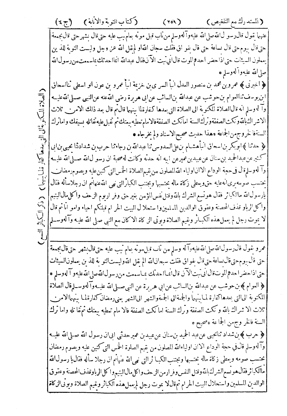 7666- حَدَّثَنَا أَبُو بَكْرِ بْنُ إِسْحَاقَ ، أَنْبَأَ هِشَامُ بْنُ عَلِيٍّ السَّدُوسِيُّ ، حَدَّثَنَا عَبْدُ اللهِ بْنُ رَجَاءٍ ، حَدَّثَنَا حَرْبُ بْنُ شَدَّادٍ ، حَدَّثَنَا يَحْيَى بْنُ أَبِي كَثِيرٍ ، عَنْ عَبْدِ الْحَمِيدِ بْنِ سِنَانٍ ، عَنْ عُبَيْدِ بْنِ عُمَيْرٍ ، عَنْ أَبِيهِ ، أَنَّهُ حَدَّثَهُ وَكَانَتْ لَهُ صُحْبَةٌ أَنَّ رَسُولَ اللهِ صَلَّى اللَّهُ عَلَيْهِ وَسَلَّمَ قَالَ فِي حَجَّةِ الْوَدَاعِ : أَلاَ إِنَّ أَوْلِيَاءَ اللهِ الْمُصَلُّونَ مَنْ يُقِيمُ الصَّلاَةَ الْخَمْسَ الَّتِي كُتِبْنَ عَلَيْهِ ، وَيَصُومُ رَمَضَانَ يَحْتَسِبُ صَوْمَهُ يَرَى أَنَّهُ عَلَيْهِ حَقٌّ ، وَيُعْطِي زَكَاةَ مَالِهِ يَحْتَسِبُهَا ، وَيَجْتَنِبُ الْكَبَائِرَ الَّتِي نَهَى اللَّهُ عَنْهَا ثُمَّ إِنَّ رَجُلاً سَأَلَهُ فَقَالَ : يَا رَسُولَ اللهِ ، مَا الْكَبَائِرُ ؟ فَقَالَ : هِيَ تِسْعٌ : الشِّرْكُ بِاللَّهِ ، وَقَتْلُ نَفْسِ الْمُؤْمِنِ بِغَيْرِ حَقٍّ ، وَفِرَارٌ يَوْمَ الزَّحْفِ ، وَأَكْلُ مَالِ الْيَتِيمِ ، وَأَكْلُ الرِّبَا ، وَقَذْفُ الْمُحْصَنَةِ ، وَعُقُوقُ الْوَالِدَيْنِ الْمُسْلِمَيْنِ ، وَاسْتِحْلاَلُ الْبَيْتِ الْحَرَامِ قِبْلَتِكُمْ أَحْيَاءً وَأَمْوَاتًا ثُمَّ قَالَ : لاَ يَمُوتُ رَجُلٌ لَمْ يَعْمَلْ هَذِهِ الْكَبَائِرَ وَيُقِيمُ الصَّلاَةَ وَيُؤْتِي الزَّكَاةَ إِلاَّ كَانَ مَعَ النَّبِيِّ صَلَّى اللَّهُ عَلَيْهِ وَسَلَّمَ فِي دَارٍ أَبْوَابُهَا مَصَارِيعُ مِنْ ذَهَبٍ.
