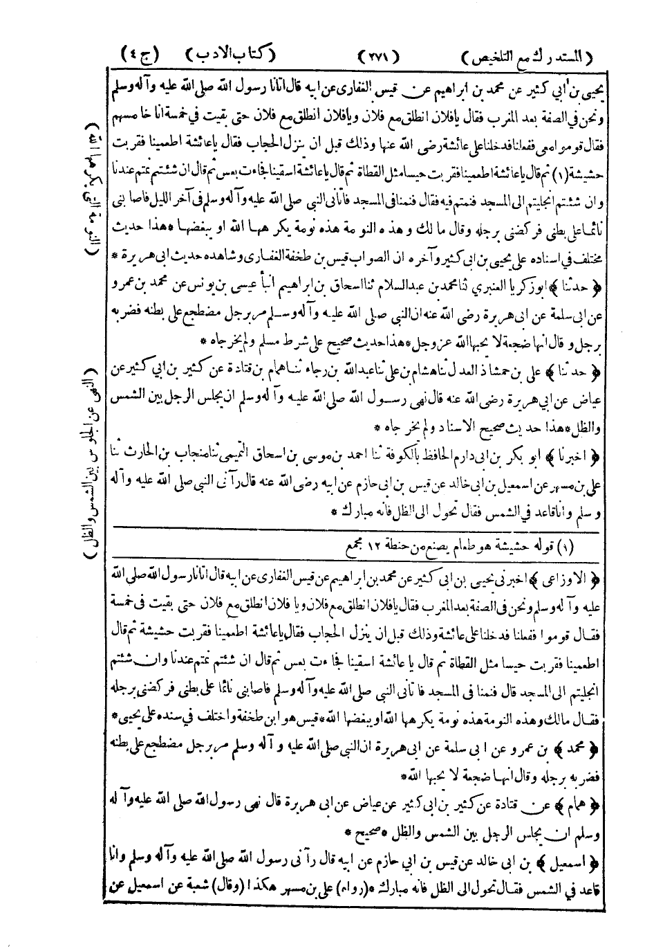 7710- حَدَّثَنَا عَلِيُّ بْنُ حَمْشَاذَ الْعَدْلُ ، حَدَّثَنَا هِشَامُ بْنُ عَلِيٍّ ، حَدَّثَنَا عَبْدُ اللهِ بْنُ رَجَاءٍ ، حَدَّثَنَا هَمَّامٌ ، عَنْ قَتَادَةَ ، عَنْ كَثِيرِ بْنِ أَبِي كَثِيرِ ، عَنْ عِيَاضٍ ، عَنْ أَبِي هُرَيْرَةَ ، رَضِيَ اللَّهُ عَنْهُ ، قَالَ : نَهَى رَسُولُ اللهِ صَلَّى اللَّهُ عَلَيْهِ وَسَلَّمَ أَنْ يَجْلِسَ الرَّجُلُ بَيْنَ الشَّمْسِ وَالظِّلِّ.