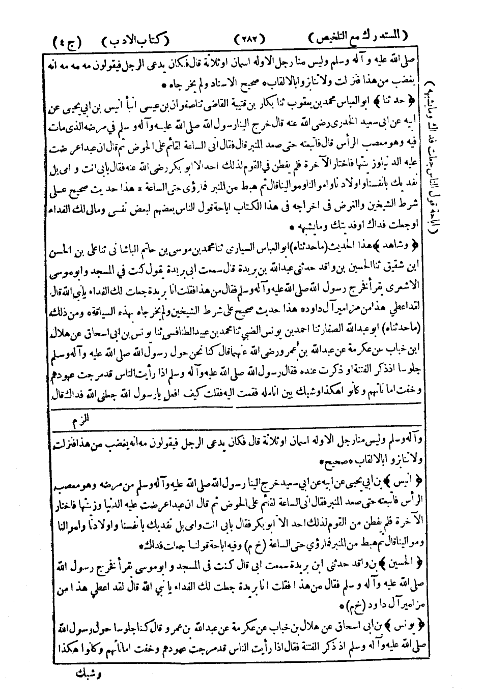 7758- مَا حَدَّثَنَاهُ أَبُو عَبْدِ اللهِ الصَّفَّارُ ، حَدَّثَنَا أَحْمَدُ بْنُ يُونُسَ الضَّبِّيُّ ، حَدَّثَنَا مُحَمَّدُ بْنُ عُبَيْدٍ الطَّنَافِسِيُّ ، حَدَّثَنَا يُونُسُ بْنُ أَبِي إِسْحَاقَ ، عَنْ هِلاَلِ بْنِ خَبَّابٍ ، عَنْ عِكْرِمَةَ ، عَنْ عَبْدِ اللهِ بْنِ عَمْرٍو ، رَضِيَ اللَّهُ عَنْهُمَا قَالَ : كُنَّا نَحْنُ حَوْلَ رَسُولِ اللهِ صَلَّى اللَّهُ عَلَيْهِ وَسَلَّمَ جُلُوسًا إِذْ ذَكَرَ الْفِتْنَةَ أَوْ ذُكِرَتْ عِنْدَهُ ، فَقَالَ رَسُولُ اللهِ صَلَّى اللَّهُ عَلَيْهِ وَسَلَّمَ : إِذَا رَأَيْتَ النَّاسَ قَدْ مَرِجَتْ عُهُودُهُمْ وَخَفَّتْ أَمَانَاتُهُمْ وَكَانُوا هَكَذَا وَشَبَّكَ بَيْنَ أَنَامِلِهِ ، فَقُمْتُ إِلَيْهِ فَقُلْتُ : كَيْفَ أَفْعَلُ يَا رَسُولَ اللهِ ، جَعَلَنِي اللَّهُ فِدَاكَ ؟ قَالَ : الْزَمْ بَيْتَكَ وَامْلِكْ عَلَيْكَ لِسَانَكَ وَخُذْ مَا تَعْرِفُ وَدَعْ مَا تُنْكِرُ وَعَلَيْكَ بِخَاصَّةِ أَمْرِ نَفْسِكَ وَدَعْ عَنْكَ أَمْرَ الْعَامَّةِ.