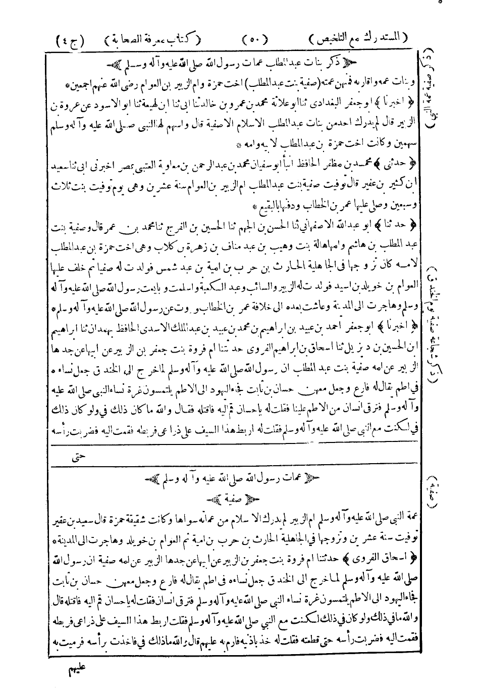 6865- حَدَّثَنَا أَبُو عَبْدِ اللهِ الأَصْفَهَانِيُّ ، حَدَّثَنَا الْحَسَنُ بْنُ الْجَهْمِ ، حَدَّثَنَا الْحُسَيْنُ بْنُ الْفَرَجِ ، حَدَّثَنَا مُحَمَّدُ بْنُ عُمَرَ ، قَالَ : وَصَفِيَّةُ بِنْتُ عَبْدِ الْمُطَّلِبِ بْنِ هَاشِمٍ وَأُمُّهَا هَالَةُ بِنْتُ وُهَيْبِ بْنِ عَبْدِ مَنَافِ بْنِ زُهْرَةَ بْنِ كِلاَبٍ ، وَهِيَ أُخْتُ حَمْزَةَ بْنِ عَبْدِ الْمُطَّلِبِ لِأُمِّهِ ، كَانَ تَزَوَّجَهَا فِي الْجَاهِلِيَّةِ الْحَارِثُ بْنُ حَرْبِ بْنِ أُمَيَّةَ بْنِ عَبْدِ شَمْسٍ ، فَوَلَدَتْ لَهُ صَفِيًّا ، ثُمَّ خَلَفَ عَلَيْهَا الْعَوَّامُ بْنُ خُوَيْلِدِ بْنِ أُسَيْدٍ ، فَوَلَدَتْ لَهُ الزُّبَيْرَ وَالسَّائِبَ وَعَبْدَ الْكَعْبَةِ ، وَأَسْلَمَتْ وَبَايَعَتْ رَسُولَ اللهِ صَلَّى اللَّهُ عَلَيْهِ وَسَلَّمَ وَهَاجَرَتْ إِلَى الْمَدِينَةِ ، وَعَاشَتْ بَعْدَهُ إِلَى خِلاَفَةِ عُمَرَ بْنِ الْخَطَّابِ ، وَرَوَتْ عَنْ رَسُولِ اللهِ صَلَّى اللَّهُ عَلَيْهِ وَسَلَّمَ.