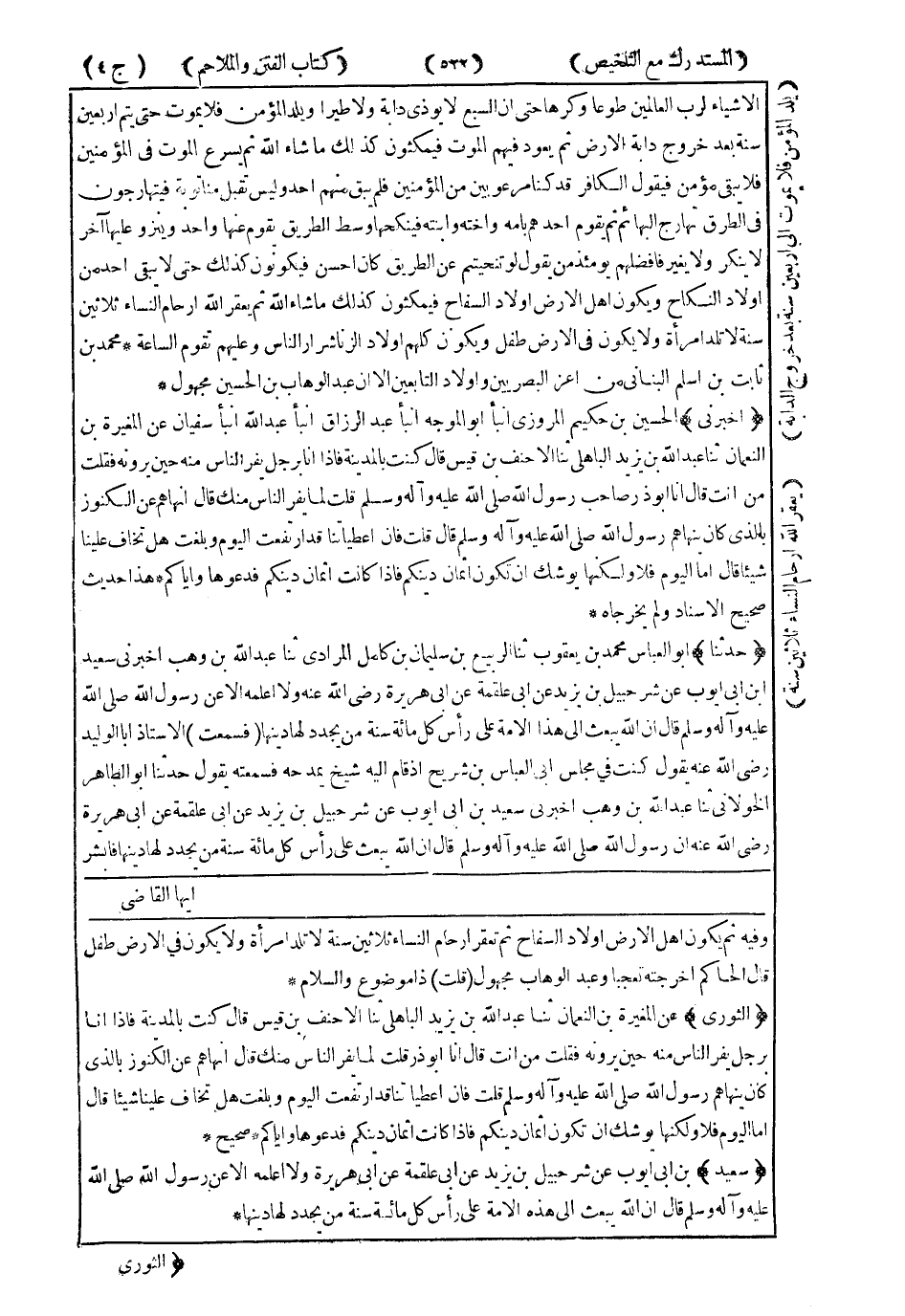 8593- فَسَمِعْتُ الآسْتَاذَ أَبَا الْوَلِيدِ رَضِيَ اللَّهُ عَنْهُ ، يَقُولُ : كُنْتُ فِي مَجْلِسِ أَبِي الْعَبَّاسِ بْنِ شُرَيْحٍ إِذْ قَامَ إِلَيْهِ شَيْخٌ يَمْدَحُهُ ، فَسَمِعْتُهُ يَقُولُ : حَدَّثَنَا أَبُو الطَّاهِرِ الْخَوْلاَنِيُّ ، حَدَّثَنَا عَبْدُ اللهِ بْنُ وَهْبٍ ، أَخْبَرَنِي سَعِيدُ بْنُ أَبِي أَيُّوبَ ، عَنْ شَرَاحِيلَ بْنِ يَزِيدَ ، عَنْ أَبِي عَلْقَمَةَ ، عَنْ أَبِي هُرَيْرَةَ رَضِيَ اللَّهُ عَنْهُ ، أَنَّ رَسُولَ اللهِ صَلَّى اللَّهُ عَلَيْهِ وَسَلَّمَ ، قَالَ : إِنَّ اللَّهَ يَبْعَثُ عَلَى رَأْسِ كُلِّ مِائَةِ سَنَةٍ مَنْ يُجَدِّدُ لَهَا دِينَهَا فَأَبْشِرْ أَيُّهَا الْقَاضِي