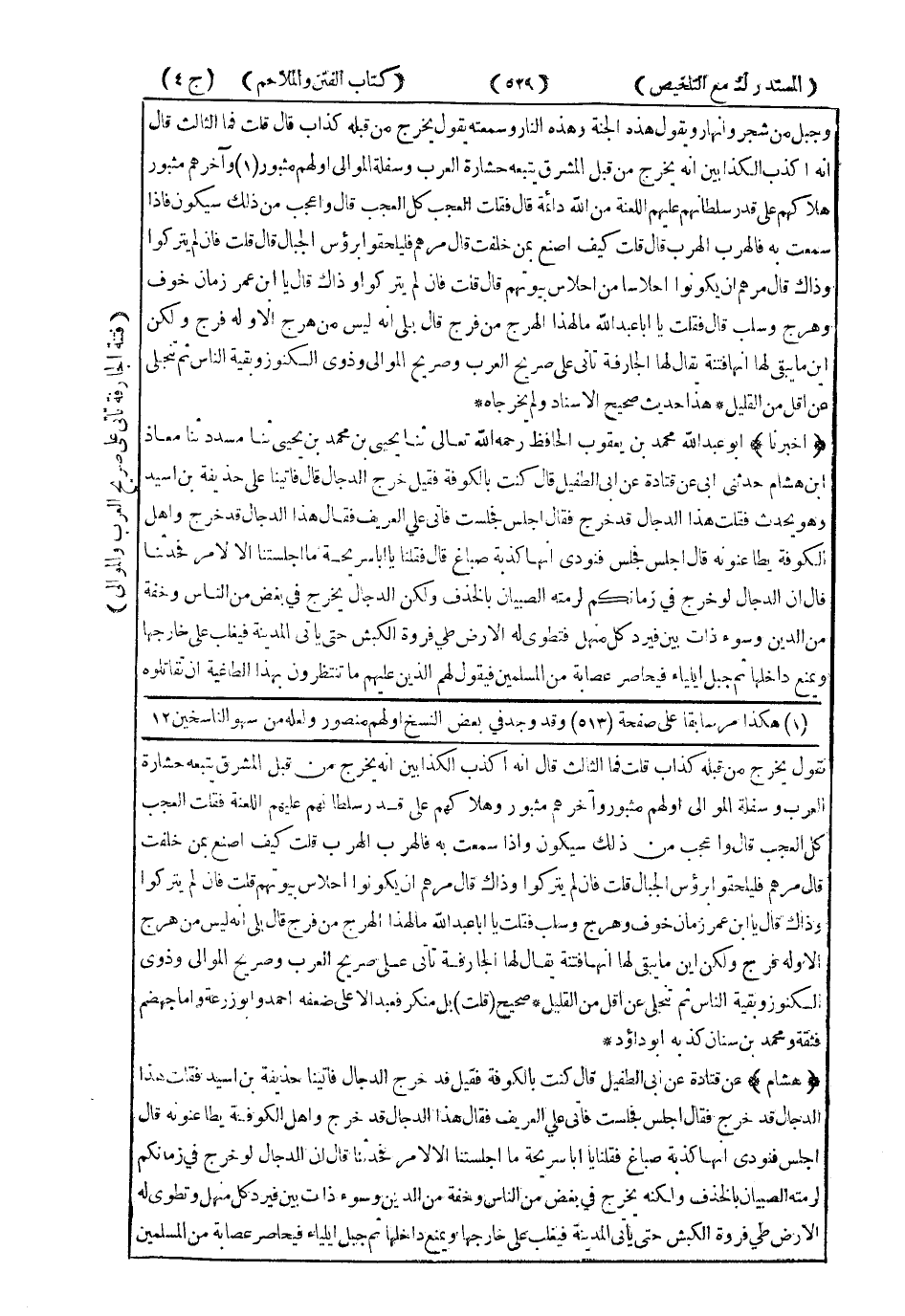 8612- أَخْبَرَنَا أَبُو عَبْدِ اللهِ مُحَمَّدُ بْنُ يَعْقُوبَ الْحَافِظُ رَحِمَهُ اللَّهُ تَعَالَى ، حَدَّثَنَا يَحْيَى بْنُ مُحَمَّدِ بْنِ يَحْيَى ، حَدَّثَنَا مُسَدَّدٌ ، حَدَّثَنَا مُعَاذُ بْنُ هِشَامٍ ، حَدَّثَنِي أَبِي ، عَنْ قَتَادَةَ ، عَنْ أَبِي الطُّفَيْلِ ، قَالَ : كُنْتُ بِالْكُوفَةِ ، فَقِيلَ : خَرَجَ الدَّجَّالُ ، قَالَ : فَأَتَيْنَا عَلَى حُذَيْفَةَ بْنِ أَسِيدٍ وَهُوَ يُحَدِّثُ ، فَقُلْتُ : هَذَا الدَّجَّالُ قَدْ خَرَجَ ، فَقَالَ : اجْلِسْ ، فَجَلَسْتُ فَأَتَى عَلَيَّ الْعَرِّيفُ ، فَقَالَ : هَذَا الدَّجَّالُ قَدْ خَرَجَ وَأَهْلُ الْكُوفَةِ يُطَاعِنُونَهُ ، قَالَ : اجْلِسْ ، فَجَلَسْتُ فَنُودِيَ إِنَّهَا كَذِبَةٌ صَبَاغٌ ، قَالَ : فَقُلْنَا يَا أَبَا سَرِيحَةَ مَا أَجْلَسْتَنَا إِلاَّ لِأَمْرٍ فَحَدِّثْنَا ، قَالَ : إِنَّ الدَّجَّالَ لَوْ خَرَجَ فِي زَمَانِكُمْ لَرَمَتْهُ الصِّبْيَانُ بِالْخَذْفِ ، وَلَكِنَّ الدَّجَّالَ يَخْرُجُ فِي بُغْضٍ مِنَ النَّاسِ ، وَخِفَّةٍ مِنَ الدِّينِ ، وَسُوءِ ذَاتِ بَيْنٍ ، فَيَرِدُ كُلَّ مَنْهَلٍ ، فَتُطْوَى لَهُ الأَرْضُ طَيَّ فَرْوَةِ الْكَبْشِ حَتَّى يَأْتِيَ الْمَدِينَةَ ، فَيَغْلِبُ عَلَى خَارِجِهَا وَيَمْنَعُ دَاخَلَهَا ، ثُمَّ جَبَلَ إِيلِيَاءَ فَيُحَاصِرُ عِصَابَةً مِنَ الْمُسْلِمِينَ ، فَيَقُولُ لَهُمُ الَّذِينَ عَلَيْهِمْ مَا تَنْتَظِرُونَ بِهَذَا الطَّاغِيَةِ أَنْ تُقَاتِلُوهُ حَتَّى تَلْحَقُوا بِاللَّهِ أَوْ يُفْتَحَ لَكُمْ ، فَيَأْتَمِرُونَ أَنْ يُقَاتِلُوهُ إِذَا أَصْبَحُوا ، فَيُصْبِحُونَ وَمَعَهُمْ عِيسَى ابْنُ مَرْيَمَ فَيَقْتُلُ الدَّجَّالَ وَيَهْزِمُ أَصْحَابَهُ ، حَتَّى إِنَّ الشَّجَرَ وَالْحَجَرَ وَالْمَدَرَ ، يَقُولُ : يَا مُؤْمِنُ هَذَا يَهُودِيٌّ عِنْدِي فَاقْتُلْهُ ، قَالَ : وَفِيهِ ثَلاَثُ عَلاَمَاتٍ : هُوَ أَعْوَرُ وَرَبُّكُمْ لَيْسَ بِأَعْوَرَ ، وَمَكْتُوبٌ بَيْنَ عَيْنَيْهِ كَافِرٌ يَقْرَأُهُ كُلُّ مُؤْمِنٍ أُمِّيٌّ وَكَاتِبٌ ، وَلاَ يُسَخَّرُ لَهُ مِنَ الْمَطَايَا إِلاَّ الْحِمَارُ ، فَهُوَ رِجْسٌ عَلَى رِجْسٍ ، ثُمَّ قَالَ : أَنَا لِغَيْرِ الدَّجَّالِ أَخْوَفُ عَلَيَّ وَعَلَيْكُمْ ، قَالَ : فَقُلْنَا : مَا هُوَ يَا أَبَا سَرِيحَةَ ؟ قَالَ : فِتَنٌ كَأَنَّهَا قِطَعُ اللَّيْلِ الْمُظْلِمِ ، قَالَ : فَقُلْنَا : أَيُّ النَّاسِ فِيهَا شَرٌّ ؟ قَالَ : كُلُّ خَطِيبٍ مُصْقِعٍ ، وَكُلُّ رَاكِبٍ مُوضِعٍ ، قَالَ : فَقُلْنَا : أَيُّ النَّاسِ فِيهَا خَيْرٌ ؟ قَالَ : كُلُّ غَنِيٍّ خَفِيٍّ ، قَالَ : فَقُلْتُ : مَا أَنَا بِالْغَنِيِّ وَلاَ بِالْخَفِيِّ ، قَالَ : فَكُنْ كَابْنِ اللَّبُونِ لاَ ظَهْرَ فَيُرْكَبَ ، وَلاَ ضَرْعَ فَيُحْلَبَ.