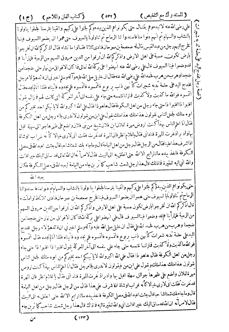 لاَ تَبْدَأُوهُمْ بِقِتَالٍ حَتَّى يَكُونُوا هُمُ الَّذِينَ يَبْدَأُوكُمْ ، فَجَثَوْا عَلَى رُكَبِهِمْ وَاتَّقَيْنَا بُتُرُسِنَا فَجَعَلُوا يُنَاوِلُونَا بِالنُّشَّابِ وَالسِّهَامِ ، ثُمَّ إِنَّهُمْ دَنَوْا مِنَّا فَأَسْنَدُوا لَنَا الرَّمَّاحَ ، ثُمَّ تَنَاوَلُونَا بِالسُّيُوفِ حَتَّى هَمُّوا أَنْ يَضَعُوا السُّيُوفَ فِينَا ، فَخَرَجَ إِلَيْهِمْ رَجُلٌ مِنْ عَبْدِ الْقَيْسِ يُقَالُ لَهُ : صَعْصَعَةُ بْنُ صُوحَانَ ، فَنَادَى ثَلاَثًا فَقَالُوا : مَا تَشَاءُ ؟ فَقَالَ : أُذَكِّرُكُمُ اللَّهَ أَنْ تَخْرُجُوا بِأَرْضٍ تَكُونُ مَسَبَّةً عَلَى أَهْلِ الأَرْضِ ، وَأُذَكِّرُكُمُ اللَّهَ أَنْ تَمْرُقُوا مِنَ الدِّينِ مُرُوقَ السَّهْمِ مِنَ الرَّمِيَّةِ ، فَلَمَّا رَأَيْنَاهُمْ قَدْ وَضَعُوا فِينَا السُّيُوفَ ، قَالَ عَلِيٌّ رَضِيَ اللَّهُ عَنْهُ : انْهَضُوا عَلَى بَرَكَةِ اللهِ تَعَالَى فَمَا كَانَ إِلاَّ فُوَاقٌ مِنْ نَهَارٍ حَتَّى ضَجَعْنَا مَنْ ضَجَعْنَا وَهَرَبَ مَنْ هَرَبَ فَحَمِدَ اللَّهَ عَلِيٌّ رَضِيَ اللَّهُ عَنْهُ ، فَقَالَ : إِنَّ خَلِيلِي صَلَّى اللَّهُ عَلَيْهِ وَسَلَّمَ أَخْبَرَنِي أَنَّ قَائِدَ هَؤُلاَءِ رَجُلٌ مُخَدَّجُ الْيَدِ عَلَى حَلَمَةِ ثَدْيِهِ شُعَيْرَاتٌ كَأَنَّهُنَّ ذَنَبُ يَرْبُوعٍ فَالْتَمِسُوهُ ، فَالْتَمَسُوهُ فَلَمْ يَجِدُوهُ ، فَأَتَيْنَاهُ فَقُلْنَا : إِنَّا لَمْ نَجِدْهُ ، فَقَالَ : الْتَمِسُوهُ فَوَاللَّهِ مَا كَذَبْتُ وَلاَ كُذِبْتُ فَمَا زِلْنَا نَلْتَمِسُهُ حَتَّى جَاءَ عَلِيٌّ بِنَفْسِهِ إِلَى آخِرِ الْمَعْرَكَةِ الَّتِي كَانَتْ لَهُمْ ، فَمَا زَالَ يَقُولُ : اقْلِبُوا ذَا ، اقْلِبُوا ذَا ، حَتَّى جَاءَ رَجُلٌ مِنْ أَهْلِ الْكُوفَةِ ، فَقَالَ : هَا هُوَ ذَا ، فَقَالَ عَلِيٌّ : اللَّهُ أَكْبَرُ وَاللَّهِ لاَ يَأْتِيكُمْ أَحَدٌ يُخْبِرُكُمْ مَنْ أَبُوهُ مَلَكٌ ، فَجَعَلَ النَّاسُ يَقُولُونَ : هَذَا مَلَكٌ هَذَا مَلَكٌ ، يَقُولُ عَلِيُّ : ابْنُ مَنْ ؟ يَقُولُونَ : لاَ نَدْرِي فَجَاءَ رَجُلٌ مِنْ أَهْلِ الْكُوفَةِ ، فَقَالَ : أَنَا أَعْلَمُ النَّاسِ بِهَذَا ، كُنْتُ أَرُوضُ مُهْرَةً لِفُلاَنِ بْنِ فُلاَنٍ شَيْخً مِنْ بَنِي فُلاَنً ، وَأَضَعُ عَلَى ظَهْرِهَا جَوَالِقَ سَهْلَةً أُقْبِلُ بِهَا وَأُدْبِرُ إِذْ نَفَرَتِ الْمُهْرَةُ فَنَادَانِي ، فَقَالَ : يَا غُلاَمُ انْظُرْ فَإِنَّ الْمُهْرَةَ قَدْ نَفَرَتْ ، فَقُلْتُ : إِنِّي لاَرَى خَيَالاً كَأَنَّهُ غَرْبٌ أَوْ شَاةٌ إِذْ أَشْرَفَ هَذَا عَلَيْنَا ، فَقَالَ : مَنِ الرَّجُلُ ؟ فَقَالَ : رَجُلٌ مِنْ أَهْلِ الْيَمَامَةِ ، قَالَ : وَمَا جَاءَ بِكَ شَعِثًا شَاحِبًا ؟ قَالَ : جِئْتُ أَعْبُدُ اللَّهَ فِي مُصَلَّى الْكُوفَةِ ، فَأَخَذَ بِيَدِهِ مَا لَنَا رَابِعٌ إِلاَّ اللَّهُ حَتَّى انْطَلَقَ بِهِ إِلَى الْبَيْتِ ، فَقَالَ لِامْرَأَتِهِ : إِنَّ اللَّهَ تَعَالَى قَدْ سَاقَ إِلَيْكِ خَيْرًا ، قَالَتْ : وَاللَّهِ إِنِّي إِلَيْهِ لَفَقِيرَةٌ فَمَا ذَلِكَ ؟ قَالَ : هَذَا الرَّجُلُ شَعِثٌ شَاحِبٌ كَمَا تَرَيْنَ جَاءَ مِنَ الْيَمَامَةِ لِيَعْبُدَ اللَّهَ فِي مُصَلَّى الْكُوفَةِ ، فَكَانَ يَعْبُدُ اللَّهَ فِيهِ وَيَدْعُو النَّاسَ حَتَّى اجْتَمَعَ النَّاسُ إِلَيْهِ ، فَقَالَ عَلِيٌّ : أَمَا إِنَّ خَلِيلِي صَلَّى اللَّهُ عَلَيْهِ وَسَلَّمَ أَخْبَرَنِي أَنَّهُمْ ثَلاَثَةُ إِخْوَةٍ مِنَ الْجِنِّ هَذَا أَكْبَرُهُمْ ، وَالثَّانِي لَهُ جَمْعٌ كَثِيرٌ ، وَالثَّالِثُ فِيهِ ضَعْفٌ.