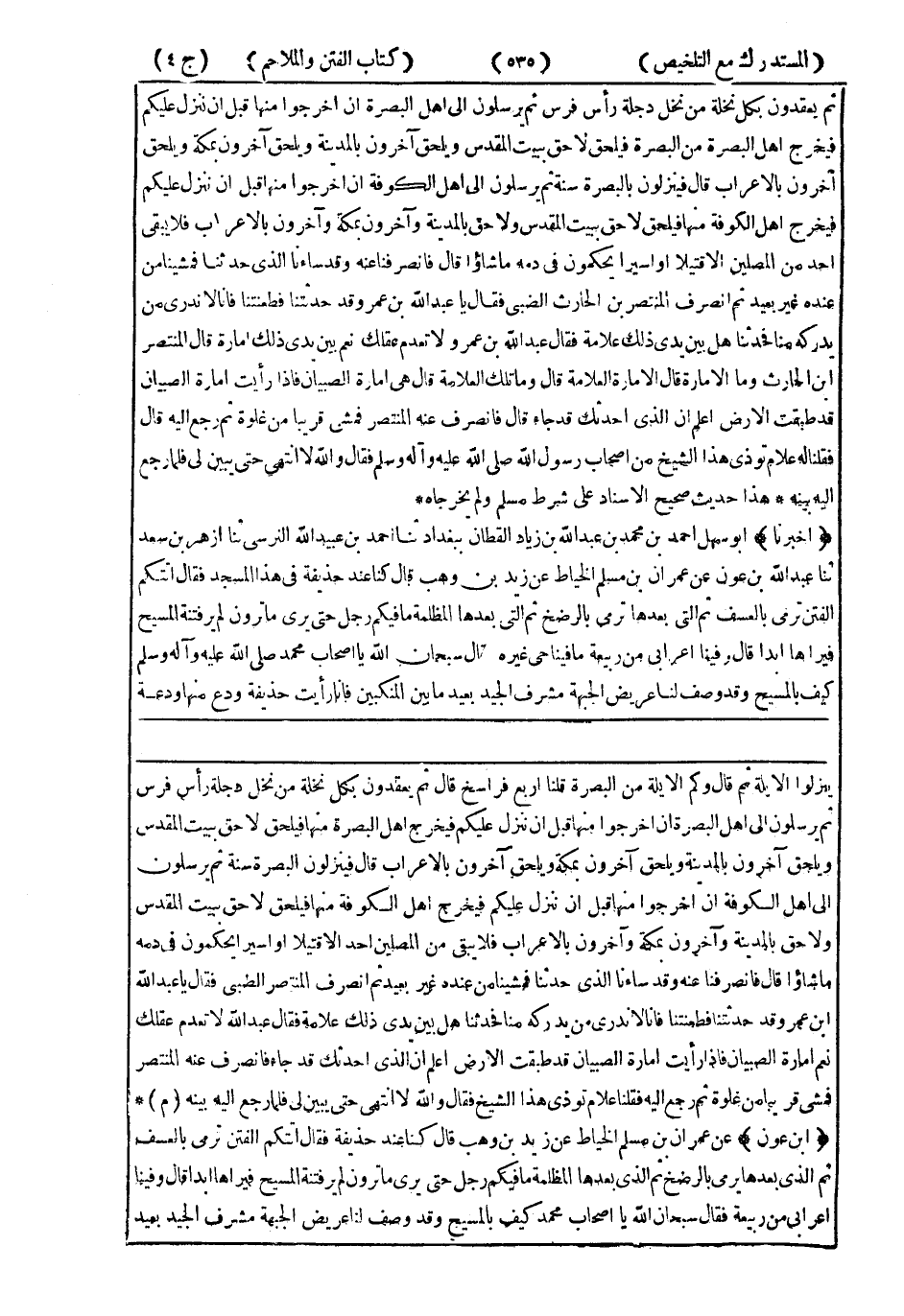 ثُمَّ يَعْقِدُونَ بِكُلِّ نَخْلَةٍ مِنْ نَخْلِ دِجْلَةَ رَأْسَ فَرَسٍ ، ثُمَّ يُرْسِلُونَ إِلَى أَهْلِ الْبَصْرَةِ أَنِ اخْرُجُوا مِنْهَا قَبْلَ أَنْ نَنْزِلَ عَلَيْكُمْ ، فَيَخْرُجُ أَهْلُ الْبَصْرَةِ مِنَ الْبَصْرَةِ ، فَيَلْحَقُ لاَحِقٌ بِبَيْتِ الْمَقْدِسِ ، وَيَلْحَقُ آخَرُونَ بِالْمَدِينَةِ ، وَيُلْحَقُ آخَرُونَ بِمَكَّةَ ، وَيَلْحَقُ آخَرُونَ بِالأَعْرَابِ ، قَالَ : فَيَنْزِلُونَ بِالْبَصْرَةِ سَنَةً ، ثُمَّ يُرْسِلُونَ إِلَى أَهْلِ الْكُوفَةِ أَنِ اخْرُجُوا مِنْهَا قَبْلَ أَنْ نَنْزِلَ عَلَيْكُمْ ، فَيَخْرُجُ أَهْلُ الْكُوفَةِ مِنْهَا فَيَلْحَقُ لاَحِقٌ بِبَيْتِ الْمَقْدِسِ ، وَلاَحِقٌ بِالْمَدِينَةِ ، وَآخَرُونَ بِمَكَّةَ ، وَآخَرُونَ بِالأَعْرَابِ ، فَلاَ يَبْقَى أَحَدٌ مِنَ الْمُصَلِّينَ إِلاَّ قَتِيلاً أَوْ أَسِيرًا يَحْكُمُونَ فِي دَمِهِ مَا شَاءُوا ، قَالَ : فَانْصَرَفْنَا عَنْهُ وَقَدْ سَاءَنَا الَّذِي حَدَّثَنَا ، فَمَشَيْنَا مِنْ عِنْدِهِ غَيْرَ بَعِيدٍ ، ثُمَّ انْصَرَفَ الْمُنْتَصِرُ بْنُ الْحَارِثِ الضَّبِّيُّ ، فَقَالَ : يَا عَبْدَ اللهِ بْنَ عَمْرٍو قَدْ حَدَّثَتْنَا فَطَعَنْتَنَا ، فَإِنَّا لاَ نَدْرِي مَنْ يُدْرِكُهُ مِنَّا ، فَحَدَّثَنَا هَلْ بَيْنَ يَدَيْ ذَلِكَ عَلاَمَةٌ ، فَقَالَ عَبْدُ اللهِ بْنُ عَمْرٍو : لاَ تَعْدَمْ عَقْلَكَ ، نَعَمْ بَيْنَ يَدَيْ ذَلِكَ أَمَارَةٌ ، قَالَ الْمُنْتَصِرُ بْنُ الْحَارِثِ : وَمَا الأَمَارَةُ ؟ قَالَ : الأَمَارَةُ الْعَلاَمَةُ ، قَالَ : وَمَا تِلْكَ الْعَلاَمَةُ ؟ قَالَ : هِيَ إِمَارَةُ الصِّبْيَانِ ، فَإِذَا رَأَيْتَ إِمَارَةَ الصِّبْيَانِ قَدْ طَبَّقَتِ الأَرْضَ اعْلَمْ أَنَّ الَّذِي أُحَدِّثُكَ قَدْ جَاءَ ، قَالَ : فَانْصَرَفَ عَنْهُ الْمُنْتَصِرُ فَمَشَى قَرِيبًا مِنْ غَلْوَةٍ ثُمَّ رَجَعَ إِلَيْهِ ، قَالَ : فَقُلْنَا لَهُ : عَلاَمَ تُؤْذِي هَذَا الشَّيْخَ مِنْ أَصْحَابِ رَسُولِ اللهِ صَلَّى اللَّهُ عَلَيْهِ وَسَلَّمَ ، فَقَالَ : وَاللَّهِ لاَ أَنْتَهِي حَتَّى يُبَيِّنَ لِي فَلَمَّا رَجَعَ إِلَيْهِ بَيَّنَهُ.
