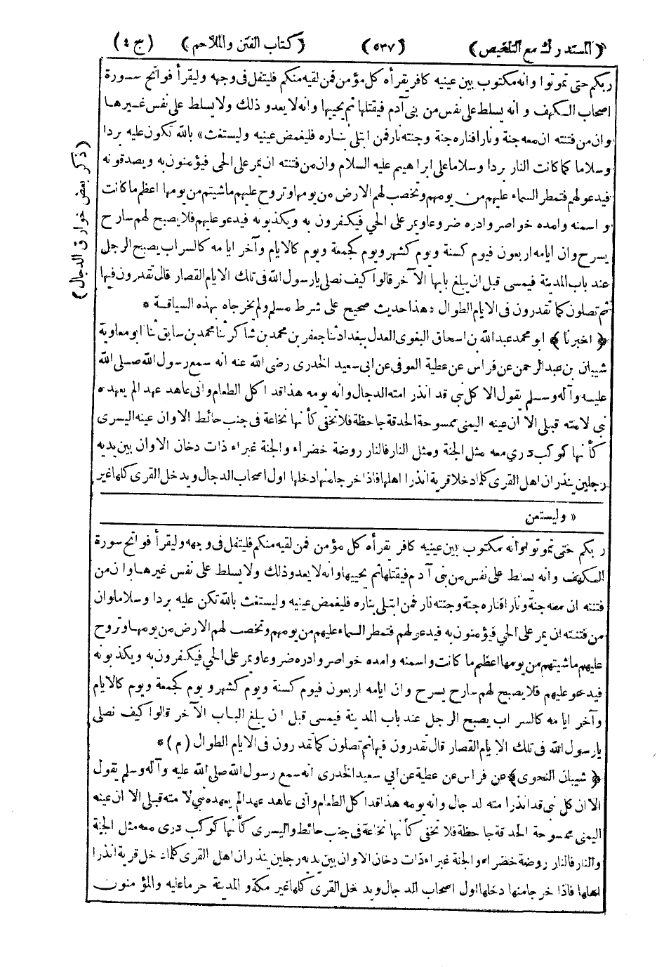 وَإِنَّهُ مَكْتُوبٌ بَيْنَ عَيْنَيْهِ كَافِرٌ يَقْرَأُهُ كُلُّ مُؤْمِنٍ ، فَمَنْ لَقِيَهُ مِنْكُمْ فَلْيَتْفُلْ فِي وَجْهِهِ ، وَلْيَقْرَأْ فَوَاتِحَ سُورَةِ أَصْحَابِ الْكَهْفِ ، وَإِنَّهُ يُسَلَّطُ عَلَى نَفْسٍ مِنْ بَنِي آدَمَ فَيَقْتُلُهَا ، ثُمَّ يُحْيِيهَا ، وَأَنَّهُ لاَ يَعْدُو ذَلِكَ وَلاَ يُسَلَّطُ عَلَى نَفْسٍ غَيْرِهَا ، وَأَنَّ مِنْ فِتْنَتِهِ أَنَّ مَعَهُ جَنَّةً وَنَارًا فَنَارُهُ جَنَّةٌ وَجَنَّتُهُ نَارٌ ، فَمَنِ ابْتُلِيَ بِنَارِهِ فَلْيُغْمِضْ عَيْنَيْهِ وَلْيَسْتَغِثْ بِاللَّهِ تَكُونُ عَلَيْهِ بَرْدًا وَسَلاَمًا كَمَا كَانَتِ النَّارُ بَرْدًا وَسَلاَمًا عَلَى إِبْرَاهِيمَ عَلَيْهِ السَّلاَمُ ، وَأَنَّ مِنْ فِتْنَتِهِ أَنَّ يَمُرَّ عَلَى الْحَيِّ فَيُؤْمِنُونَ بِهِ وَيُصَدِّقُونَهُ فَيَدْعُو لَهُمْ فَتُمْطِرُ السَّمَاءُ عَلَيْهِمْ مِنْ يَوْمِهِمْ وَتُخْصِبُ لَهُمُ الأَرْضُ مِنْ يَوْمِهَا ، وَتَرُوحُ عَلَيْهِمْ مَاشِيَتُهُمْ مِنْ يَوْمِهَا أَعْظَمَ مَا كَانَتْ وَأَسْمَنَهُ وَأَمَدَّهُ خَوَاصِرَ وَأَدَرَّهُ ضُرُوعًا ، وَيَمُرُّ عَلَى الْحَيِّ فَيَكْفُرُونَ بِهِ وَيُكَذِّبُونَهُ فَيَدْعُو عَلَيْهِمْ فَلاَ يُصْبِحُ لَهُمْ سَارِحٌ يَسْرَحُ ، وَأَنَّ أَيَّامَهُ أَرْبَعُونَ فَيَوْمٌ كَسَنَةٍ وَيَوْمٌ كَشَهْرٍ وَيَوْمٌ كَجُمُعَةٍ وَيَوْمٌ كَالأَيَّامِ ، وَآخِرُ أَيَّامِهِ كَالسَّرَابِ ، يُصْبِحُ الرَّجُلُ عِنْدَ بَابِ الْمَدِينَةِ فَيُمْسِي قَبْلَ أَنْ يَبْلُغَ بَابَهَا الآخِرَةَ قَالُوا : كَيْفَ نُصَلِّي يَا رَسُولَ اللهِ فِي تِلْكَ الأَيَّامِ الْقِصَارِ ؟ قَالَ : تَقْدُرُونَ فِيهَا ثُمَّ تُصَلُّونَ كَمَا تَقْدُرُونَ فِي الأَيَّامِ الطِّوَالِ.