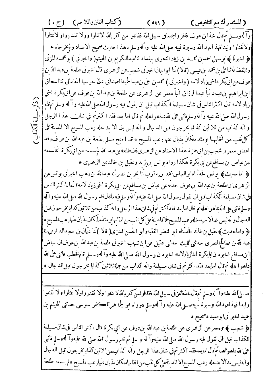 8625- فَحَدَّثْنَاهُ أَبُو الْعَبَّاسِ مُحَمَّدُ بْنُ يَعْقُوبَ ، حَدَّثَنَا بَحْرُ بْنُ نَصْرٍ ، حَدَّثَنَا عَبْدُ اللهِ بْنُ وَهْبٍ ، أَخْبَرَنِي يُونُسُ ، عَنِ الزُّهْرِيِّ ، أَنَّ طَلْحَةَ بْنَ عَبْدِ اللهِ بْنِ عَوْفٍ حَدَّثَهُ ، عَنْ عِيَاضِ بْنِ مُسَافِعٍ ، عَنْ أَبِي بَكْرَةَ ، أَخِي زِيَادٍ لِأُمِّهِ ، قَالَ : لَمَّا أَكْثَرَ النَّاسُ فِي شَأْنِ مُسَيْلِمَةَ الْكَذَّابِ قَبْلَ أَنْ يَقُولَ رَسُولُ اللهِ صَلَّى اللَّهُ عَلَيْهِ وَسَلَّمَ فِيهِ مَا قَالَ ، قَامَ رَسُولُ اللهِ صَلَّى اللَّهُ عَلَيْهِ وَسَلَّمَ فَأَثْنَى عَلَى اللهِ بِمَا هُوَ أَهْلُهُ ثُمَّ قَالَ : أَمَّا بَعْدُ فَقَدْ أَكْثَرْتُمْ فِي شَأْنِ هَذَا الرَّجُلِ ، وَإِنَّهُ كَذَّابٌ مَنْ ثَلاَثِينَ كَذَّابًا يَخْرُجُونَ قَبْلَ الدَّجَّالِ ، وَإِنَّهُ لَيْسَ بَلَدٌ إِلاَّ سَيَدْخُلُهُ رُعْبُ الْمَسِيحِ إِلاَّ الْمَدِينَةَ عَلَى كُلِّ نَقْبٍ مَنْ أَنْقَابِهَا يَوْمَئِذٍ مَلَكَانِ يَذُبَّانِ عَنْهَا رُعْبَ الْمَسِيحِ.