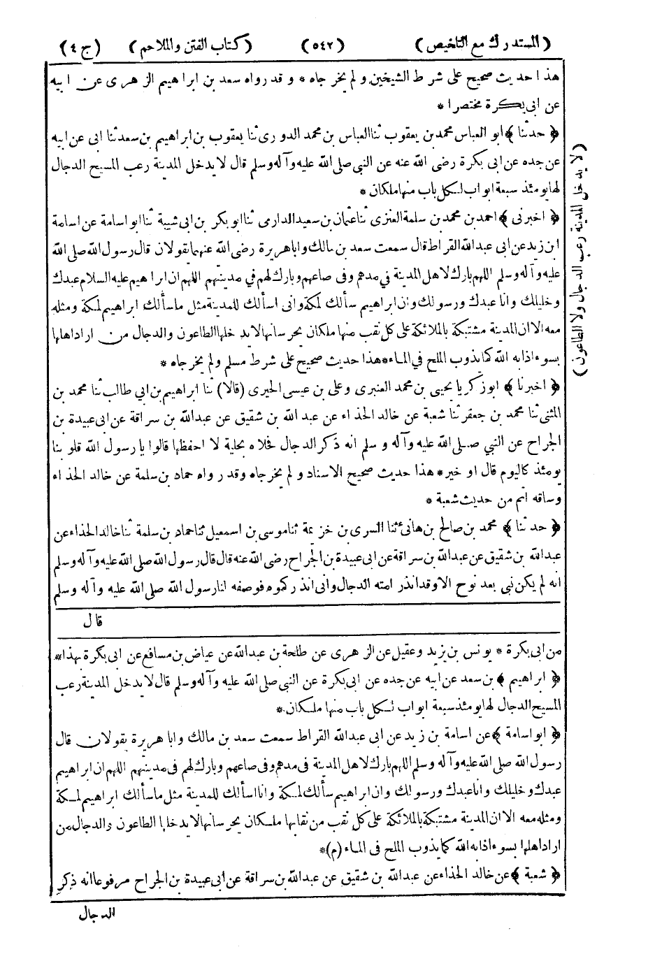 8627- حَدَّثَنَا أَبُو الْعَبَّاسِ مُحَمَّدُ بْنُ يَعْقُوبَ ، حَدَّثَنَا الْعَبَّاسُ بْنُ مُحَمَّدٍ الدُّورِيُّ ، حَدَّثَنَا يَعْقُوبُ بْنُ إِبْرَاهِيمَ بْنِ سَعْدٍ ، حَدَّثَنَا أَبِي ، عَنْ أَبِيهِ ، عَنْ جَدِّهِ ، عَنْ أَبِي بَكْرَةَ رَضِيَ اللَّهُ عَنْهُ ، عَنِ النَّبِيِّ صَلَّى اللَّهُ عَلَيْهِ وَسَلَّمَ ، قَالَ : لاَ يَدْخُلُ الْمَدِينَةَ رُعْبُ الْمَسِيحِ الدَّجَّالِ ، لَهَا يَوْمَئِذٍ سَبْعَةُ أَبْوَابٍ لِكُلِّ بَابٍ مَنْهَا مَلَكَانِ.