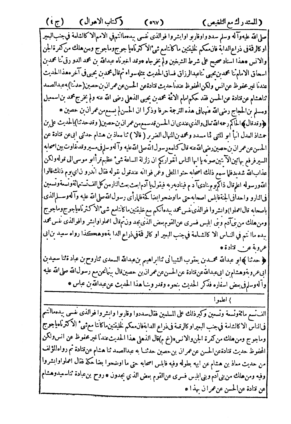 8695- وَقَدْ حَدَّثَنَا بِالْحَدِيثِ عَلِيُّ بْنُ حَمْشَاذَ الْعَدْلُ ، أَنْبَأَ أَبُو الْمُثَنَّى ، حَدَّثَنَا مُسَدَّدٌ ، وَمُحَمَّدُ بْنُ الْمِنْهَالِ الضَّرِيرُ ، قَالاَ : حَدَّثَنَا مُعَاذُ بْنُ هِشَامٍ ، حَدَّثَنِي أَبِي ، عَنْ قَتَادَةَ ، عَنِ الْحَسَنِ ، عَنْ عِمْرَانَ بْنِ حُصَيْنٍ رَضِيَ اللَّهُ عَنْهُ ، قَالَ : كُنَّا مَعَ رَسُولِ اللهِ صَلَّى اللَّهُ عَلَيْهِ وَسَلَّمَ فِي مَسِيرٍ وَقَدْ تَفَاوَتَ بَيْنَ أَصْحَابِهِ السَّيْرُ فَرَفَعَ بِهَاتَيْنِ الآيَتَيْنِ صَوْتَهُ : {يَا أَيُّهَا النَّاسُ اتَّقُوا رَبَّكُمْ إِنَّ زَلْزَلَةَ السَّاعَةِ شَيْءٌ عَظِيمٌ} قَرَأَ أَبُو مُوسَى إِلَى قَوْلِهِ : {وَلَكِنَّ عَذَابَ اللهِ شَدِيدٌ} فَلَمَّا سَمِعَ ذَلِكَ أَصْحَابُهُ حَثُّوا الْمَطِيَّ ، وَعَرَفُوا أَنَّهُ عِنْدَ قَوْلٍ يَقُولُهُ فَقَالَ : أَتَدْرُونَ أَيُّ يَوْمٍ ذَلِكَ ؟ قَالُوا : اللَّهُ وَرَسُولُهُ أَعْلَمُ ، قَالَ : ذَاكُمْ يَوْمَ يُنَادِي آدَمُ فَيُنَادِيهِ رَبُّهُ فَيَقُولُ : يَا آدَمُ ابْعَثْ بَعْثَ النَّارِ مِنْ كُلِّ أَلْفٍ تِسْعَمِائَةٍ وَتِسْعَةً وَتِسْعِينَ فِي النَّارِ وَوَاحِدًا فِي الْجَنَّةِ ، فَأَبْلَسَ أَصْحَابُهُ حَتَّى مَا أَوْضَحُوا بِضَاحِكَةٍ ، فَلَمَّا رَأَى رَسُولُ اللهِ صَلَّى اللَّهُ عَلَيْهِ وَسَلَّمَ الَّذِي بِأَصْحَابِهِ ، قَالَ : اعْمَلُوا وَأَبْشِرُوا ، فَوَالَّذِي نَفْسُ مُحَمَّدٍ بِيَدِهِ إِنَّكُمْ مَعَ خَلِيقَتَيْنِ مَا كَانَتَا مَعَ شَيْءٍ إِلاَّ كَثَّرَتَاهُ يَأْجُوجُ وَمَأْجُوجُ ، وَمَنْ هَلَكَ مَنْ بَنِي آدَمَ وَبَنِي إِبْلِيسَ فَسُرِّيَ عَنِ الْقَوْمِ بَعْضُ الَّذِي يَجِدُونَ ، ثُمَّ قَالَ : اعْمَلُوا وَأَبْشِرُوا فَوَالَّذِي نَفْسُ مُحَمَّدٍ بِيَدِهِ مَا أَنْتُمْ فِي النَّاسِ إِلاَّ كَالشَّامَةِ فِي جَنْبٍ الْبَعِيرِ ، أَوْ كَالرَّقْمَةِ فِي ذِرَاعِ الدَّابَّةِ.