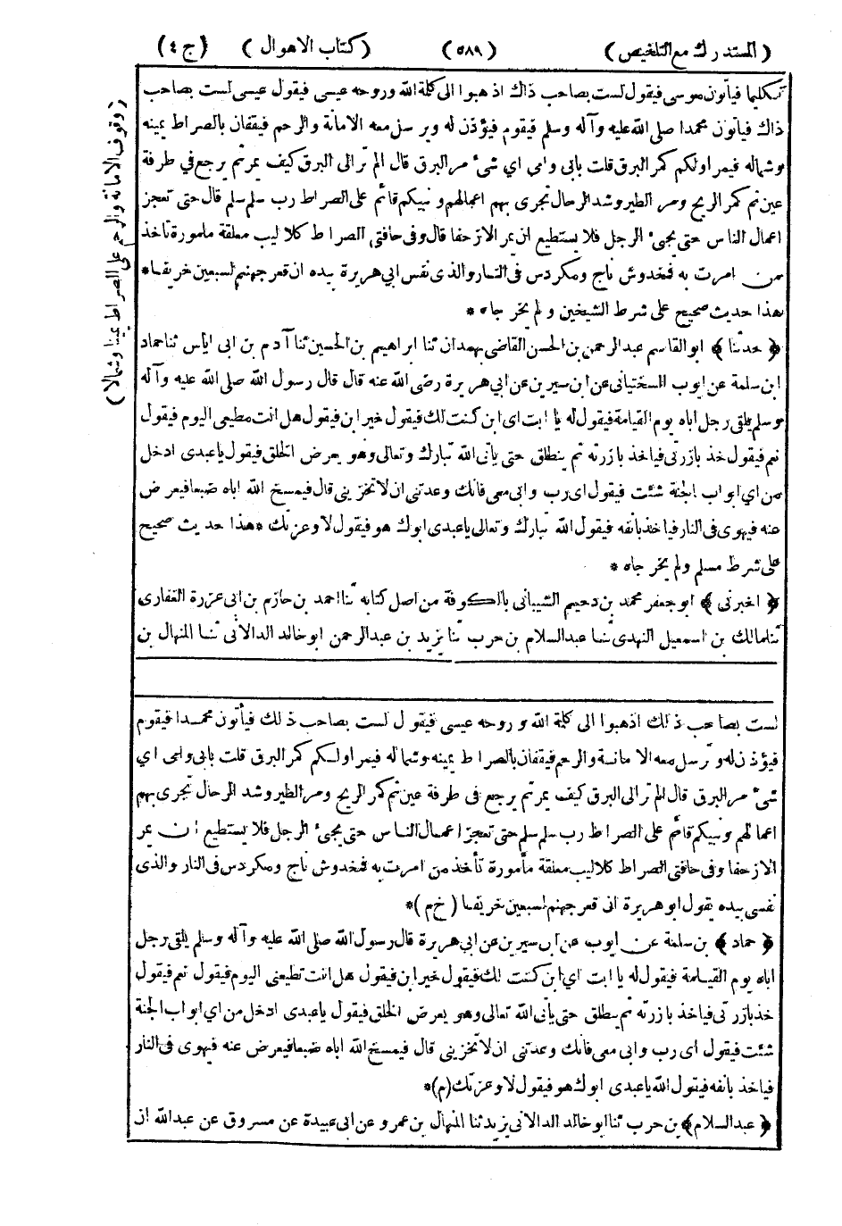 8751- أَخْبَرَنِي أَبُو جَعْفَرٍ مُحَمَّدُ بْنُ دُحَيْمٍ الشَّيْبَانِيُّ بِالْكُوفَةِ مِنْ أَصْلِ كِتَابِهِ ، حَدَّثَنَا أَحْمَدُ بْنُ حَازِمِ بْنِ أَبِي غَرَزَةَ الْغِفَارِيُّ ، حَدَّثَنَا مَالِكُ بْنُ إِسْمَاعِيلَ النَّهْدِيُّ ، حَدَّثَنَا عَبْدُ السَّلاَمِ بْنُ حَرْبٍ ، حَدَّثَنَا يَزِيدُ بْنُ عَبْدِ الرَّحْمَنِ أَبُو خَالِدٍ الدَّالاَنِيُّ ، حَدَّثَنَا الْمِنْهَالُ بْنُ عَمْرٍو ، عَنْ أَبِي عُبَيْدَةَ ، عَنْ مَسْرُوقٍ ، عَنْ عَبْدِ اللهِ بْنِ مَسْعُودٍ رَضِيَ اللَّهُ عَنْهُ ، أَنَّ رَسُولَ اللهِ صَلَّى اللَّهُ عَلَيْهِ وَسَلَّمَ ، قَالَ :