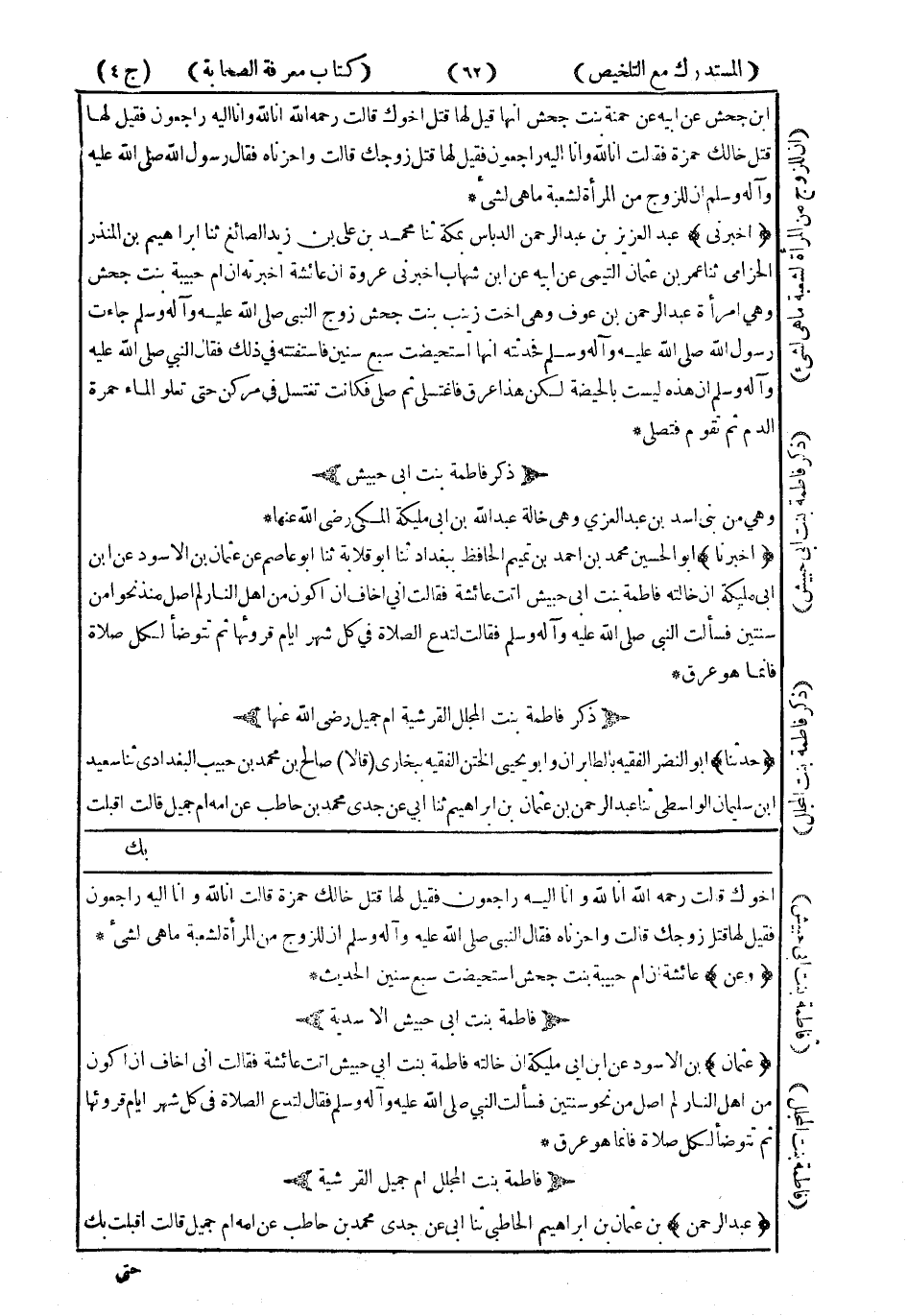 ذِكْرُ فَاطِمَةَ بِنْتِ أَبِي حُبَيْشٍ وَهِيَ مِنْ بَنِي أَسَدِ بْنِ عَبْدِ الْعُزَّى ، وَهِيَ خَالَةُ عَبْدِ اللهِ بْنِ أَبِي مُلَيْكَةَ الْمَكِّيِّ رَضِيَ اللَّهُ عَنْهَا.