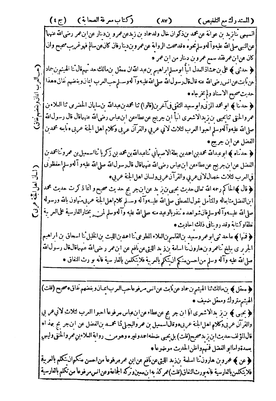 قَالَ الْحَاكِمُ رَحِمَهُ اللَّهُ تَعَالَى : حَدِيثُ يَحْيَى بْنِ يَزِيدَ ، عَنِ ابْنِ جُرَيْجٍ حَدِيثٌ صَحِيحٌ ، وَإِنَّمَا ذَكَرْتُ حَدِيثَ مُحَمَّدِ بْنِ الْفَضْلِ مُتَابِعًا لَهُ ، وَالْمُتَأَمِّلُ بِقَوْلِ الْمُصْطَفَى صَلَّى اللَّهُ عَلَيْهِ وَسَلَّمَ كَلاَمَ أَهْلِ الْجَنَّةِ عَرَبِيُّ مُتَهَاوِنٌ بِاللَّهِ وَرَسُولِهِ صَلَّى اللَّهُ عَلَيْهِ وَسَلَّمَ فَإِنَّ شَوَاهِدَهُ تُنْذِرُ بِالْوَعِيدِ مِنْهُ صَلَّى اللَّهُ عَلَيْهِ وَسَلَّمَ لِمَنْ يخْتَارُ الْفَارِسِيَّةَ عَلَى الْعَرَبِيَّةِ نُطْقًا وَكِتَابَةً ، وَقَدْ رُوِّينَا فِي ذَلِكَ أَحَادِيثَ فَمِنْهَا.