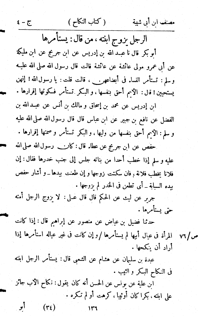 16220- حَدَّثَنَا جَرِيرٌ , عَنْ لَيْثٍ , عَنِ الْحَكَمِ ، قَالَ : قَالَ عَلِيٌّ لاَ يُزَوِّجُ الرَّجُلُ ابنته حَتَّى يَسْتَأْمِرَهَا.