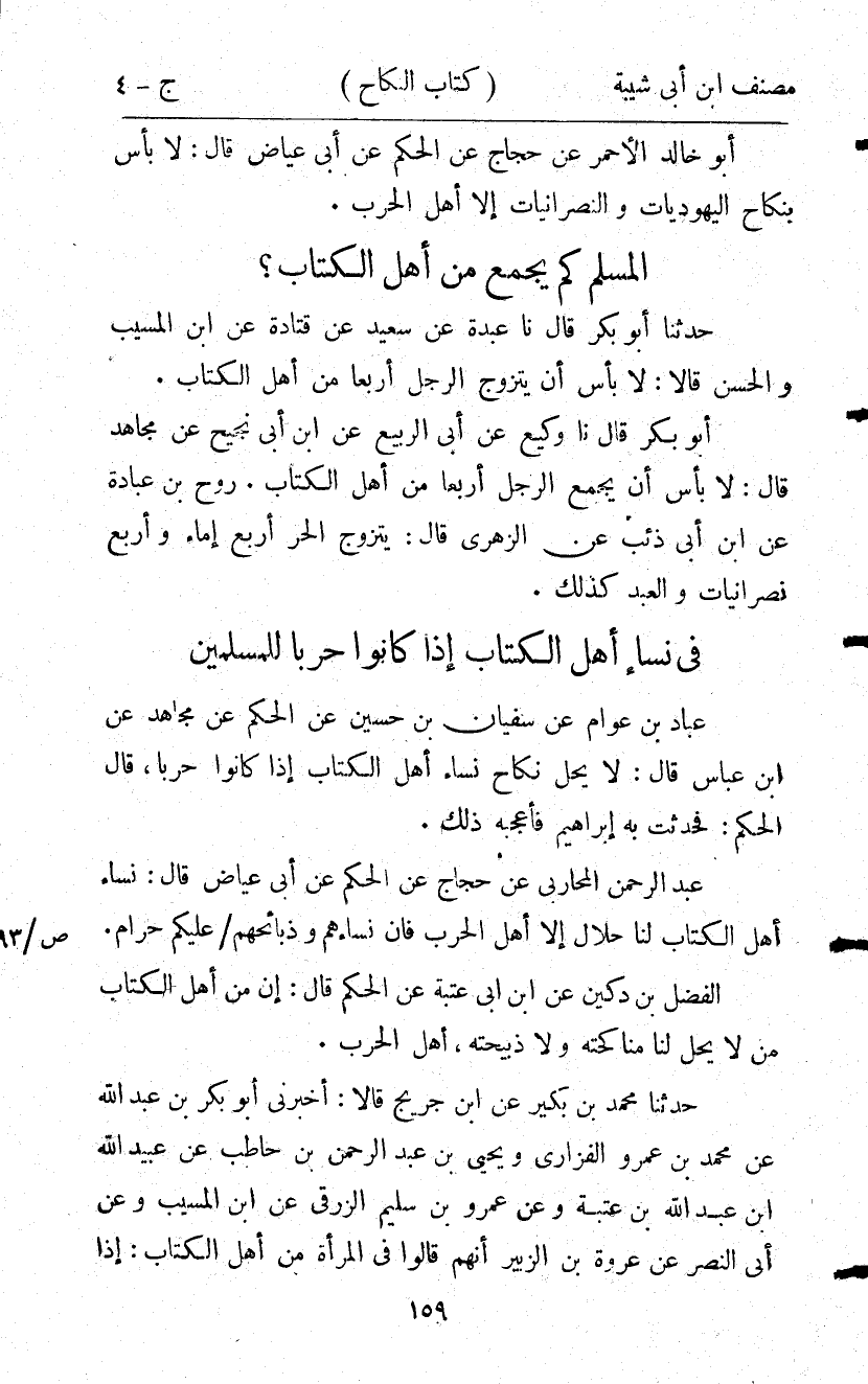 16428- حدَّثَنَا عَبدَة , عَنْ سَعِيدٍ , عَنْ قَتَادَةَ , عَنِ ابْنِ الْمُسَيَّبِ ، وَالْحَسَنِ قَالاَ : لاَ بَأْسَ أَنْ يَتَزَوَّجَ الرَّجُلُ أَرْبَعًا مِنْ أَهْلِ الْكِتَابِ.