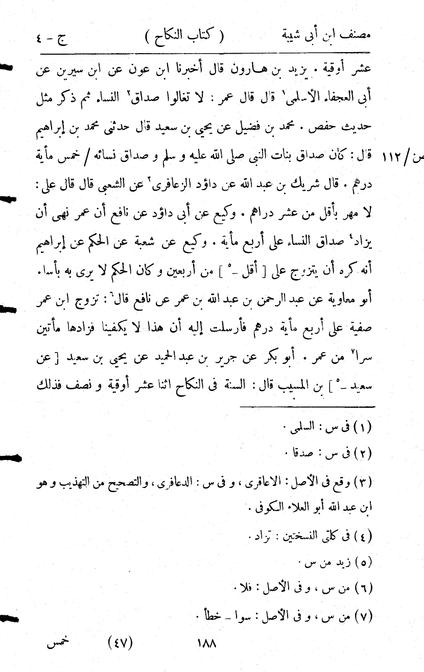 16632- حَدَّثَنَا وَكِيع بن الجراح , عَنِ ابن أَبِي رَوَّادٍ , عَنْ نَافِعٍ , أَنَّ عُمَرَ نَهَى أَنْ يُزَادَ النِّسَاء عَلَى أَرْبَعِ مِئَةٍ.